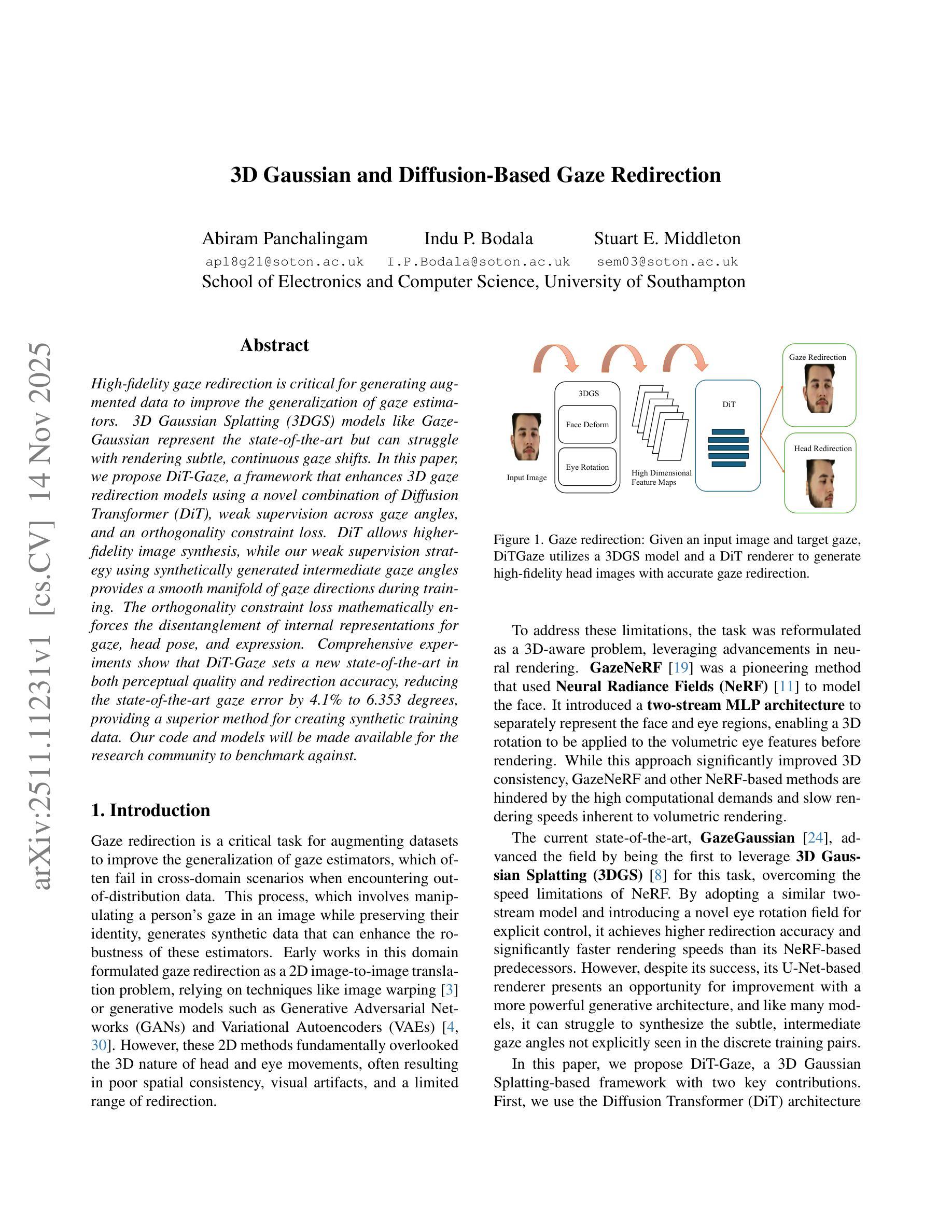 高保真度的视线重定向对于生成扩充数据以提高视线估计器的泛化能力至关重要。虽然像GazeGaussian这样的3D高斯拼贴(3DGS)模型代表了最先进的技术,但在呈现细微、连续的视线转移时可能会遇到困难。在本文中,我们提出了DiT-Gaze框架,它通过结合扩散转换器(DiT)、视线角度的弱监督以及正交性约束损失,增强了3D视线重定向模型。DiT能够实现更高保真度的图像合成,而我们使用合成中间视线角度的弱监督策略在训练过程中提供了平滑的视线方向流形。正交性约束损失从数学上强制实现视线、头部姿势和表情内部表示的去耦合。综合实验表明,DiT-Gaze在感知质量和重定向准确性方面均达到了最新技术水平,将现有技术的视线误差降低了4.1%,达到6.353度,为创建合成训练数据提供了卓越的方法。我们的代码和模型将提供给研究界作为基准测试。