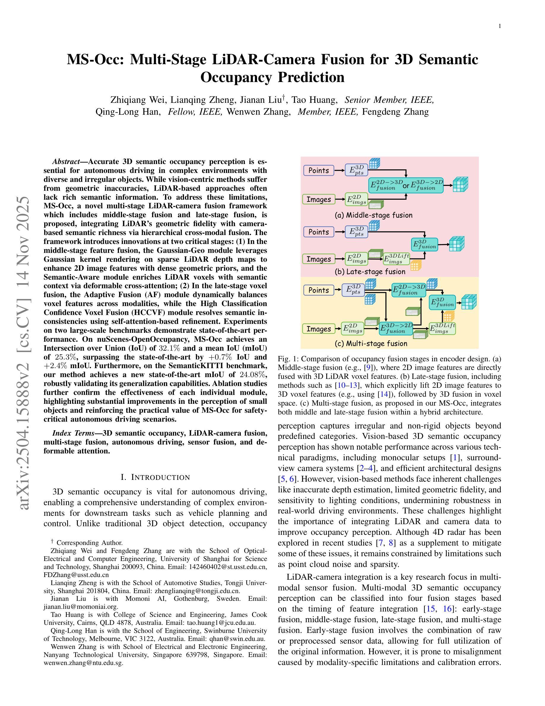 Accurate 3D semantic occupancy perception is essential for autonomous driving in complex environments with diverse and irregular objects. While vision-centric methods suffer from geometric inaccuracies, LiDAR-based approaches often lack rich semantic information. To address these limitations, MS-Occ, a novel multi-stage LiDAR-camera fusion framework which includes middle-stage fusion and late-stage fusion, is proposed, integrating LiDAR’s geometric fidelity with camera-based semantic richness via hierarchical cross-modal fusion. The framework introduces innovations at two critical stages: (1) In the middle-stage feature fusion, the Gaussian-Geo module leverages Gaussian kernel rendering on sparse LiDAR depth maps to enhance 2D image features with dense geometric priors, and the Semantic-Aware module enriches LiDAR voxels with semantic context via deformable cross-attention; (2) In the late-stage voxel fusion, the Adaptive Fusion (AF) module dynamically balances voxel features across modalities, while the High Classification Confidence Voxel Fusion (HCCVF) module resolves semantic inconsistencies using self-attention-based refinement. Experiments on two large-scale benchmarks demonstrate state-of-the-art performance. On nuScenes-OpenOccupancy, MS-Occ achieves an Intersection over Union (IoU) of 32.1% and a mean IoU (mIoU) of 25.3%, surpassing the state-of-the-art by +0.7% IoU and +2.4% mIoU. Furthermore, on the SemanticKITTI benchmark, our method achieves a new state-of-the-art mIoU of 24.08%, robustly validating its generalization capabilities.Ablation studies further confirm the effectiveness of each individual module, highlighting substantial improvements in the perception of small objects and reinforcing the practical value of MS-Occ for safety-critical autonomous driving scenarios.