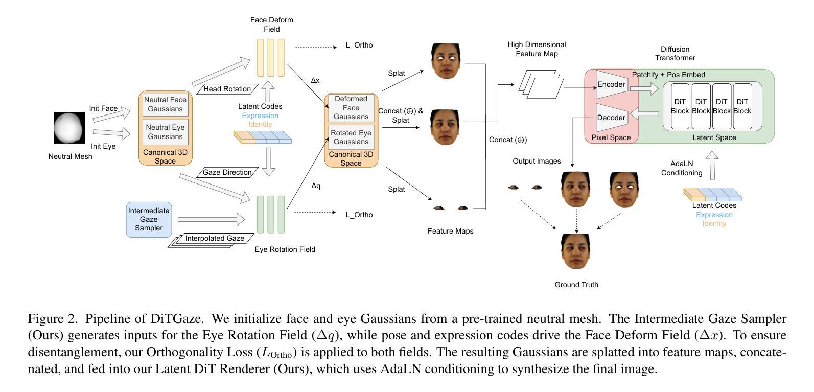 - DiT-Gaze框架结合了Diffusion Transformer(DiT)、不同视线角度的弱监督策略和正交约束损失,增强了3D视线重定向模型。