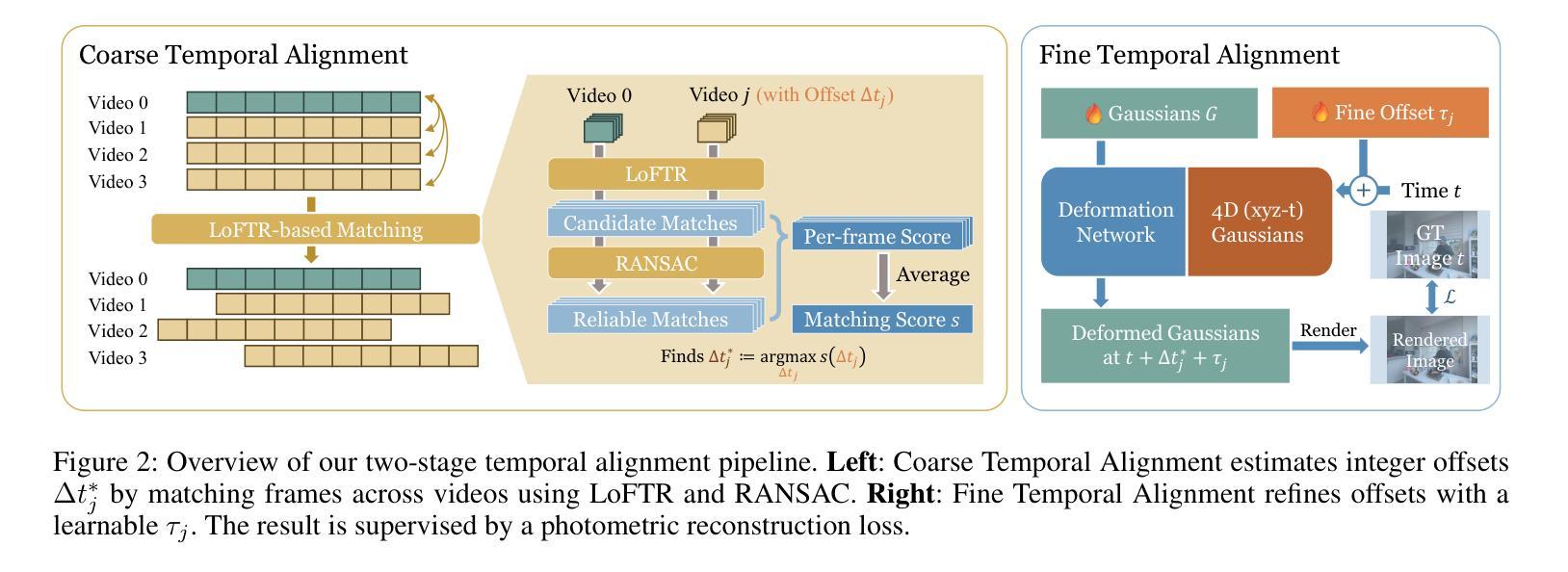 针对多视角视频重建中常见的时间同步问题,提出了一种新颖的时空对齐策略。该方法采用粗到细的对齐模块,估计并补偿每个相机的时间偏移,先确定帧级别的粗略偏移,再精细调整至子帧级别。此方法可集成到现有的4DGS框架中,增强处理异步数据的稳健性,有效处理时间错位视频,并显著提高基线方法的性能。