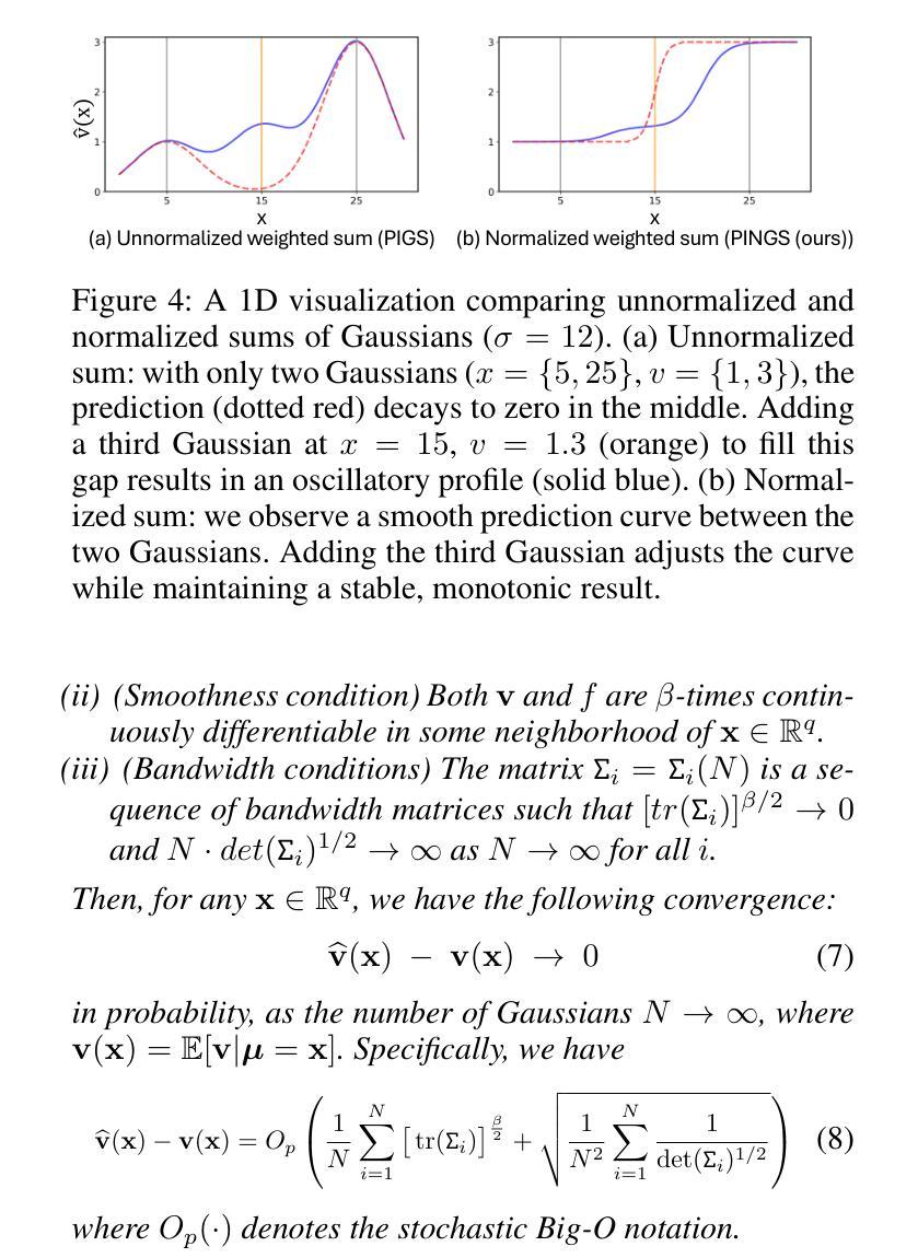 四维流磁共振成像(MRI)是一种可靠的非侵入性方法,用于估计血流速度,对心血管诊断至关重要。与传统的专注于解剖结构的MRI不同,四维流MRI需要较高的时空分辨率,以早期检测关键条件,如狭窄或动脉瘤。然而,实现这种分辨率通常会导致扫描时间延长,需要在采集速度和预测精度之间进行权衡。最近的研究已经利用物理信息神经网络(PINNs)进行MRI数据的超分辨率处理,但它们的实际应用受到限制,因为每个患者的训练过程都极其缓慢。为了克服这一局限性,我们提出了PINGS-X,这是一个新型框架,利用轴对齐的时空高斯表示对高分辨率流速进行建模。PINGS-X受到三维高斯拼贴(3DGS)在新型视图合成中的有效性的启发,通过几个非平凡的新创新扩展了这一理念:一、归一化的高斯拼贴具有正式的收敛保证;二、轴对齐的高斯简化了高维数据的训练过程,同时保持了准确性和收敛保证;三、高斯合并程序可以防止退化解决方案并提高计算效率。在计算流体动力学(CFD)和真实四维流MRI数据集上的实验结果表明,PINGS-X在大大减少训练时间的同时,实现了更高的超分辨率精度。我们的代码和数据集可在https://github.com/SpatialAILab/PINGS-X获取。