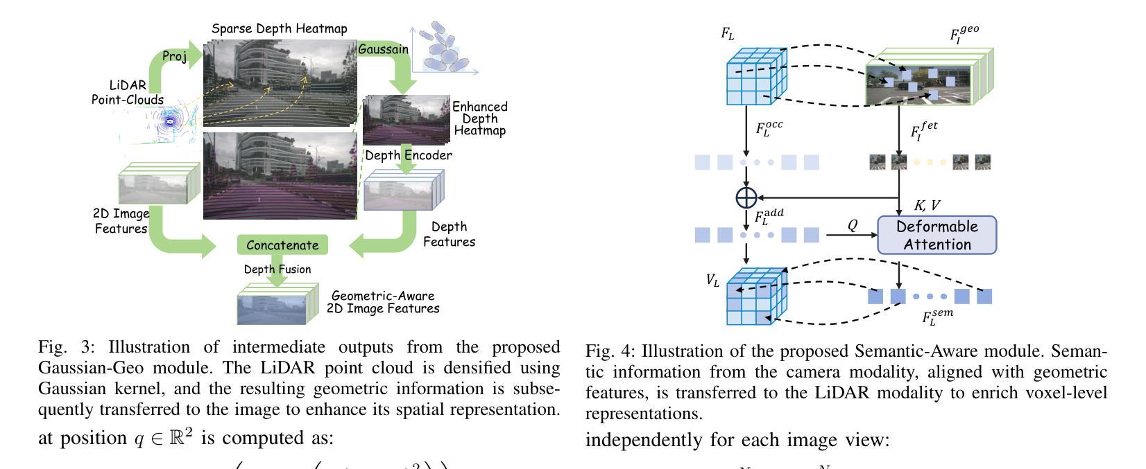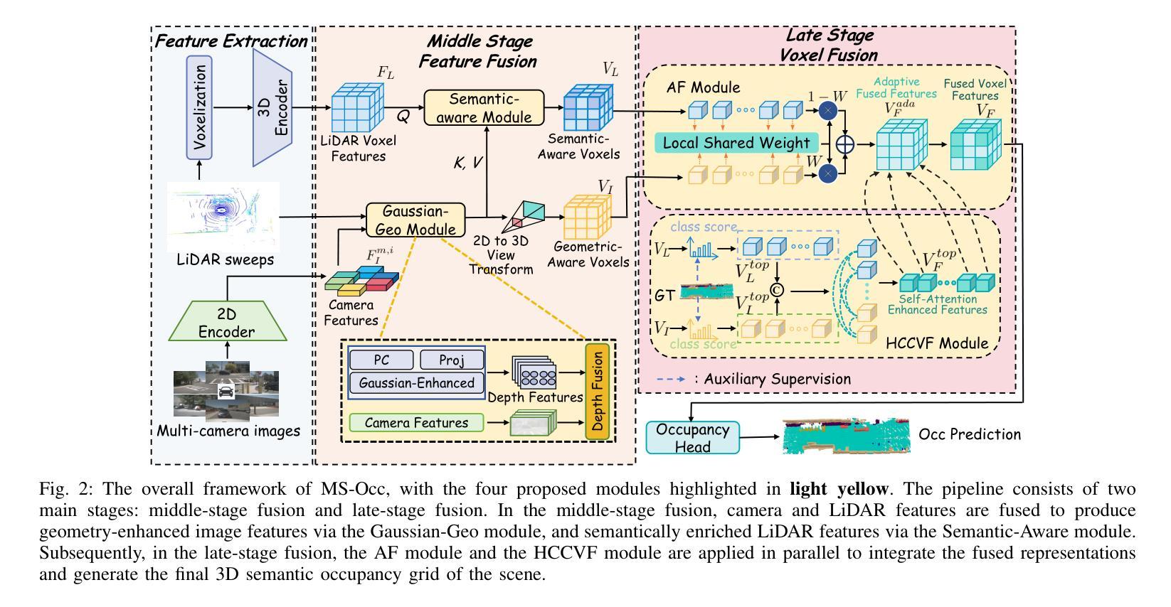 精确的3D语义占用感知对于在具有多样性和不规则物体的复杂环境中进行自动驾驶至关重要。以视觉为中心的方法存在几何不准确的缺陷,而基于激光雷达的方法常常缺乏丰富的语义信息。为了解决这些局限性,提出了一种新的多阶段激光雷达-相机融合框架MS-Occ,包括中间阶段融合和后期阶段融合,通过分层跨模态融合,将激光雷达的几何保真度与基于相机的语义丰富性相结合。该框架在两个关键阶段引入了创新:(1)在中间阶段特征融合中,Gaussian-Geo模块利用稀疏激光雷达深度图的Gaussian核渲染来增强2D图像特征中的密集几何先验,Semantic-Aware模块通过可变形交叉注意力丰富激光雷达体素中的语义上下文;(2)在后期阶段体素融合中,Adaptive Fusion(AF)模块动态平衡跨模态的体素特征,而High Classification Confidence Voxel Fusion(HCCVF)模块则使用基于自注意力的细化解决语义不一致问题。在两项大规模基准测试上的实验证明了其卓越性能。在nuScenes-OpenOccupancy上,MS-Occ的交集比(IoU)达到32.1%,平均交集比(mIoU)为25.3%,相较于当前最佳水平提高了+0.7%的IoU和+2.4%的mIoU。此外,在SemanticKITTI基准测试中,我们的方法达到了全新的mIoU最高纪录,达到24.08%,从而稳健地验证了其泛化能力。消融研究进一步证实了各个模块的效用,突出其在感知小物体方面的重大改进,并强化了MS-Occ在现实安全关键的自动驾驶场景中的实用价值。