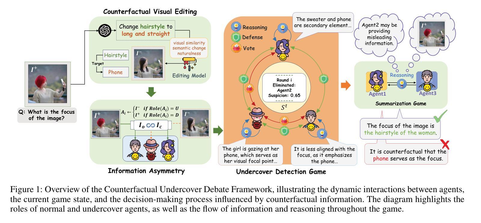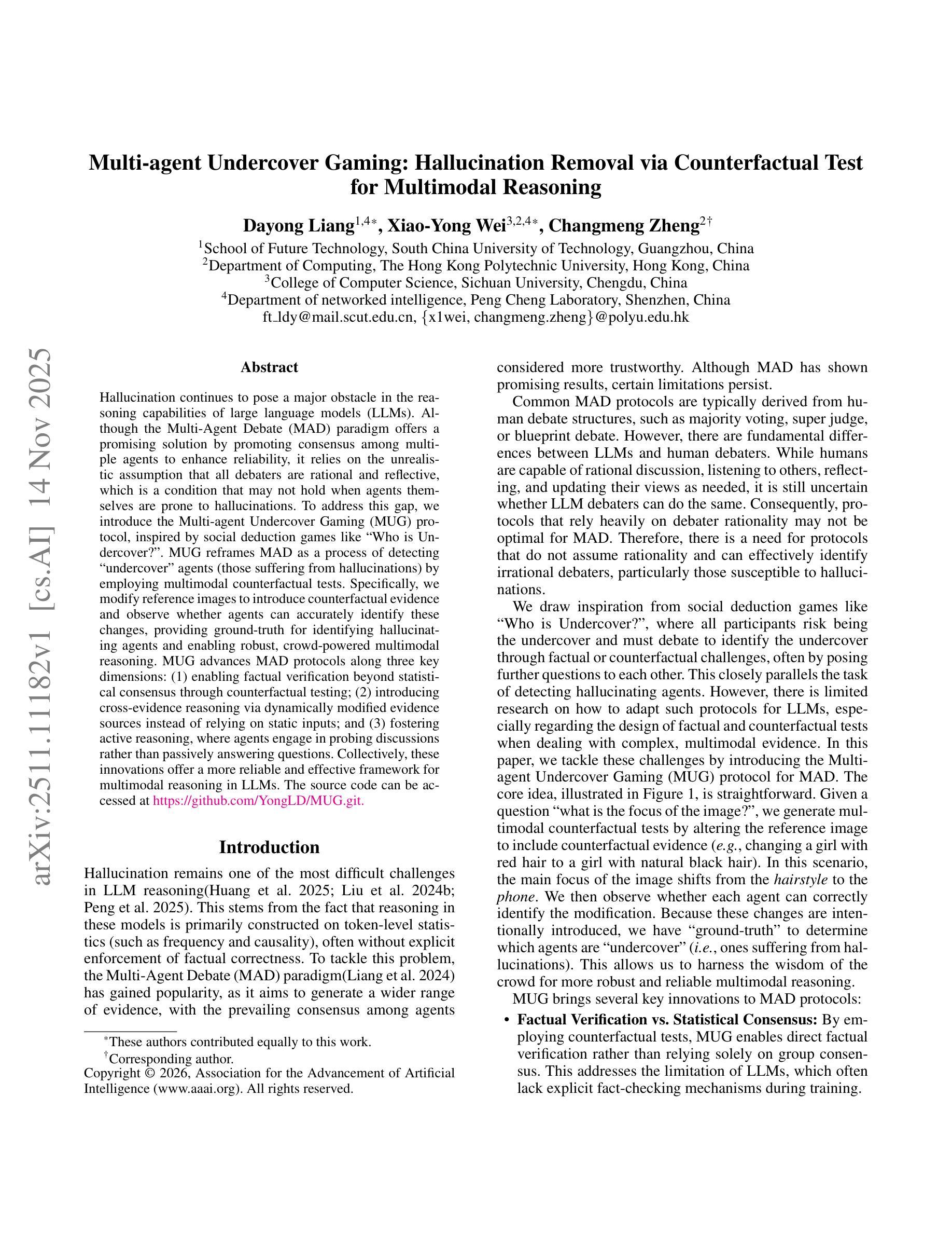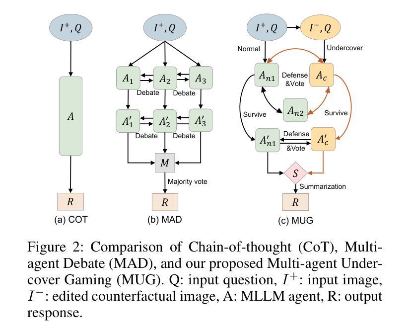 大型语言模型(LLM)中的推理能力主要面临幻觉这一难题。虽然多智能体辩论(MAD)范式通过促进多个智能体之间的共识增强可靠性,为解决此问题提供了希望,但它依赖于所有辩论者都是理性和反思的这一不切实际的假设。为解决这一差距,我们受“谁是卧底?”等社会推理游戏的启发,提出了多智能体卧底游戏(MUG)协议。MUG将MAD重构为检测“卧底”智能体(即那些出现幻觉的智能体)的过程,采用多模式反事实测试。通过修改参考图像来引入反事实证据,观察智能体是否能准确识别这些变化,为识别出现幻觉的智能体提供真实依据,从而实现健壮的、众源多模式推理。MUG在三个方面推进了MAD协议:1)通过反事实测试实现事实验证,超越统计共识;2)通过动态修改证据来源引入交叉证据推理,而不是依赖静态输入;3)培养主动推理,智能体进行探究讨论,而不是被动回答问题。这些创新为LLM中的多模式推理提供了更可靠和有效的框架。