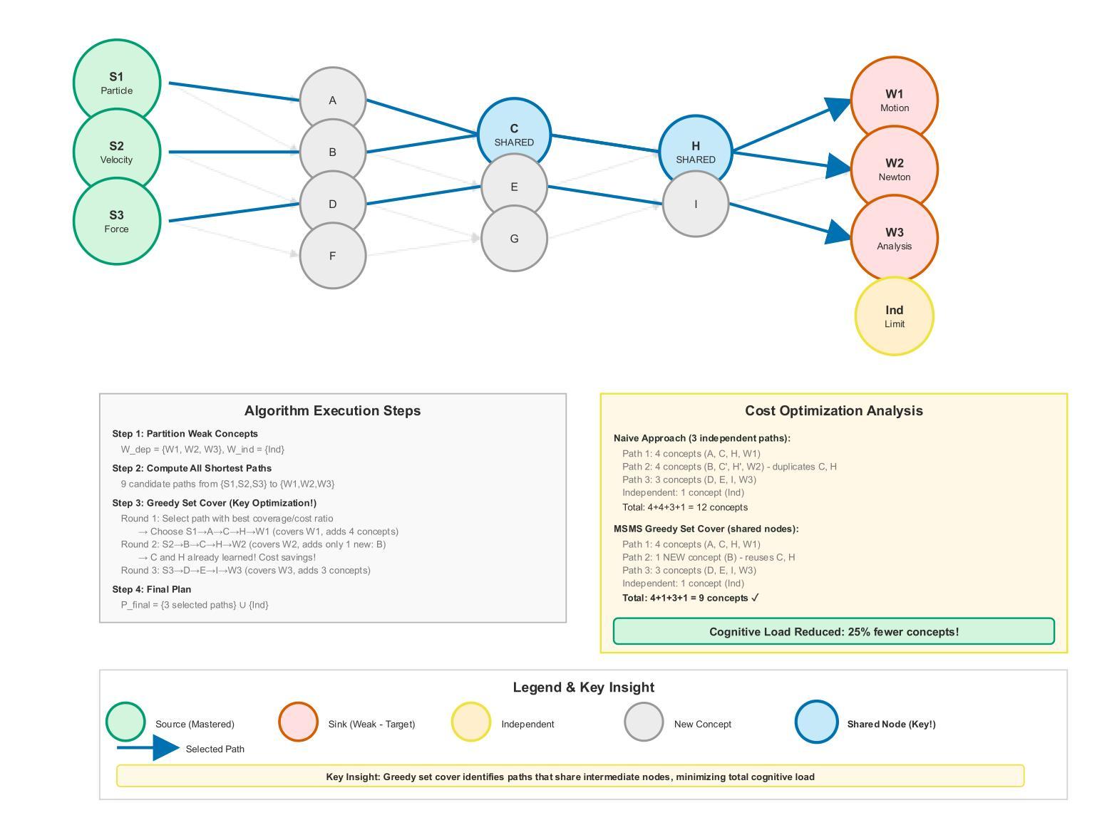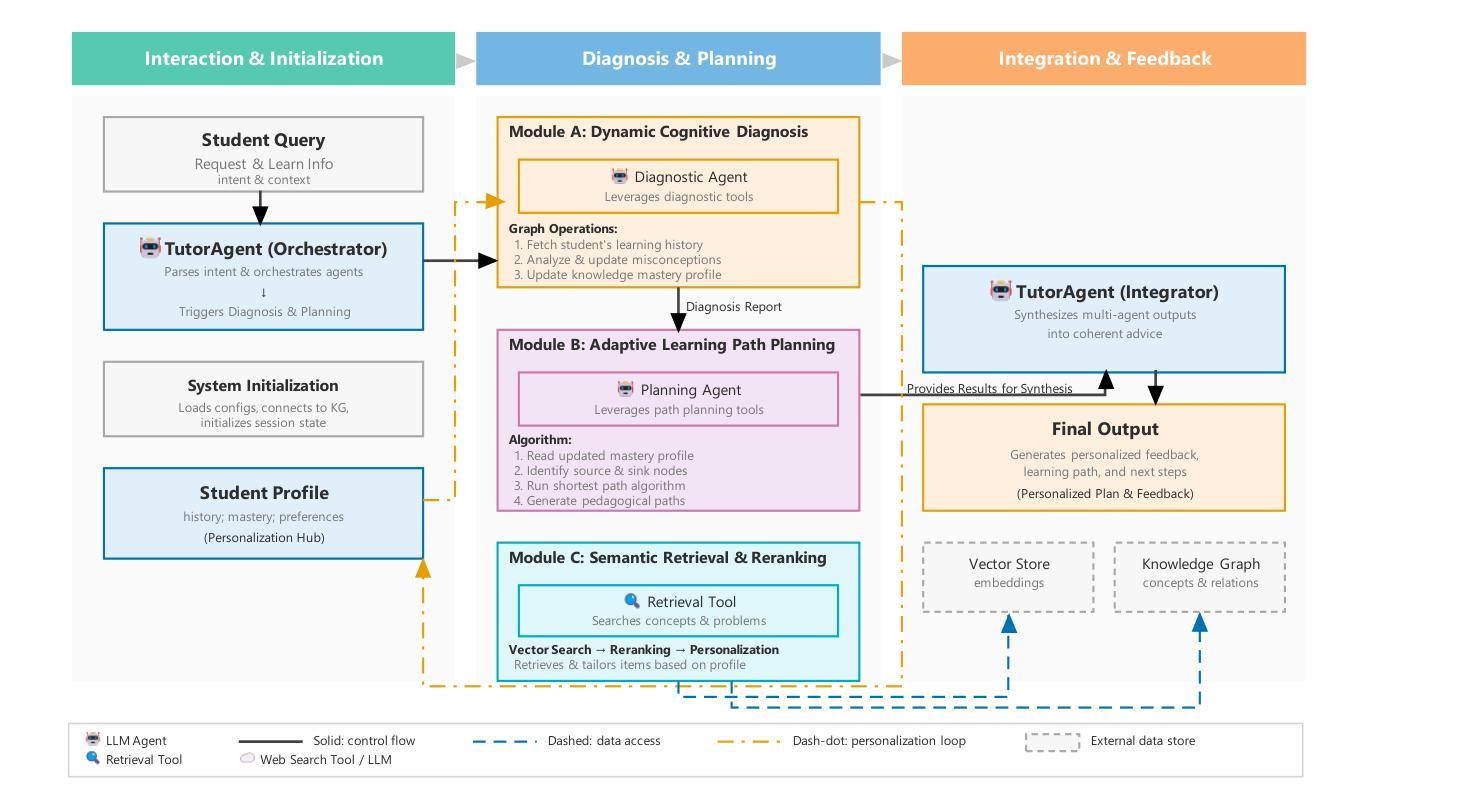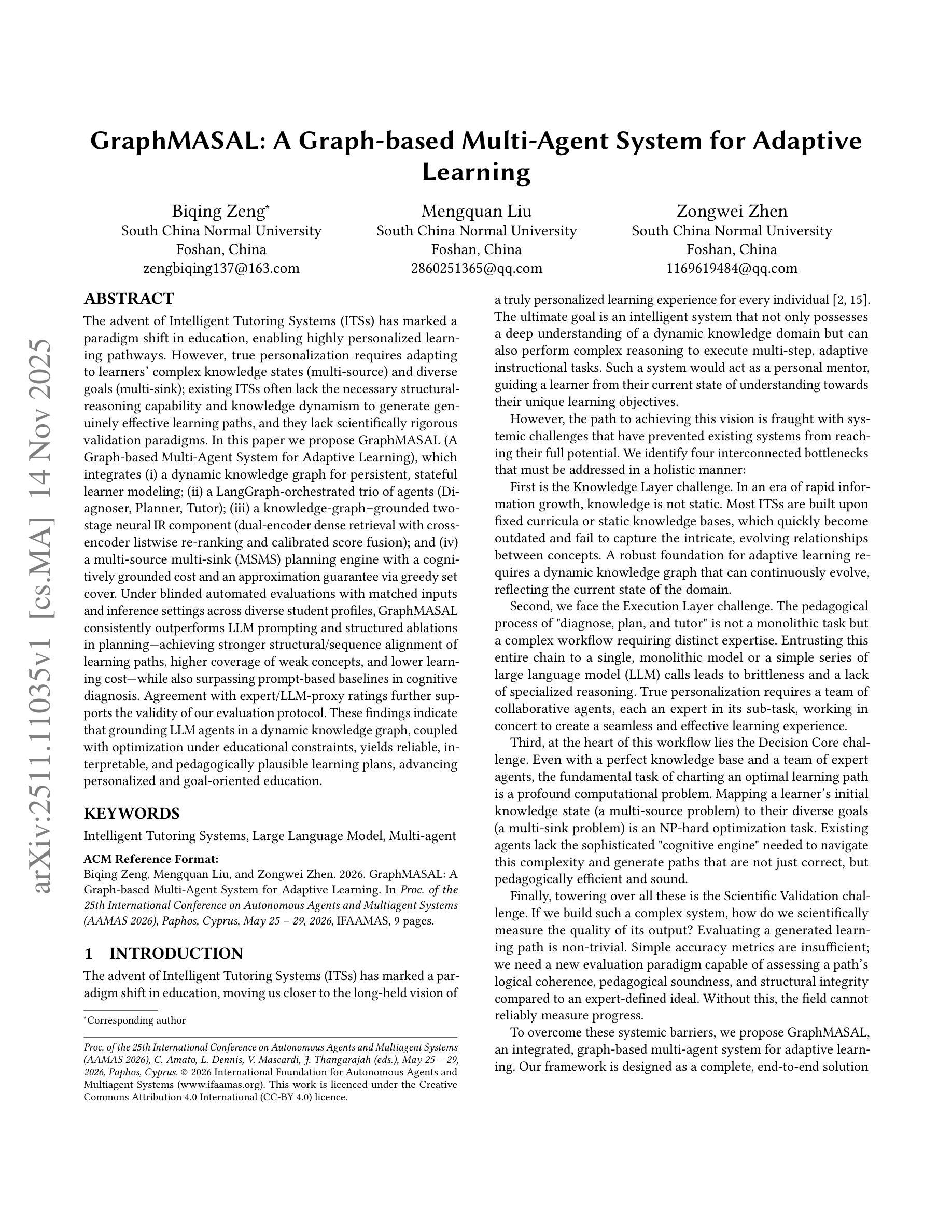 智能辅导系统(ITS)的出现标志着教育领域的范式转变,为个性化学习路径的开启提供了可能。然而,真正的个性化需要适应学习者的复杂知识状态(多源)和多样化的目标(多汇);现有的ITS通常缺乏必要的结构化推理能力和知识动态性,无法生成真正有效的学习路径,也缺乏科学严谨的验证范式。在本文中,我们提出了GraphMASAL(基于图的多智能体自适应学习系统),它集成了(i)动态知识图,用于持久、有状态的学习者建模;(ii)由LangGraph协调的三个智能体(诊断专家、规划者、辅导员);(iii)基于知识图的两个阶段神经IR组件(双编码器密集检索,跨编码器列表级重新排名和校准分数融合);以及(iv)多源多汇(MSMS)规划引擎,具有认知基础的成本和通过贪心集合覆盖的近似保证。在多样化的学生配置文件匹配输入和推理设置的盲自动评估下,GraphMASAL在规划方面始终优于大型语言模型的提示和结构化消解,实现了更强的学习路径结构/序列对齐、更高的弱概念覆盖率、更低的学习成本——同时也在认知诊断上超越了基于提示的基线。与专家/大型语言模型代理评分的协议进一步支持了我们评估协议的有效性。这些结果表明,将大型语言模型智能体建立在动态知识图上,并在教育约束下进行优化,可以产生可靠、可解释、符合教学法的学习计划,推动个性化和目标导向的教育发展。