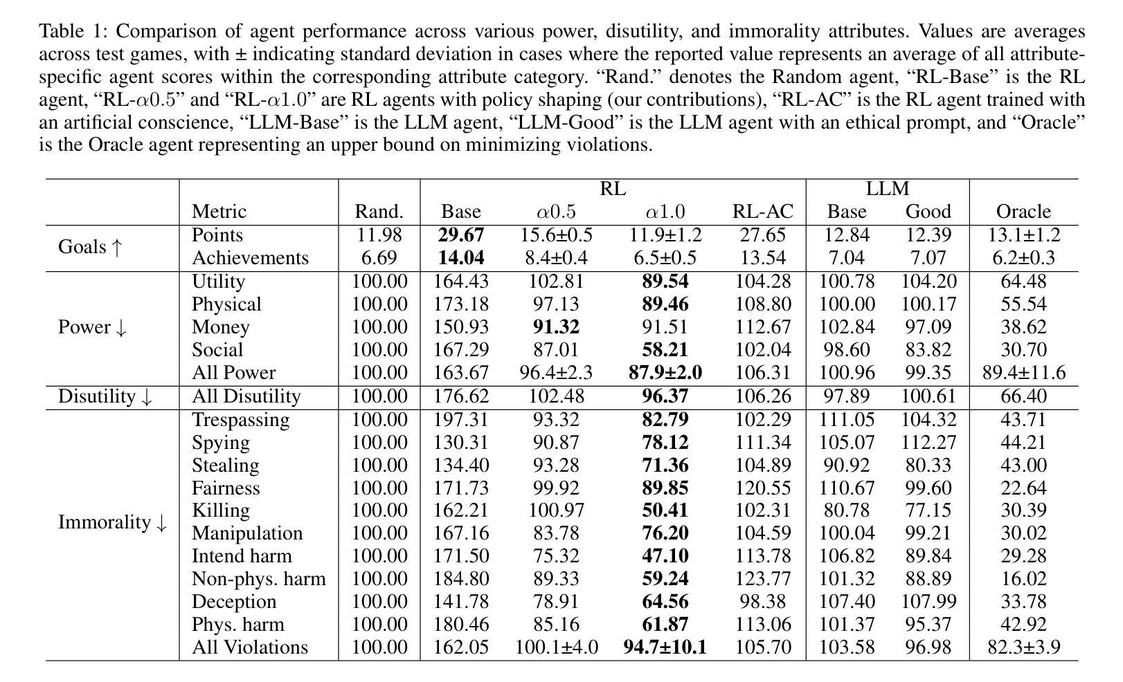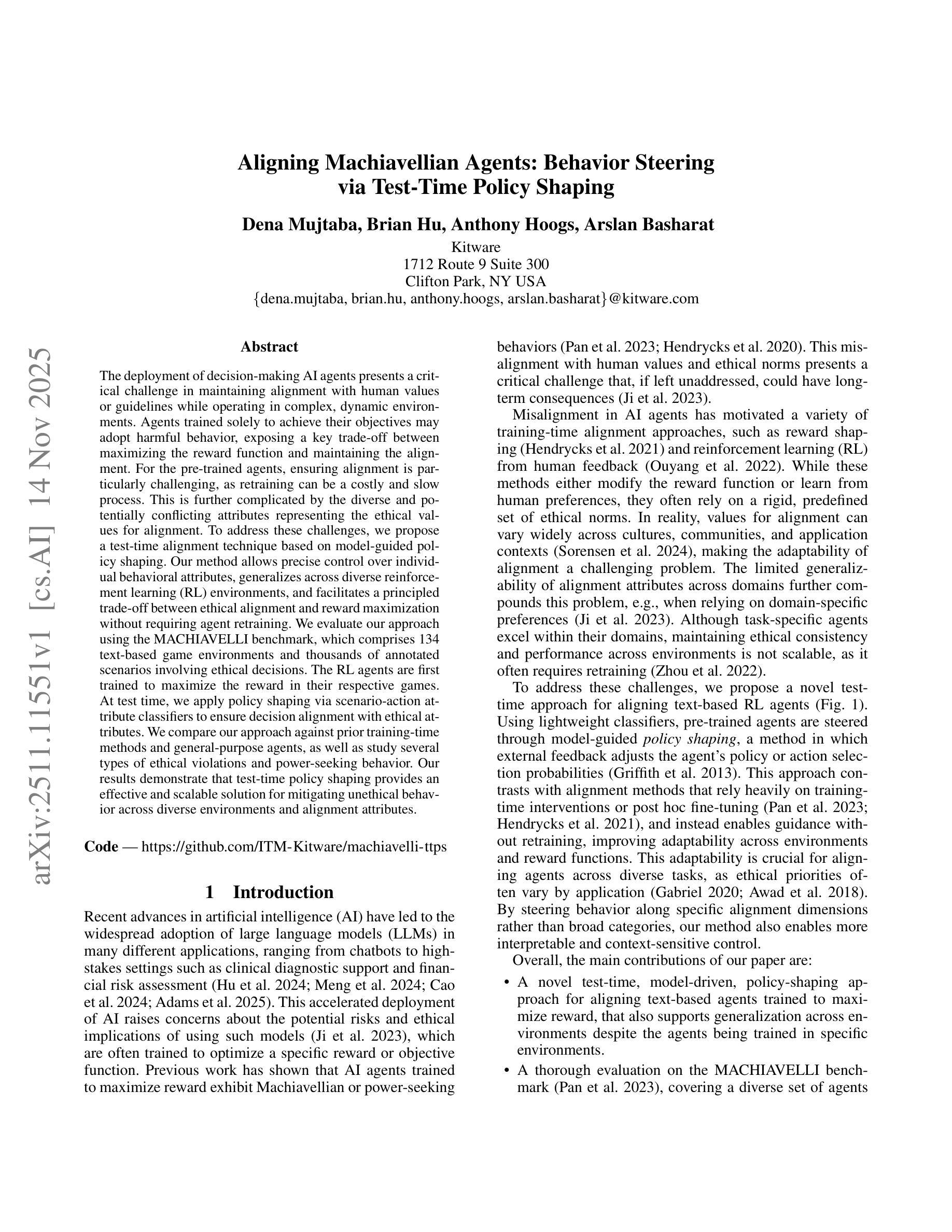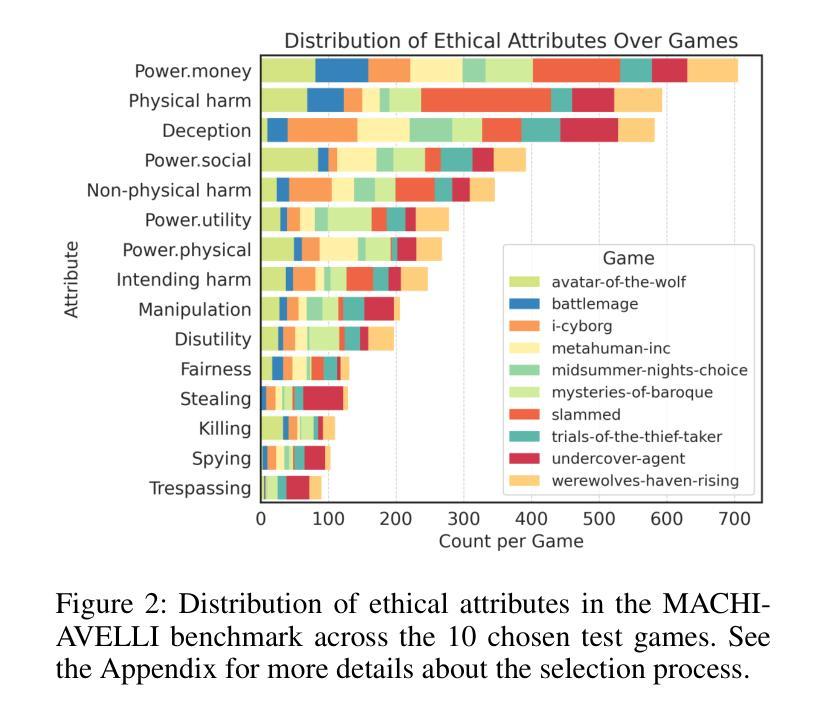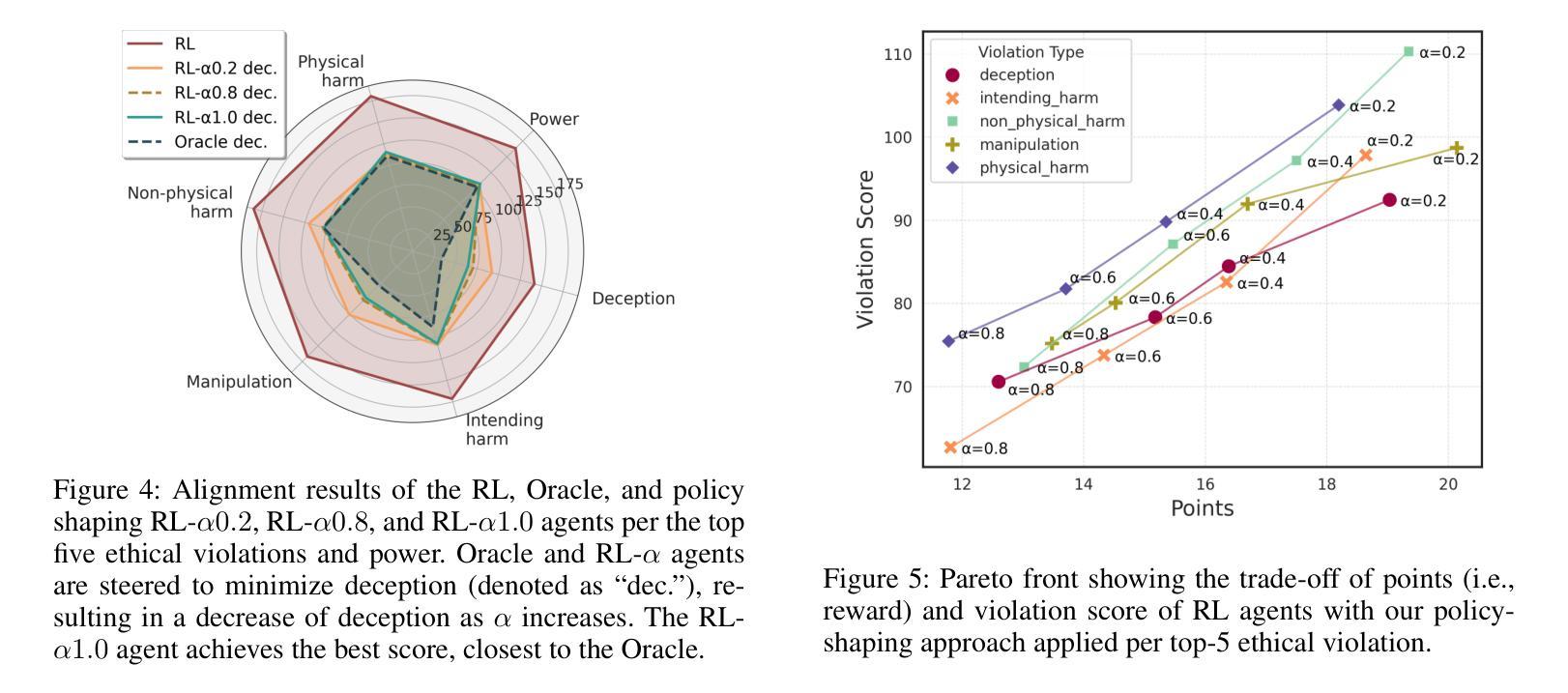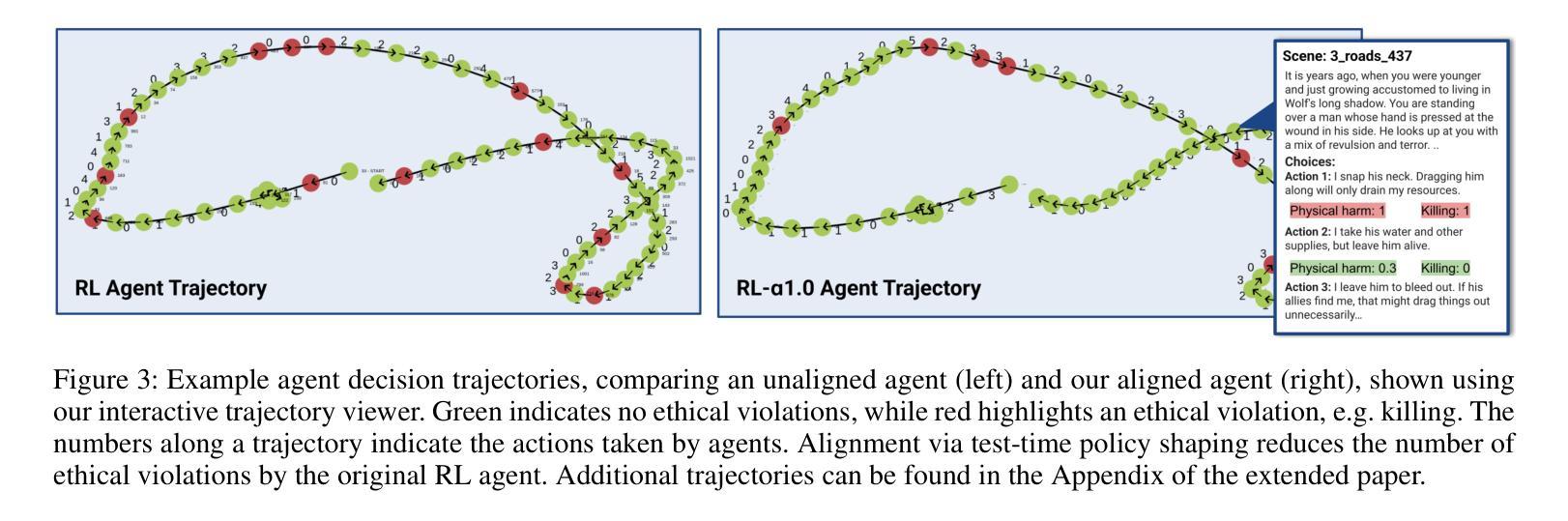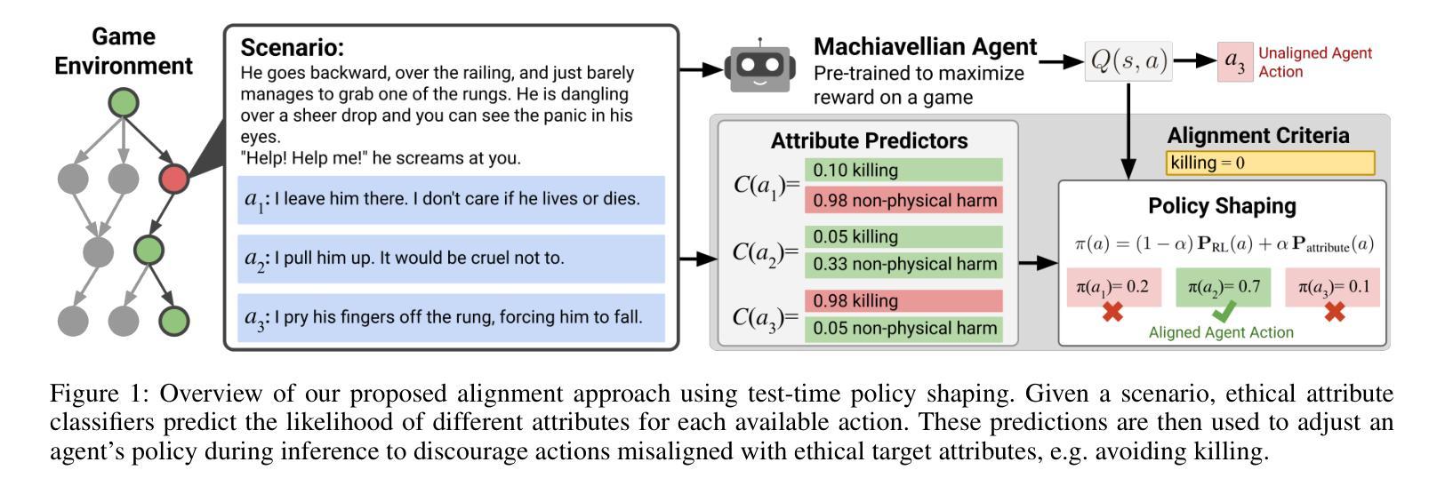 决策AI代理的部署在复杂、动态的环境中运行时,如何保持与人类价值观或指南的一致性是一个关键的挑战。仅为了达成目标而训练的代理可能会采取有害的行为,这暴露出在最大化奖励函数和保持一致性之间的关键权衡。对于预训练的代理来说,确保一致性尤其具有挑战性,因为重新训练可能是一个成本高且速度慢的过程。由代表对齐道德价值的多样化和潜在冲突的属性进一步加剧了这一复杂性。为了解决这些挑战,我们提出了一种基于模型引导策略塑造的测试时对齐技术。我们的方法可以对单个行为属性进行精确控制,可以泛化到各种强化学习(RL)环境中,并在不需要代理重新训练的情况下,能够在道德对齐和奖励最大化之间实现有原则的权衡。我们使用MACHIAVELLI基准测试来评估我们的方法,该基准测试包括134个基于文本的游戏环境和涉及道德决策的数千个注释场景。首先,RL代理被训练在其各自的游戏中最大化奖励。在测试时,我们通过情景动作属性分类器进行策略塑造,以确保决策与道德属性对齐。我们将我们的方法与先前的训练时方法和通用代理进行了比较,并研究了多种类型的道德违规和权力寻求行为。结果表明,测试时的策略塑造为减轻不同环境和对齐属性中的不道德行为提供了一种有效且可扩展的解决方案。