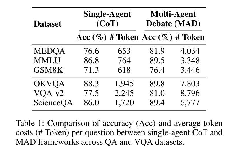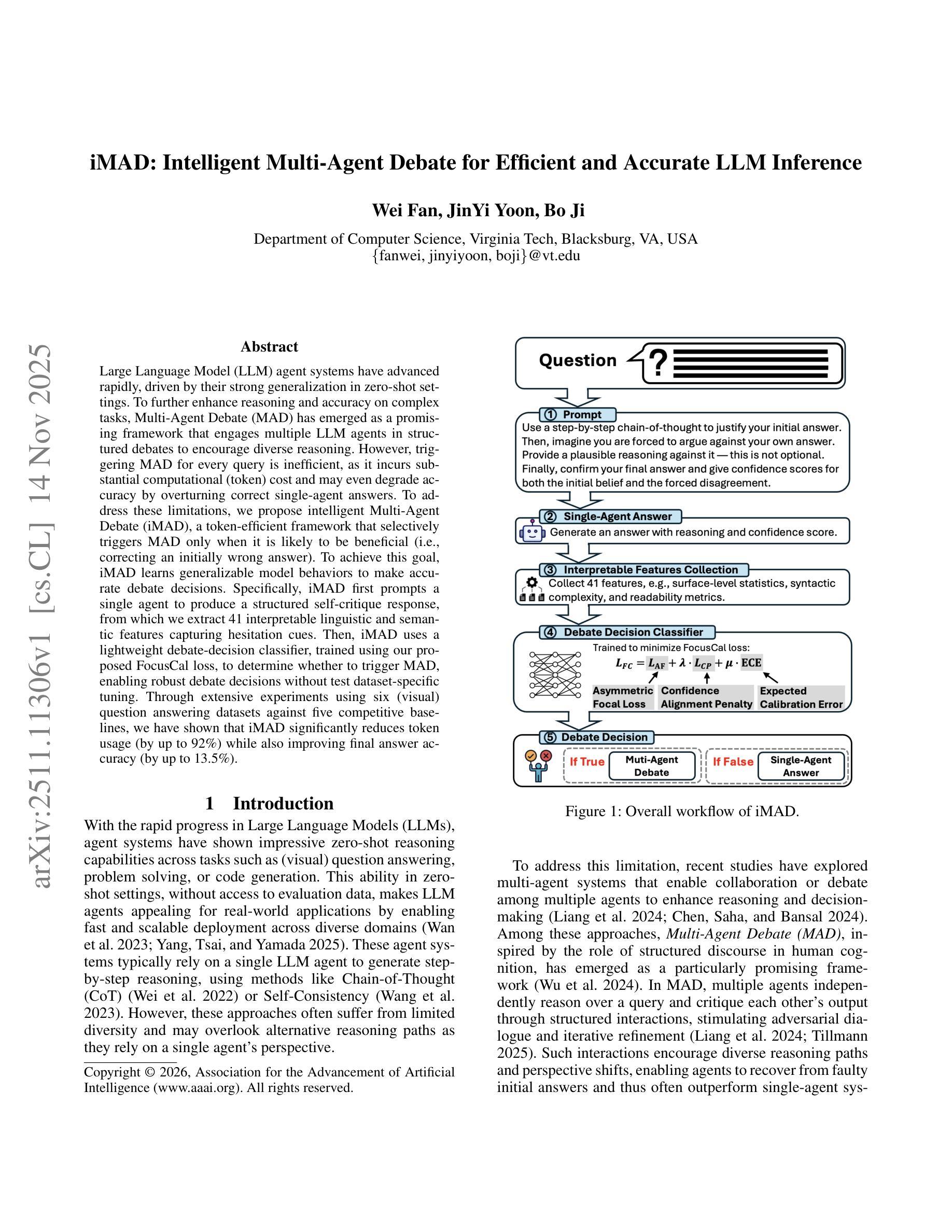 大规模语言模型(LLM)代理系统发展迅速,得益于它们在零样本设置中的强大泛化能力。为了进一步提高在复杂任务上的推理和准确性,多代理辩论(MAD)作为一个有前景的框架应运而生,它让多个LLM代理参与结构化辩论,以鼓励多样化的推理。然而,为每次查询触发MAD是不高效的,因为它会产生大量的计算(令牌)成本,甚至可能通过推翻正确的单代理答案来降低准确性。为了解决这些局限性,我们提出了智能多代理辩论(iMAD),这是一个令牌高效的框架,它只选择性地触发MAD,当这很可能是有益的时候(即纠正一个最初的错误答案)。为了实现这一目标,iMAD学习可推广的模型行为来做出准确的辩论决策。具体来说,iMAD首先提示单个代理产生结构化的自我批判响应,从中我们提取41个可解释的语言和语义特征,捕捉犹豫的线索。然后,iMAD使用轻量级的辩论决策分类器,使用我们提出的FocusCal损失进行训练,以确定是否需要触发MAD,从而实现稳健的辩论决策而无需针对测试数据集进行特定调整。通过在与五个竞争性基准测试的六个(视觉)问答数据集上进行的大量实验,我们已经证明iMAD显著减少了令牌使用(最多减少92%),同时提高了最终答案的准确性(最多提高1.倍或更大。简化后的翻译如下:大型语言模型(LLM)系统进步迅速,特别是其在零样本环境下的良好泛化能力是一大驱动力。为了提高复杂任务的推理和准确性,一种名为多代理辩论(MAD)的方法备受关注。然而,每次查询都触发MAD并不高效,因为它需要大量的计算成本并可能降低准确性。为解决这一问题,我们推出了智能多代理辩论(iMAD),这是一个能有效节省令牌的框架。它只在可能有益的情况下触发辩论功能(即纠正原先的错误答案)。为了做出明智的辩论决策,iMAD学习了可推广的模型行为。具体来说,它通过观察单个代理的自我批判响应来识别犹豫线索等特征。接着使用轻量级的辩论决策分类器决定是否触发辩论功能。经过在多个问答数据集上的测试表明,iMAD显著减少了令牌的使用量并提高了答案的准确性。
