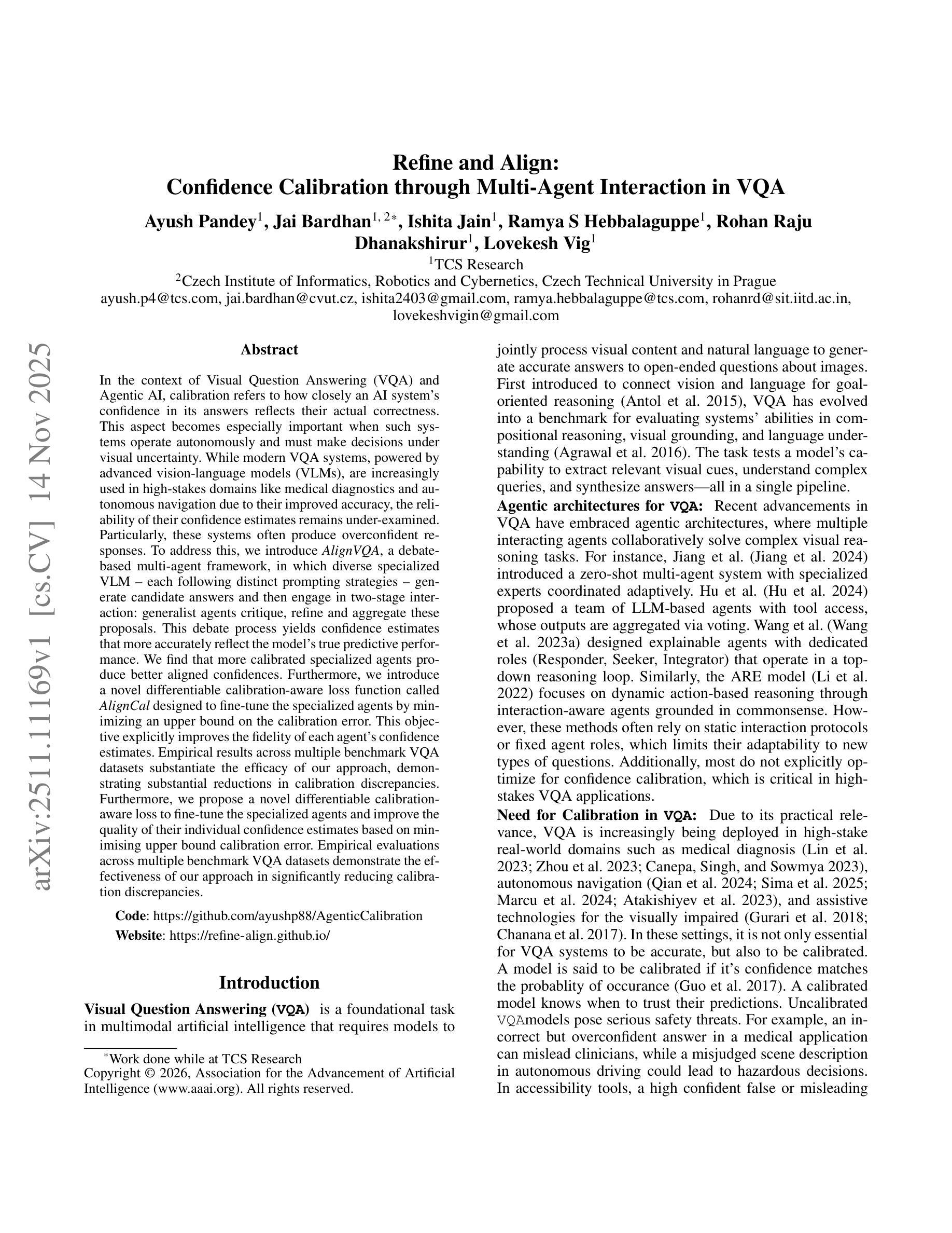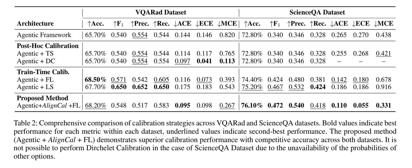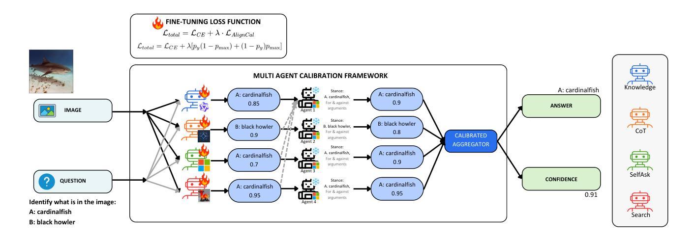 在视觉问答(VQA)和智能体人工智能的背景下,校准是指人工智能系统对其答案的信心与实际正确性之间的吻合程度。当这些系统自主运行并在视觉不确定性下做出决策时,这一方面变得尤为重要。虽然现代VQA系统凭借先进的视觉语言模型(VLM)在医疗诊断、自主导航等高风险领域的应用越来越广泛,由于其精度的提高,但其信心估计的可靠性仍未得到充分研究。特别地,这些系统通常会产生过于自信的回应。为了解决这个问题,我们引入了AlignVQA,这是一个基于辩论的多智能体框架,其中不同的专业VLM——每个都遵循独特的提示策略——生成候选答案,然后进行两阶段交互:通用智能体对这些提案进行批判、细化和聚合。这种辩论过程产生的信心估计更能准确反映模型的真正预测性能。我们发现更校准的专门智能体产生的信心更符合实际。此外,我们引入了一种新型的可微校准感知损失函数,称为aligncal,旨在通过最小化校准误差的上界来微调专业智能体。这一目标明确提高了每个智能体信心估计的忠实度。在多个基准VQA数据集上的实证结果证实了我们方法的有效性,显示出校准差异的大幅减少。此外,我们提出了一种新型的可微校准损失来微调专业智能体,以提高其个体信心估计的质量,这是基于最小化上界校准误差来实现的。