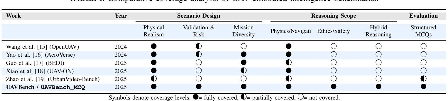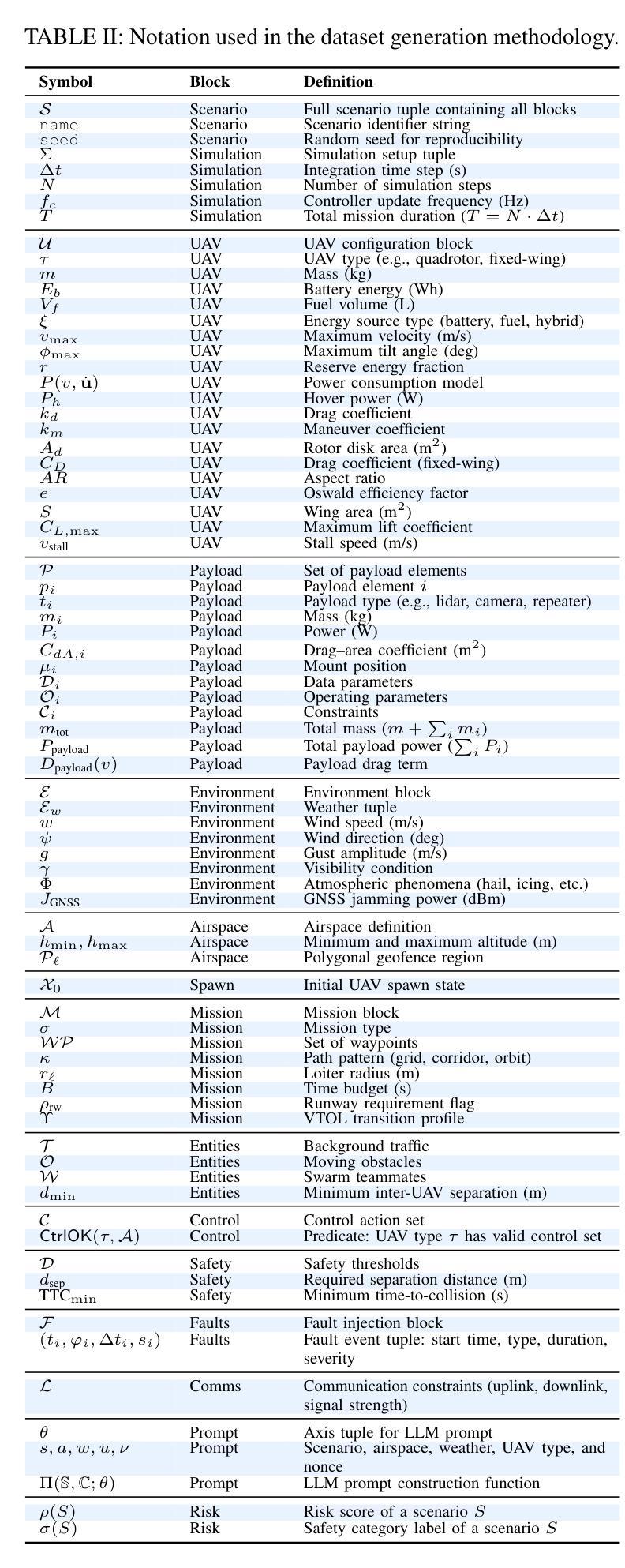 - UAVBench数据集包含通过分类学指导的语言模型提示生成的无人机飞行场景,并进行了多阶段安全验证。