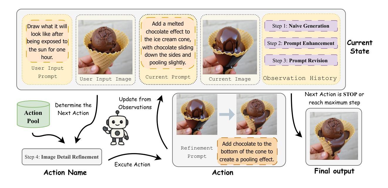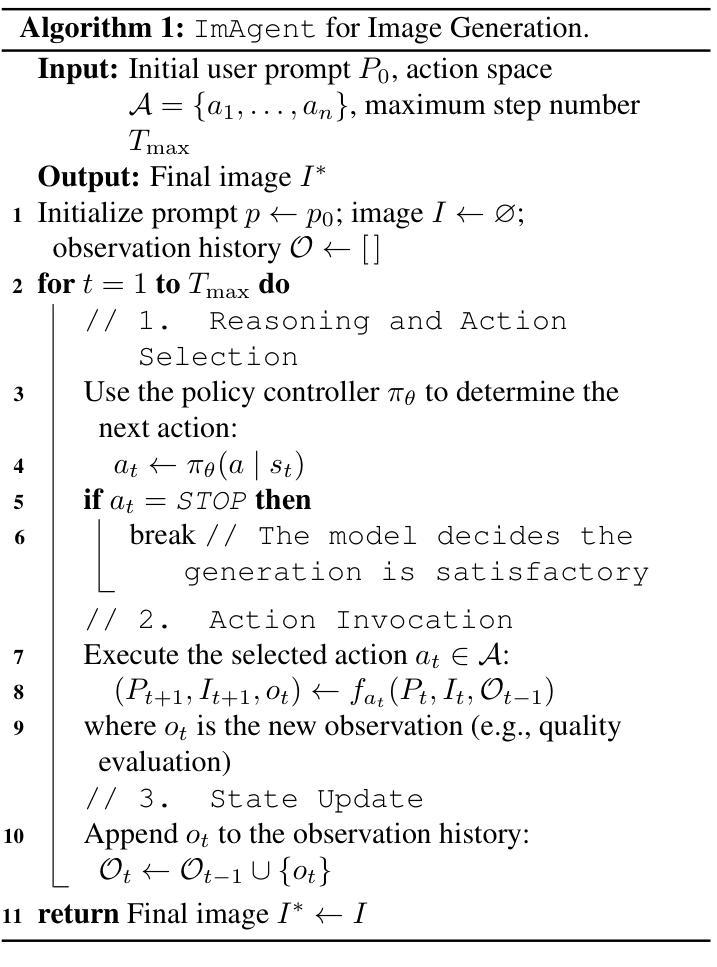 近期文本到图像(T2I)模型在生成视觉上逼真且语义上连贯的图像方面取得了显著进步。然而,它们仍然受到给定提示的随机性和不一致性的困扰,尤其是在文本描述模糊或未指定时。现有方法,如提示重写、最佳N采样和自我完善,可以缓解这些问题,但它们通常需要额外的模块并且独立操作,阻碍了测试时的规模扩展效率并增加了计算开销。在本文中,我们介绍了ImAgent,这是一种无需训练的统一多模态代理,它在一个框架内集成了推理、生成和自我评估,以实现有效的测试时间缩放。在策略控制器的引导下,多个生成动作能够动态交互并自我组织,以提高图像的真实性和语义一致性,而无需依赖外部模型。在图像生成和编辑任务上的大量实验表明,ImAgent始终在主干网络上有所提升,甚至在主干模型失败的情况下也超过了其他强大的基线,这突显了统一多模态代理在测试时间缩放下的自适应和高效图像生成的潜力。