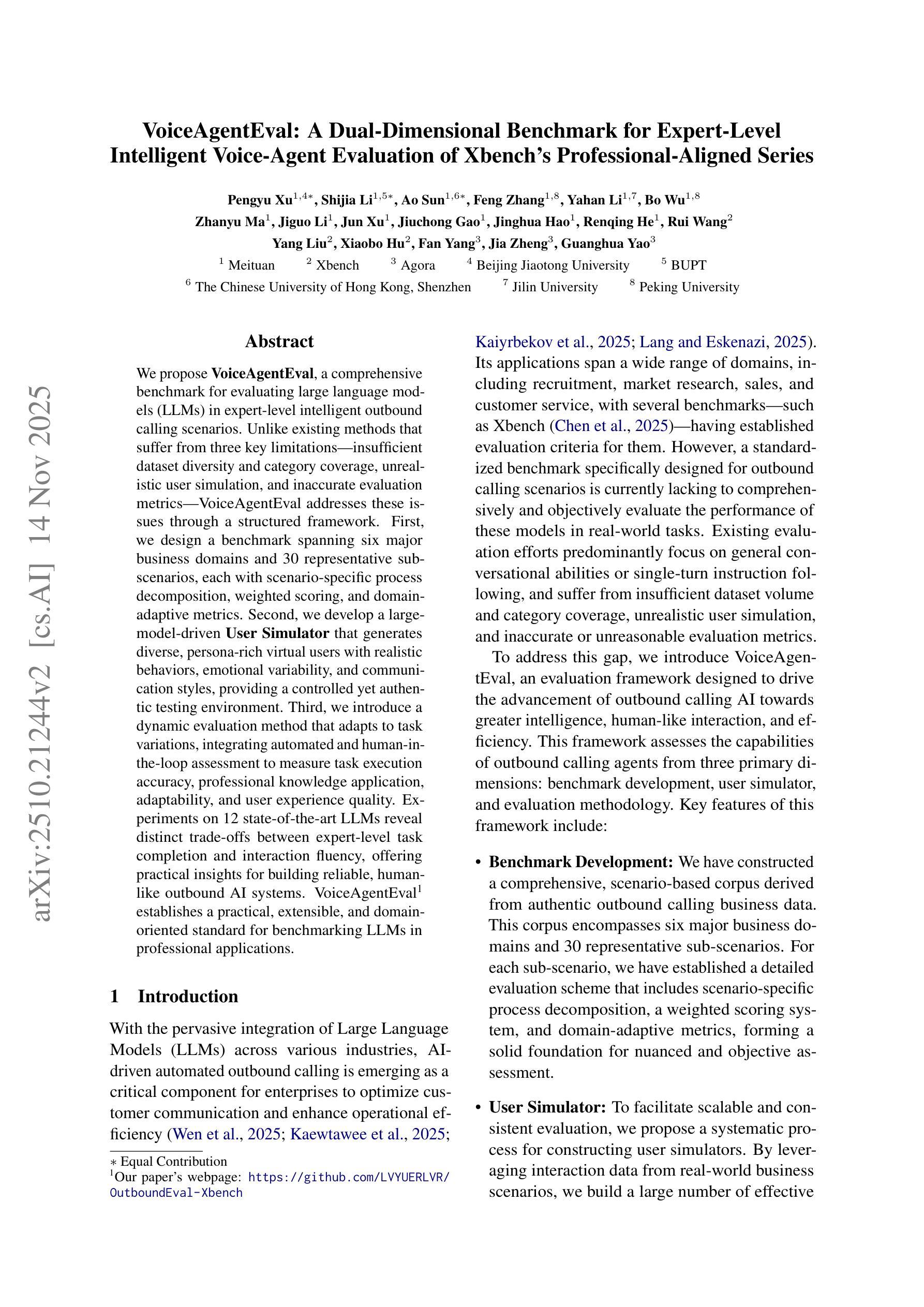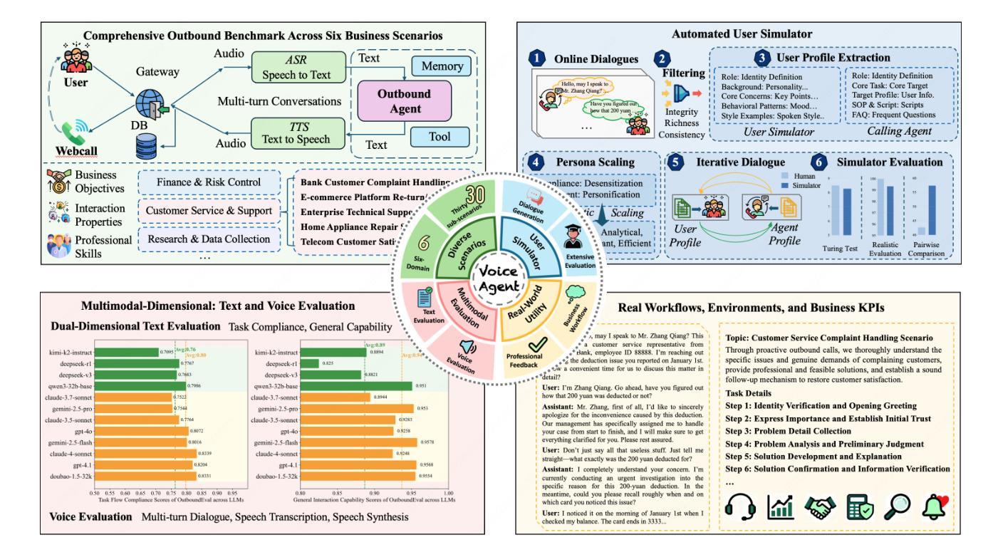 我们提出了OutboundEval,这是一个在专家级智能外呼场景中评估大型语言模型(LLM)的综合基准测试。与现有方法存在的三个主要局限性——数据集多样性和类别覆盖不足、用户模拟不真实、评估指标不准确——相比,OutboundEval通过结构化框架解决了这些问题。首先,我们设计了一个跨越六大业务域和30个代表性子场景的基准测试,每个场景都有特定的流程分解、加权评分和域自适应指标。其次,我们开发了一个以大型模型驱动的用户模拟器,生成具有多样化、丰富个性的虚拟用户,具有真实行为、情绪变化和交流风格,提供了一个受控但真实的测试环境。第三,我们引入了一种动态评估方法,该方法能够适应任务变化,结合自动化和人工评估,测量任务执行准确性、专业知识应用、适应性和用户体验质量。在12个最先进的大型语言模型上的实验揭示了专业任务完成和交互流畅性之间的明显权衡,为构建可靠、人性化的外呼AI系统提供了实际见解。OutboundEval为专业应用中大型语言模型的基准测试建立了一个实用、可扩展和面向域的标准。