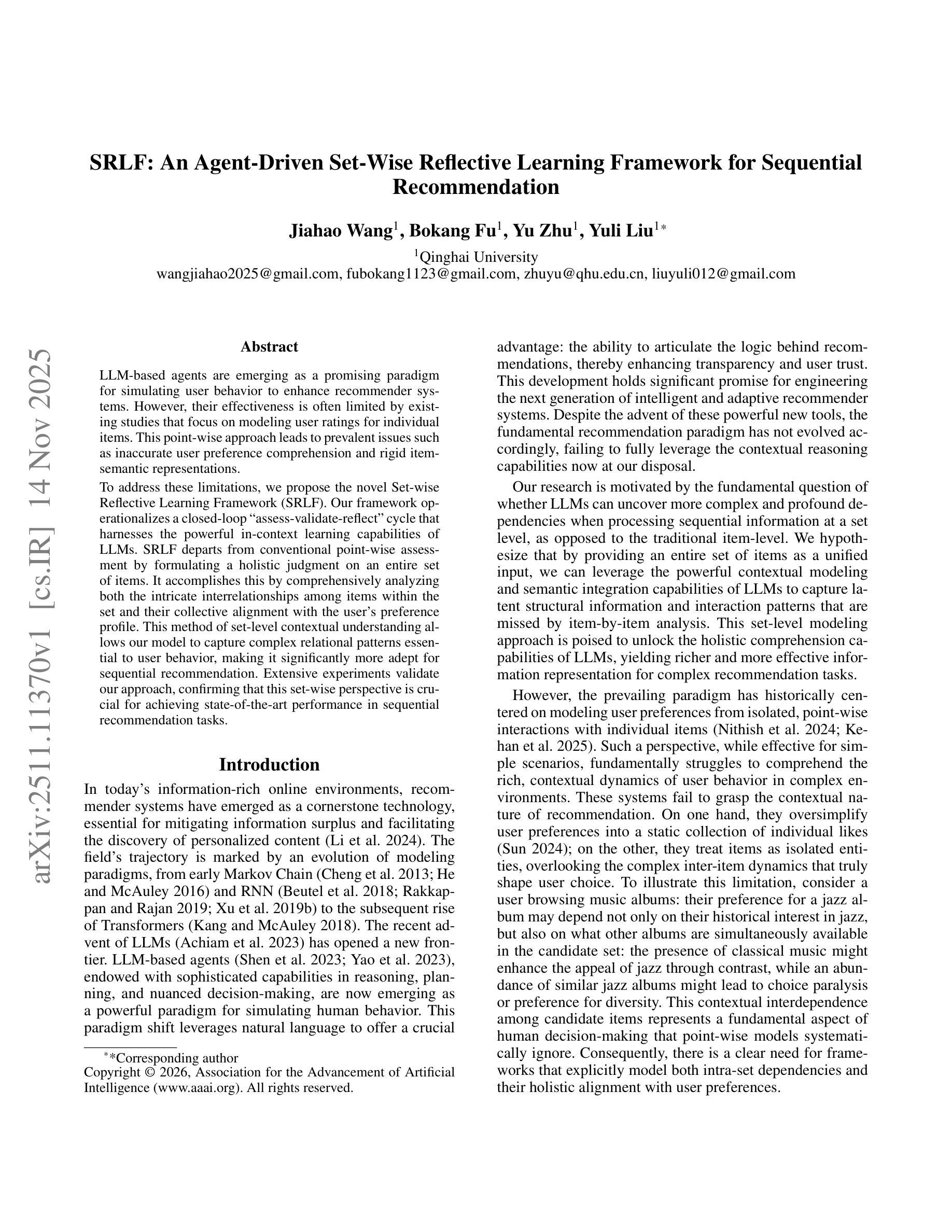 基于大型语言模型的代理(LLM-based agents)作为一种模拟用户行为以增强推荐系统的有前途的模式正崭露头角。然而,其有效性通常受限于现有研究,这些研究集中在为单个项目建立用户评级模型上。这种点对点的方法导致了普遍存在的问题,如用户偏好理解不准确和项目语义表示僵化。为了解决这些局限性,我们提出了新颖的集合级反思学习框架(SRLF)。我们的框架实施了一个闭环的“评估-验证-反思”周期,利用大型语言模型的上下文学习能力。SRLF通过对整个项目集进行整体判断,从而改变了传统的点对点评估方式。它通过综合分析集合内项目之间复杂的关系以及它们与用户偏好配置的集体一致性来实现这一点。这种集合级别的上下文理解方法使我们的模型能够捕捉到对用户行为至关重要的复杂关系模式,使其在序列推荐方面更加擅长。大量实验验证了我们方法的有效性,证明了集合观点对于实现最先进的序列推荐任务性能至关重要。