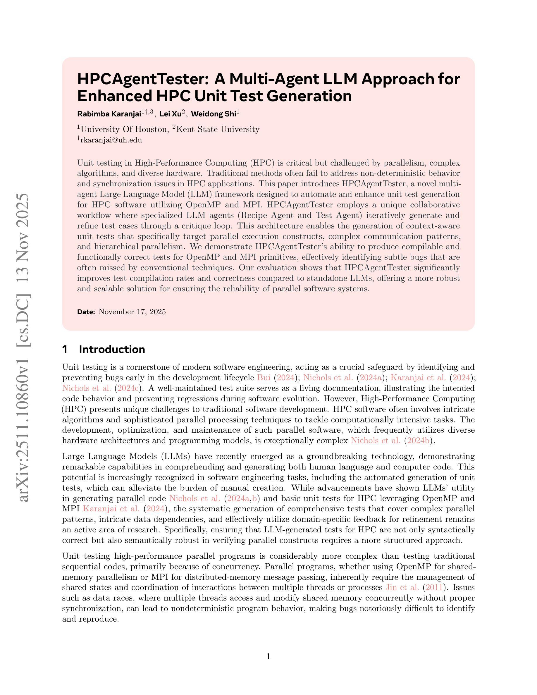 高性能计算(HPC)中的单元测试至关重要,但面临并行性、复杂算法和多样硬件的挑战。传统方法往往无法解决HPC应用程序中的非确定性行为和同步问题。本文介绍了HPCAgentTester,一种新型多智能体大型语言模型(LLM)框架,旨在利用OpenMP和MPI自动化和提高HPC软件的单元测试生成。HPCAgentTester采用独特的协作工作流程,专用LLM智能体(配方智能体和测试智能体)通过评审循环迭代生成和细化测试用例。此架构能够生成针对并行执行结构、复杂通信模式和层次并行的上下文感知单元测试。我们证明了HPCAgentTester能够为OpenMP和MPI基本组件生成可编译和功能正确的测试,有效地发现传统技术常忽略的细微错误。我们的评估显示,与独立LLM相比,HPCAgentTester显著提高测试编译率和正确性,为并行软件系统提供更为稳健和可扩展的可靠性保证解决方案。