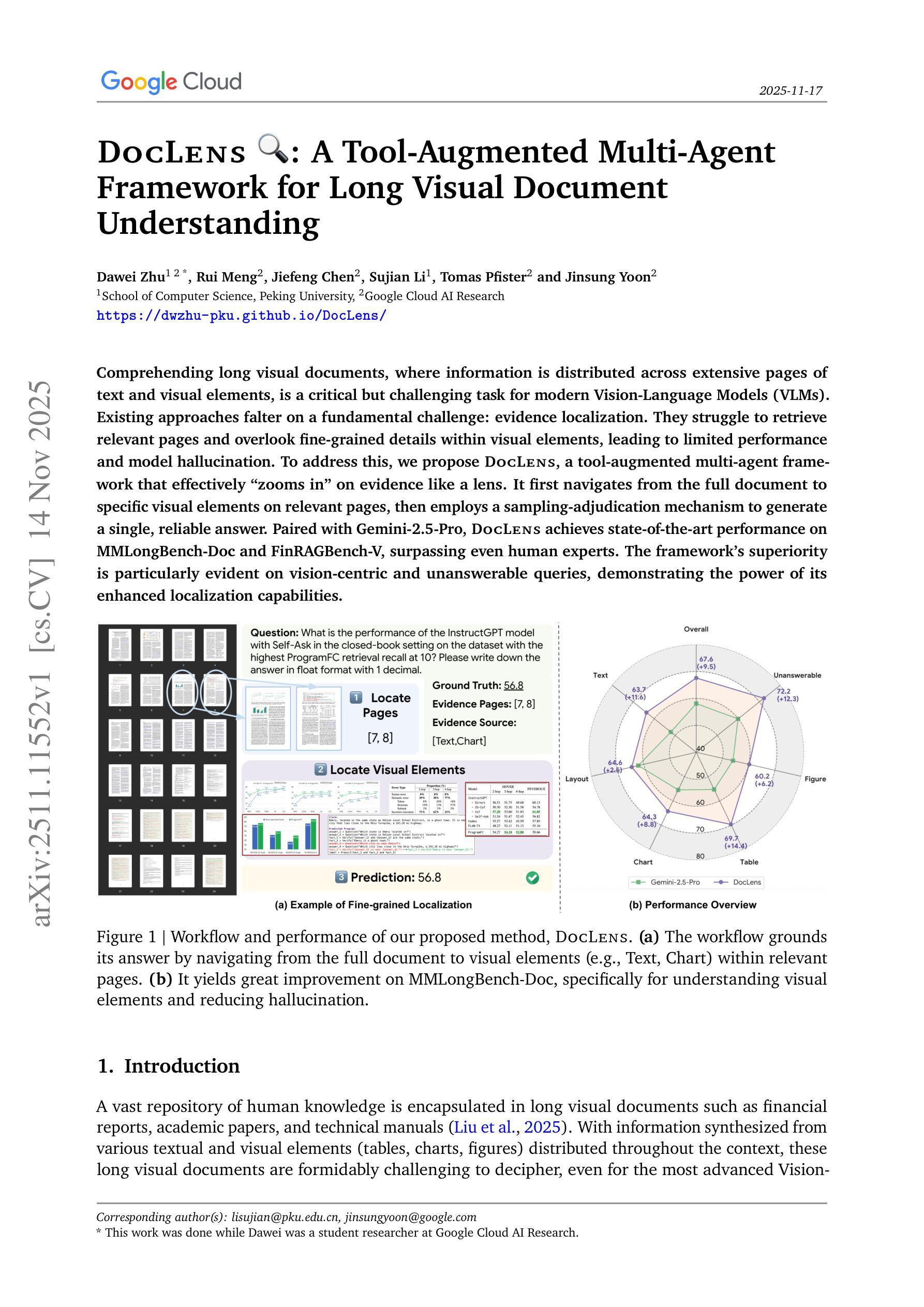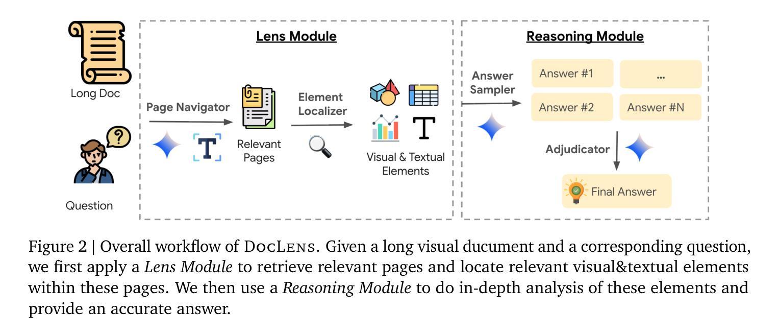 理解和处理长视觉文档是一个对现代视觉语言模型(VLMs)至关重要但具有挑战性的任务,信息分布在大量文本和视觉元素中。现有方法面临一个基本挑战:证据定位。他们难以检索相关页面,并忽略了视觉元素中的细微细节,导致性能有限和模型幻觉。为了解决这个问题,我们提出了DocLens,这是一个工具增强型多代理框架,可以像镜头一样有效地“放大”证据。它首先从整个文档导航到相关页面上的特定视觉元素,然后采用采样判决机制生成单一、可靠的答案。与Gemini-2.5-Pro配对,DocLens在MMLongBench-Doc和FinRAGBench-V上实现了最先进的性能,甚至超越了人类专家。该框架在视觉为中心和无法回答的问题上表现得尤为出色,证明了其增强定位能力的强大。