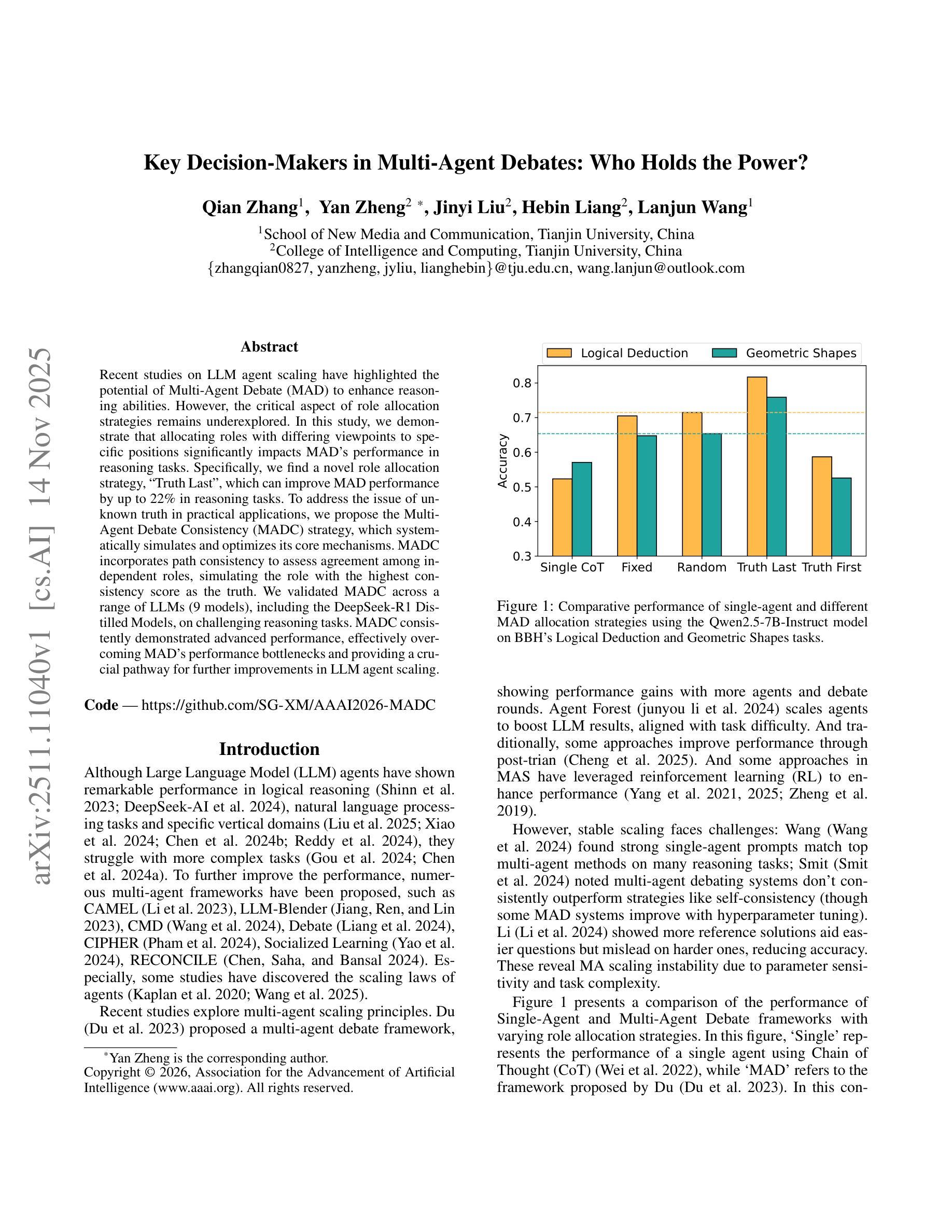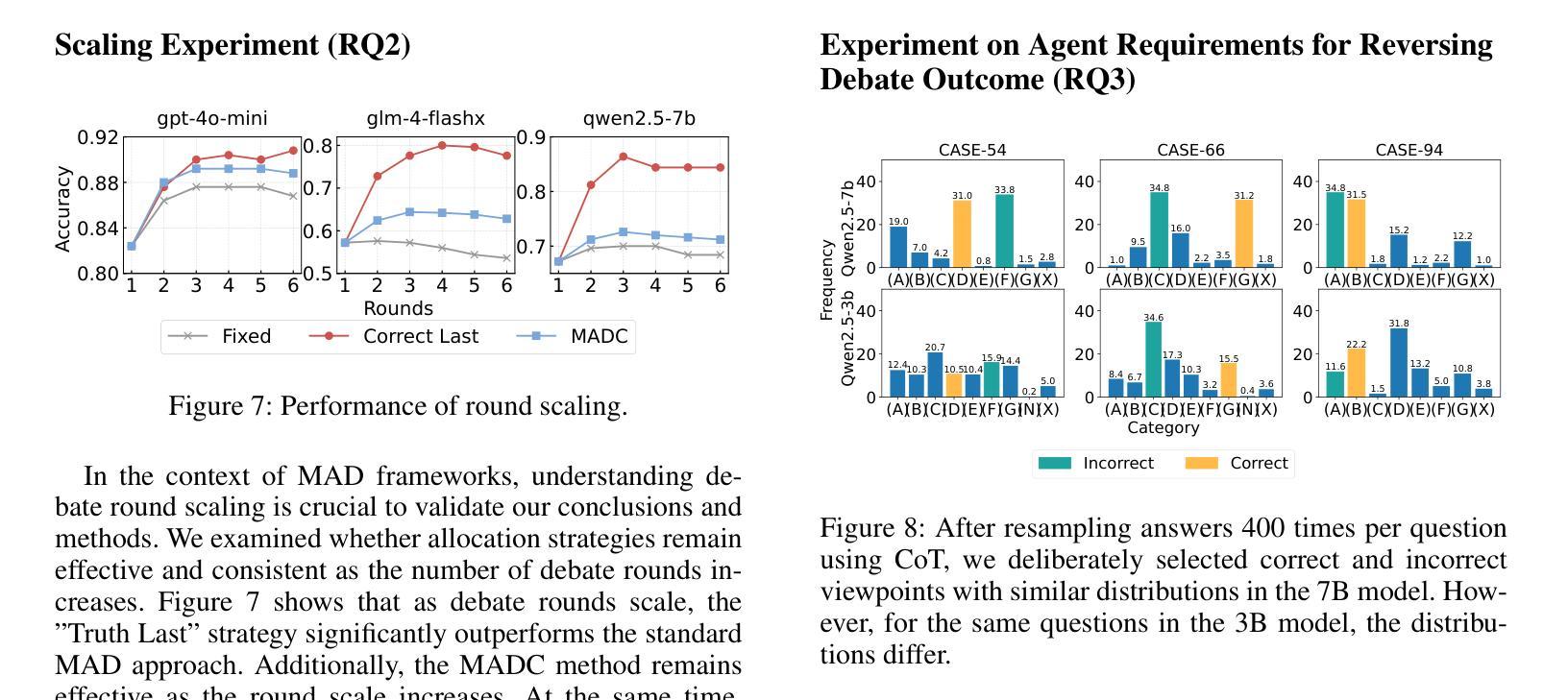 该研究表明,在大型语言模型(LLM)代理扩展中,多代理辩论(MAD)的推理能力具有潜力。通过分配不同观点的角色到特定位置,角色分配策略对MAD在推理任务中的表现产生显著影响。研究提出了一种新的角色分配策略“真理最后”,可以提高MAD在推理任务中的性能高达22%。为了解决实际应用中未知真理的问题,研究提出了多代理辩论一致性(MADC)策略,它通过模拟和优化核心机制来系统地解决这一问题。在多种LLM上验证了MADC策略的有效性,包括DeepSeek-R1蒸馏模型,它在具有挑战性的推理任务中表现优越,有效克服了MAD的性能瓶颈,为LLM代理扩展的进一步改进提供了关键途径。