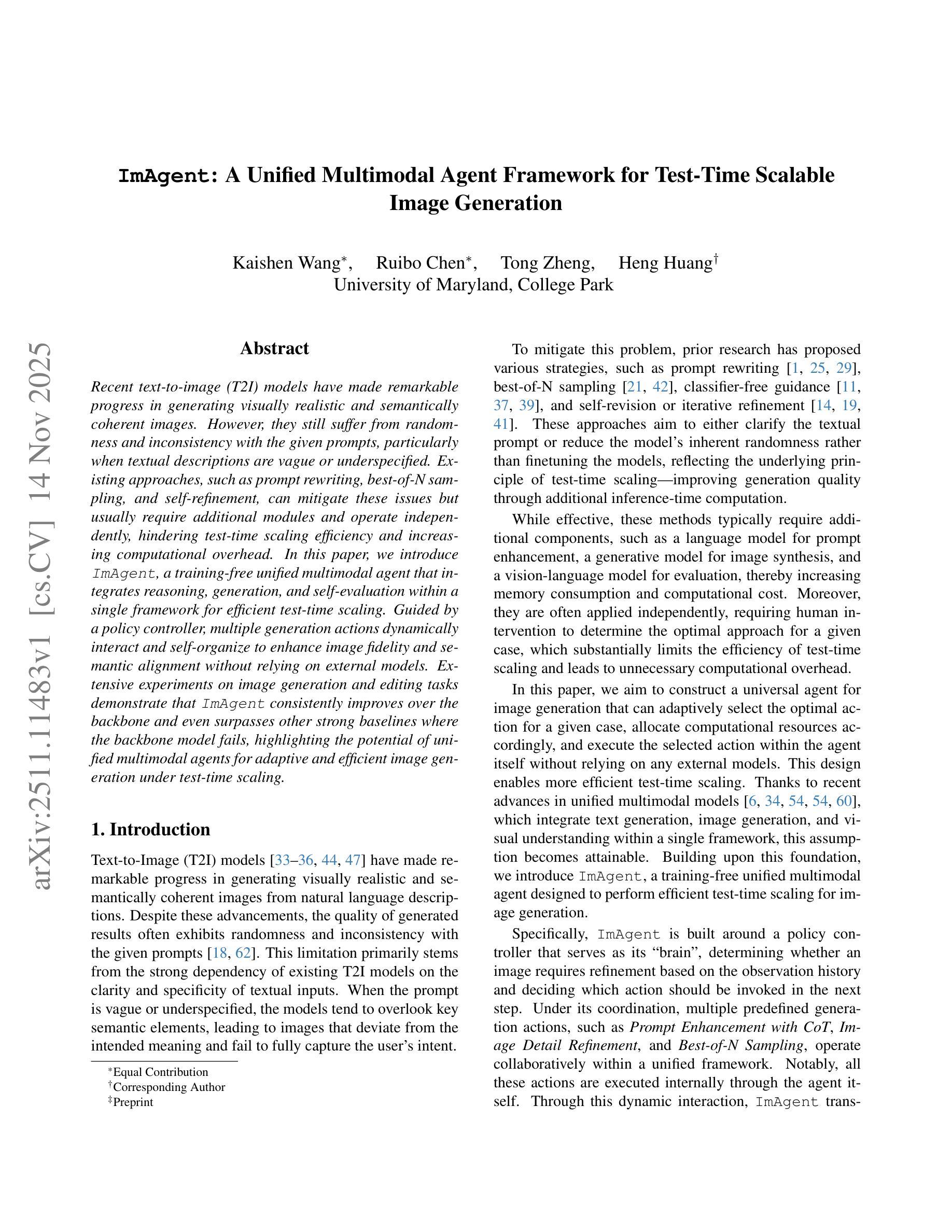 新一代文本到图像(T2I)模型在生成视觉真实且语义连贯的图像方面取得了显著进步,但仍存在随机性和与提示不一致的问题,尤其在文本描述模糊或未明确指定时。现有方法如提示重写、最佳N采样和自我完善等,虽能缓解这些问题,但需要额外的模块并且操作独立,影响测试时的缩放效率并增加了计算开销。本文提出ImAgent,一个无需训练的统一多模态代理,它在一个框架内集成了推理、生成和自我评估,以实现高效的测试时缩放。受策略控制器的引导,多个生成动作能动态交互和自我组织,提高图像保真度和语义一致性,无需依赖外部模型。在图像生成和编辑任务的广泛实验表明,ImAgent不断改善并超越其他强大基线,即使背景模型失败也如此,凸显出统一多模态代理在测试时缩放自适应和高效图像生成的潜力。