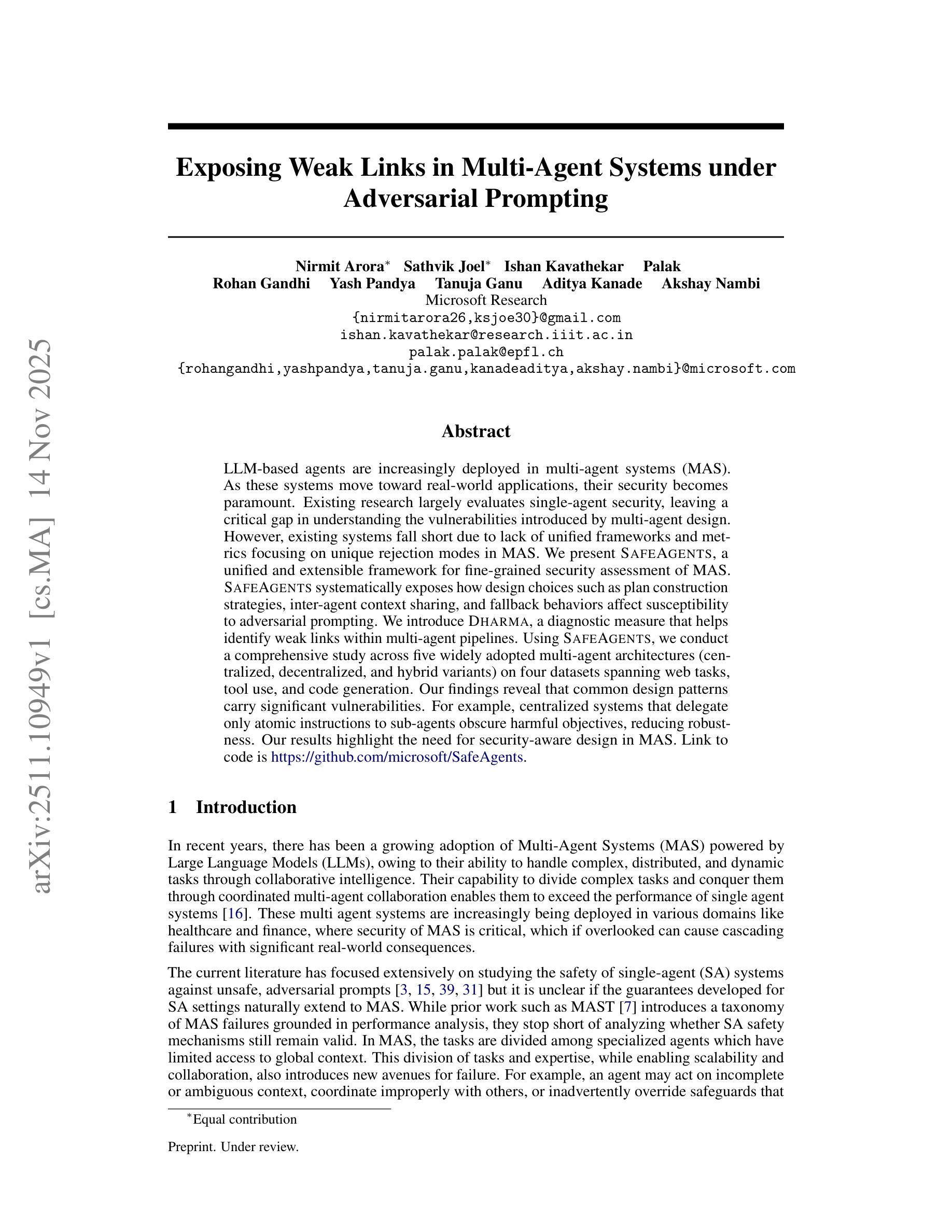 大型语言模型(LLM)驱动的代理在多代理系统(MAS)中的应用日益普及。随着这些系统向实际应用发展,其安全性变得至关重要。当前研究主要评估单一代理的安全性,忽视了多代理设计引入的漏洞所带来的风险。然而,现有的系统由于缺乏统一框架和专注于多代理系统(MAS)中的独特拒绝模式的度量标准而显得不足。本文提出了SafeAgents,这是一个统一且可扩展的框架,用于对MAS进行精细粒度的安全评估。SafeAgents系统地揭示了设计选择(如计划构建策略、代理间上下文共享和故障恢复行为)如何影响对对抗性提示的敏感性。本文还介绍了Dharma,这是一种诊断措施,有助于识别多代理管道中的薄弱环节。使用SafeAgents,我们在五个广泛采用的多代理架构(集中式、分散式和混合变体)以及涵盖网络任务、工具使用和代码生成的四个数据集上进行了综合研究。结果表明,常见的设计模式存在重大安全漏洞。例如,仅向子代理委派原子指令的集中式系统可能会掩盖有害目标,从而降低稳健性。本研究强调了多代理系统设计中需要注重安全性。