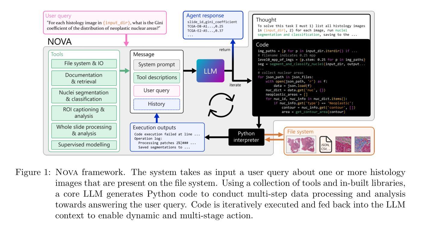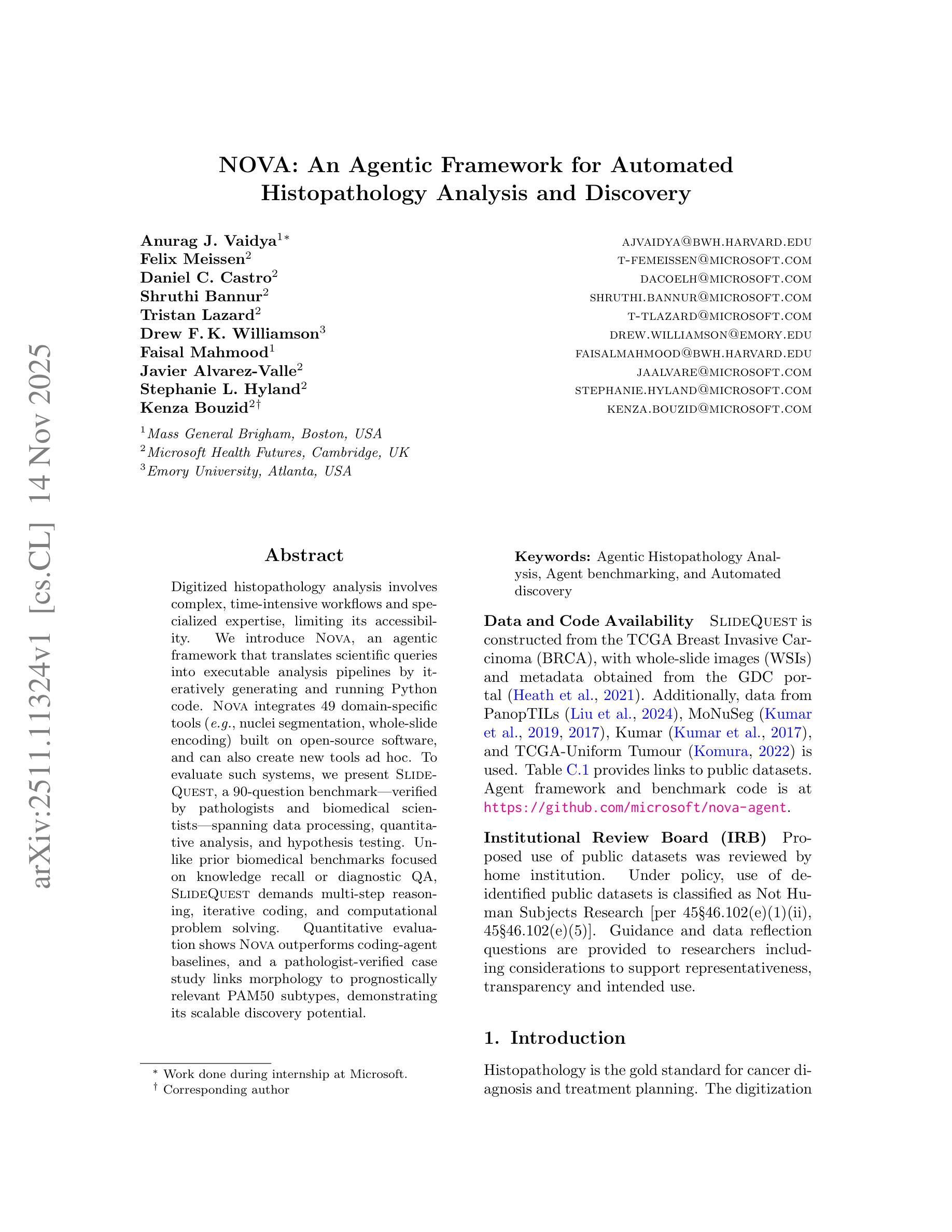 数字化病理分析涉及复杂且耗时的流程,需要专业的技术知识,这就限制了其普及性。我们介绍了NOVA,这是一个智能框架,能够将科学查询转化为可执行的分析管道,通过迭代生成和运行Python代码来实现。NOVA整合了49个基于开源软件的领域特定工具(例如,细胞核分割、全幻灯片编码),并能够即兴创建新工具。为了评估这样的系统,我们推出了SlideQuest,这是一个由病理学家和生物医学科学家验证的包含90个问题的基准测试,涉及数据处理、定量分析和假设检验。与以往侧重于知识回忆或诊断质量保障的生物医学基准测试不同,SlideQuest需要多步骤推理、迭代编码和计算问题解决。定量评估显示,NOVA的表现优于编码代理基准测试,并且经过病理学家验证的案例研究将形态与预后相关的PAM50亚型联系起来,证明了其可扩展的发现潜力。