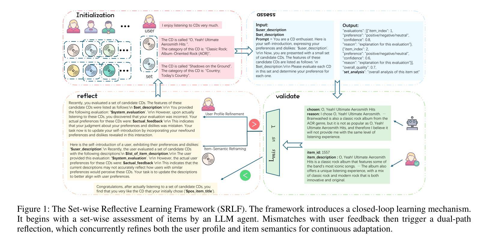 基于LLM的代理模拟用户行为以增强推荐系统,展现出巨大的潜力。然而,现有的研究多聚焦于对用户单个项目的评分建模,这种方式导致用户偏好理解不准确和项目语义表示僵化等问题。为解决这些局限性,我们提出了新颖的Set-wise Reflective Learning Framework(SRLF)。我们的框架通过操作一个闭环的“评估-验证-反思”周期,利用LLM的上下文学习能力。SRLF不同于传统的点态评估,它对整个项目集进行整体判断。通过全面分析项目之间的复杂相互关系以及它们与用户偏好之间的集体一致性,实现了集合级别的上下文理解,从而捕捉对用户行为至关重要的复杂关系模式,使其对序列推荐任务更加擅长。实验验证了我们方法的有效性,证明了集合视角对于实现最先进的序列推荐任务性能至关重要。
