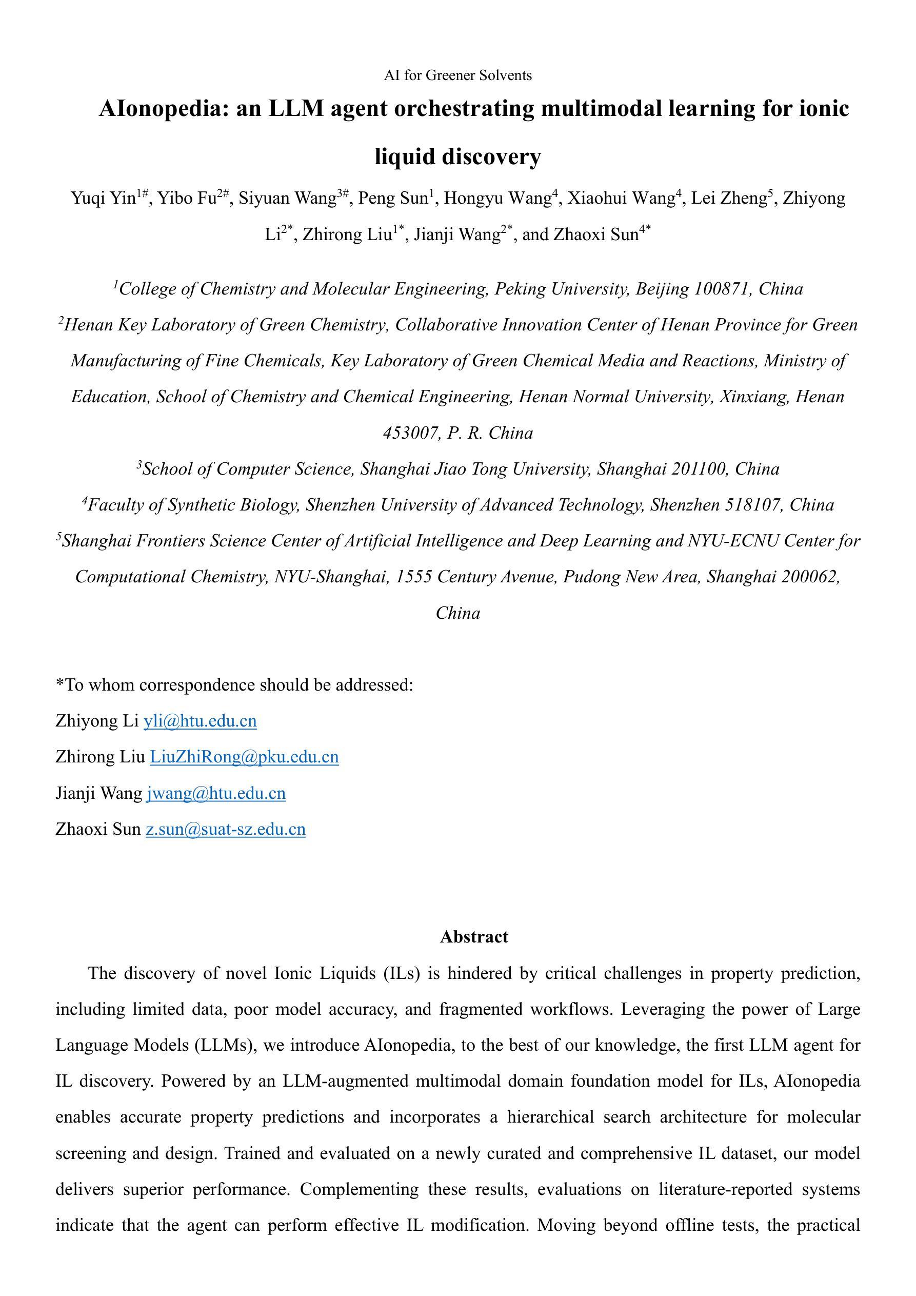 离子液体的新型发现受到属性预测方面的重大挑战所阻碍,包括数据有限、模型精度不足以及工作流程碎片化。我们借助大型语言模型(LLM)的力量,推出了AIonopedia,据我们所知,这是首款用于离子液体(IL)发现的LLM代理。AIonopedia由LLM增强的离子液体多模式域基础模型提供动力,能够进行准确的属性预测,并采用分层搜索架构进行分子筛选和设计。我们的模型是在新整理的综合离子液体数据集上进行训练和评估的,表现出卓越的性能。此外,对文献报道系统的评估表明,该代理可以有效进行离子液体改造。除了线下测试之外,通过现实世界湿实验室的验证进一步证实了其实用性,代理在具有挑战性的离群任务中表现出卓越的泛化能力,突显了其加速现实世界离子液体发现的能力。