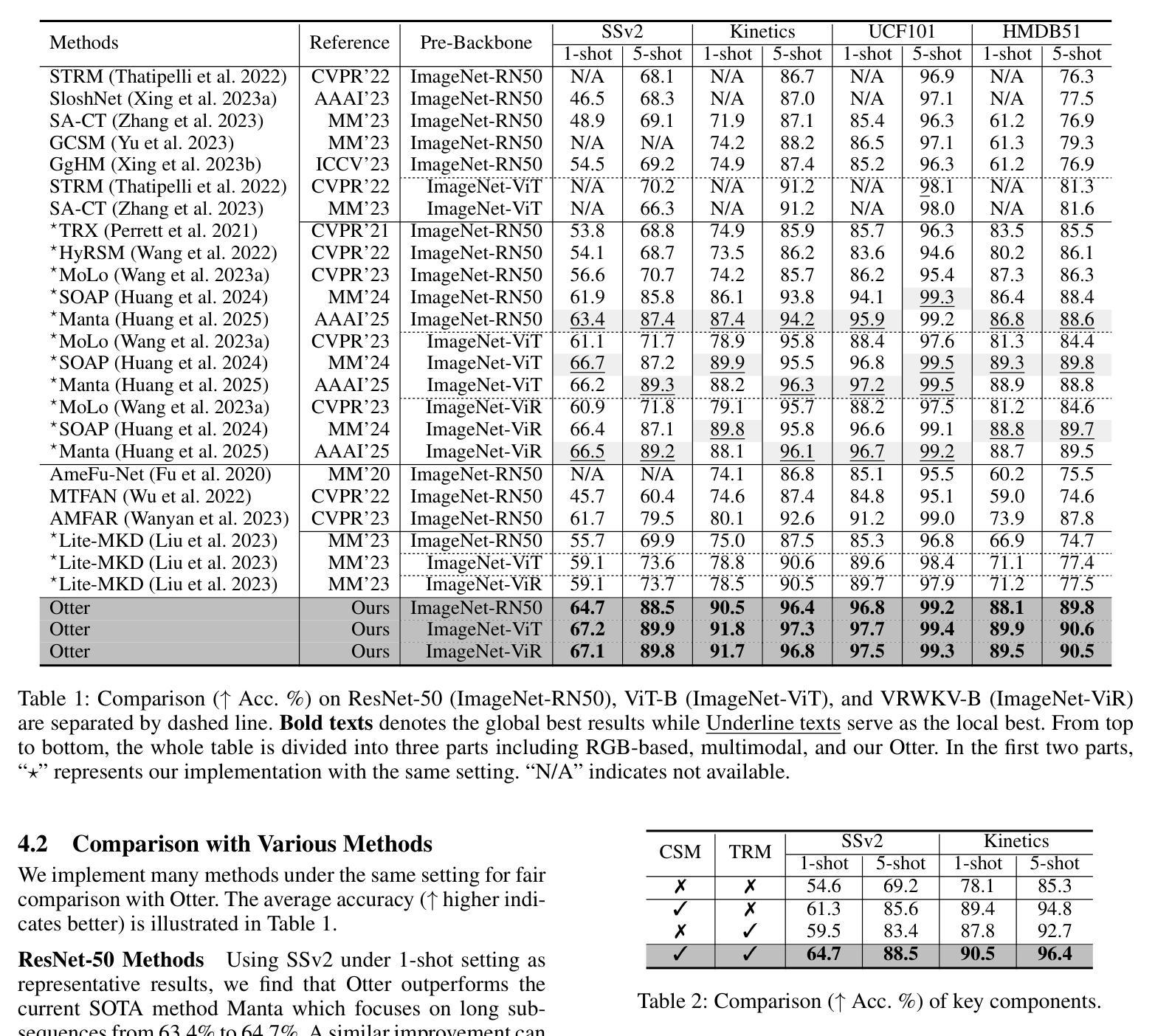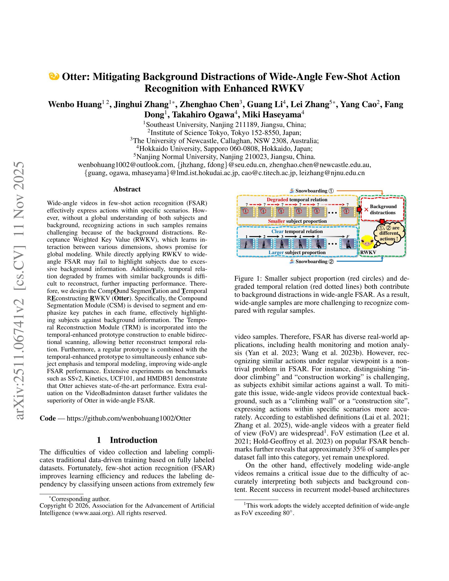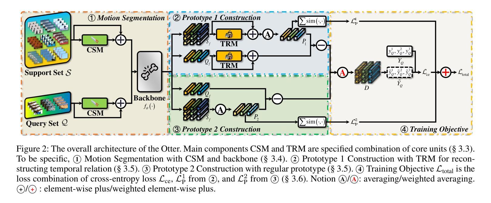 本文研究了基于广角视频的少样本动作识别(FSAR)问题。尽管广泛使用的RWKV模型可以学习各种维度间的交互作用以实现全局建模,但由于缺少对背景和主题的全面理解,直接在FSAR中应用可能会导致识别效果受限。为此,文章提出了一个名为Otter的新方法,其中包括CSM(复合分段模块)和TRM(时间重建模块)。CSM能够分割并强调关键帧中的关键区域,有效突出主题信息;而TRM则通过构建时间增强原型来实现双向扫描,从而重建时间关系。同时,通过对常规原型和时间增强原型的结合,既能突出主题又能强化时间建模,提升了宽视角FSAR的性能。实验结果证明,Otter方法在多个基准数据集上达到了最佳性能。