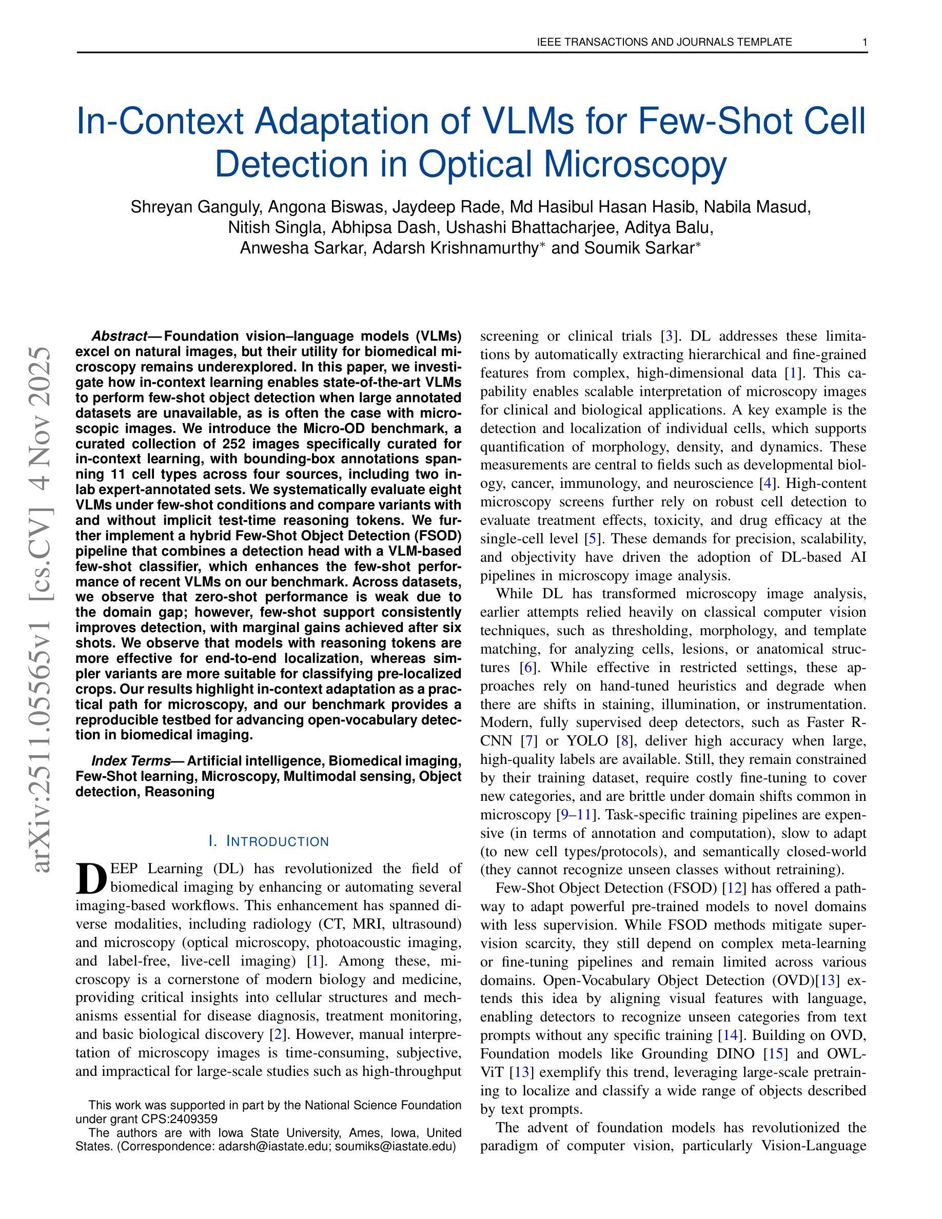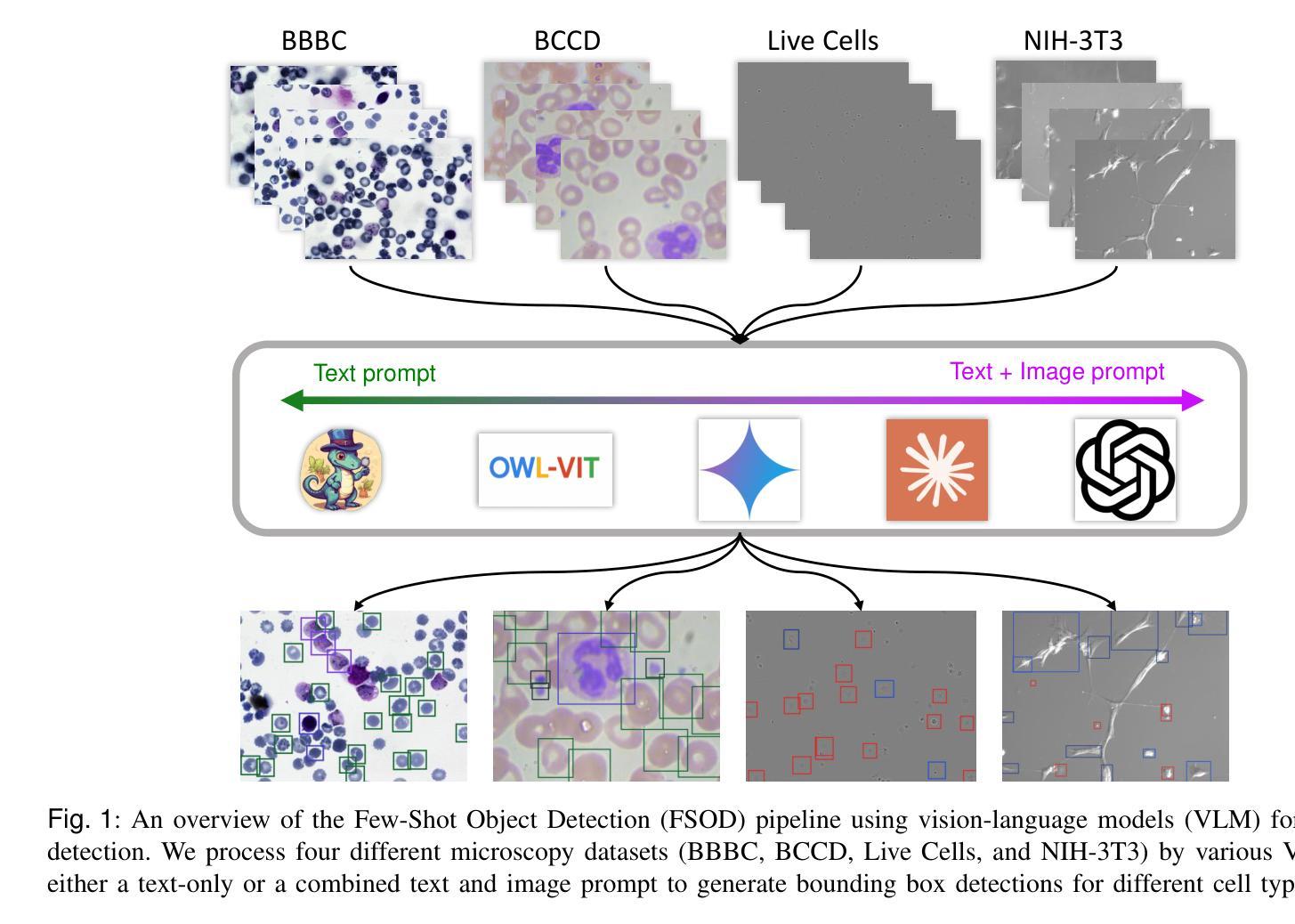 本文探讨了如何在缺乏大量标注数据集的情况下,利用上下文学习使先进的视觉语言模型(VLMs)在生物医学显微镜图像上进行少样本目标检测。研究引入了Micro-OD基准测试集,该数据集包含252张专为上下文学习策划的图像,跨越四种来源的11种细胞类型带有边界框标注。通过系统评估八种VLMs在少样本条件下的性能,并比较了带有和不带隐式测试时间推理标记的变体。此外,实施了一种混合的少样本目标检测(FSOD)管道,将检测头与基于VLM的少样本分类器相结合,提高了最近VLMs在基准测试集上的少样本性能。研究发现,由于领域差距,零样本性能较弱,但少样本支持能持续提高检测能力,六次拍摄后获得边际收益。具有推理标记的模型在端到端定位方面更有效,而更简单的变体更适合预定位裁剪的分类。总的来说,该研究强调了上下文适应在显微镜技术中的实用性,而基准测试集为推进生物医学成像中的开放词汇检测提供了可重复的实验平台。