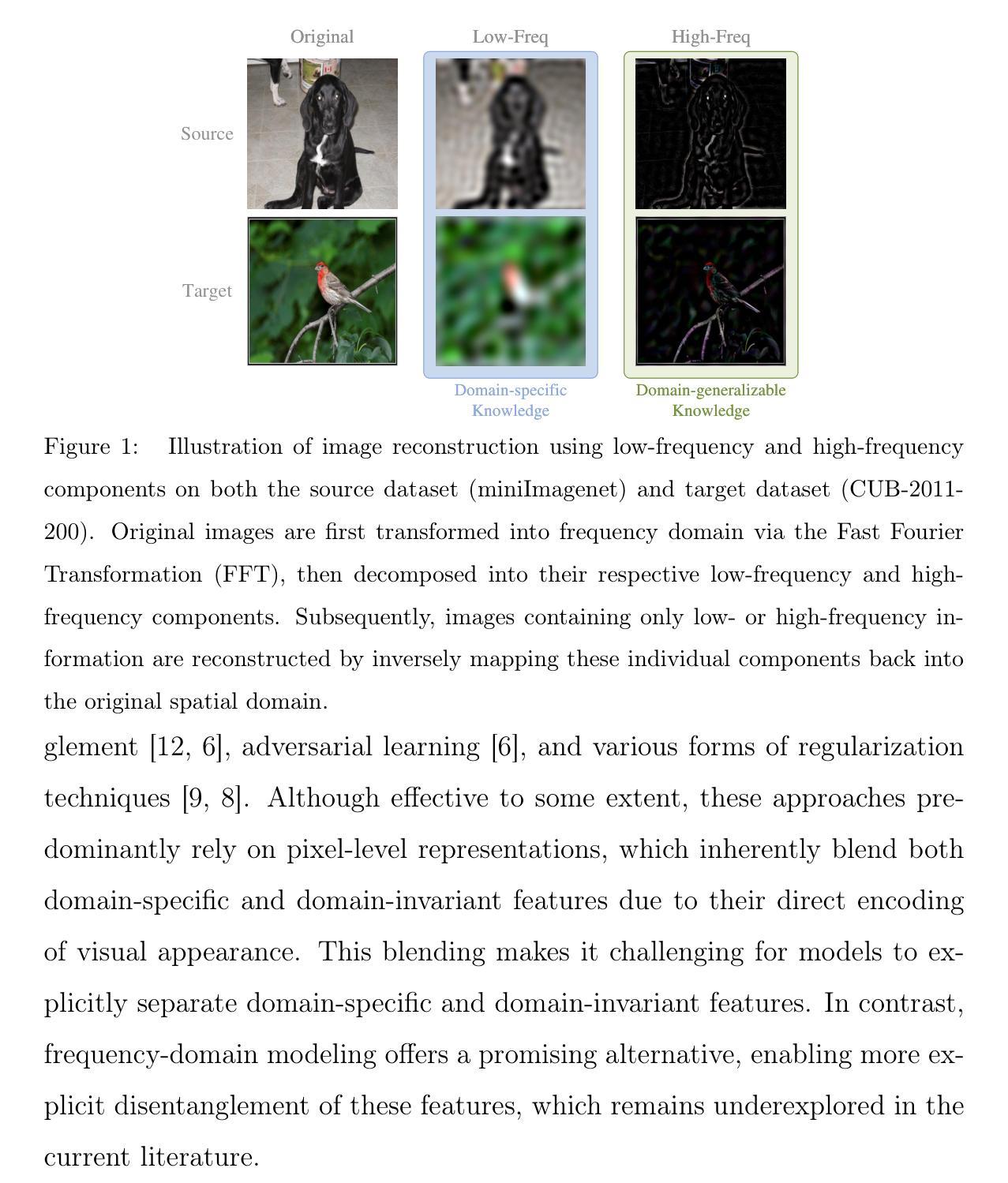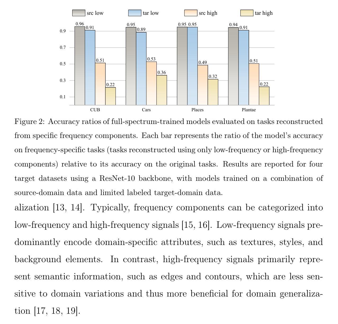 - 文章提出了两个关键挑战:模型易偏向源数据的低频部分知识,目标数据的稀缺性阻碍了高频、通用特征的学习。
