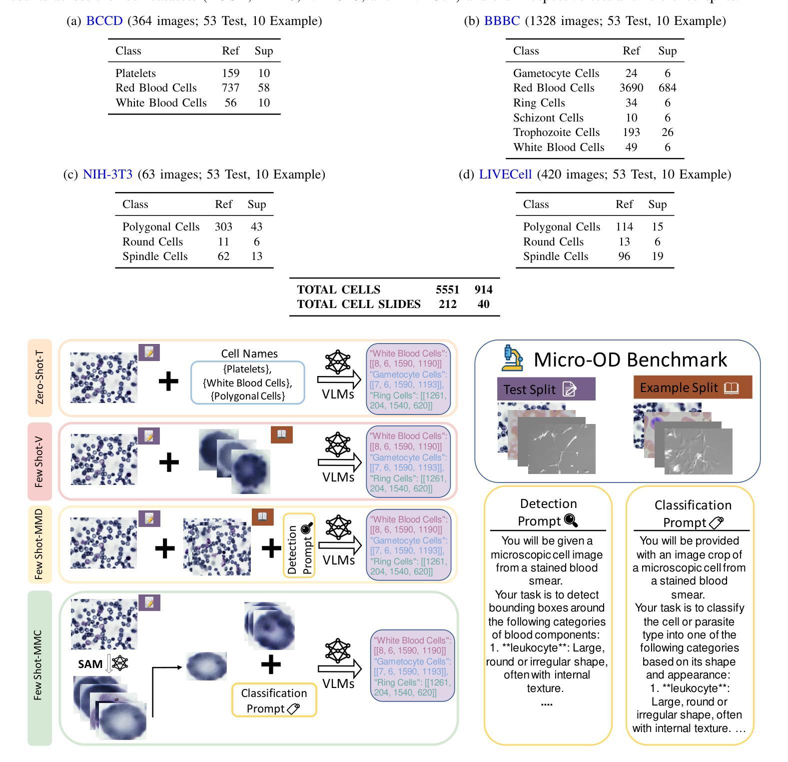视觉语言模型(VLMs)在自然图像上表现卓越,但在生物医学显微镜中的应用价值尚未得到充分探索。本文研究了上下文学习如何使最先进的VLMs在无法使用大型标注数据集的情况下进行小样本目标检测成为可能,这在显微镜图像的情况下通常是常态。我们介绍了Micro-OD基准测试,这是一个专为上下文学习准备的图像集,包含来自四个源的跨边界框标注的特定目标样本集(细胞类型)的特定子集,共计包含特定精选的252张图像。我们系统地评估了小样本条件下的八个VLMs,并比较了带有和不带隐式测试时间推理符号的变体。我们还实现了一种混合的小样本目标检测(FSOD)管道,该管道将检测头与基于VLM的小样本分类器相结合,提高了我们在基准测试上的最新VLMs的小样本性能。跨数据集观察发现,由于领域差距,零样本性能较弱;然而,小样本支持始终能提高检测能力,并在六次拍摄后实现微小收益。我们发现带有推理符号的模型更适合端到端的定位,而更简单的变体更适合预定位作物的分类。我们的结果强调了上下文适应在显微镜领域的实用性,我们的基准测试提供了一个可重复的测试平台,以推动生物医学成像中的开放词汇检测的发展。