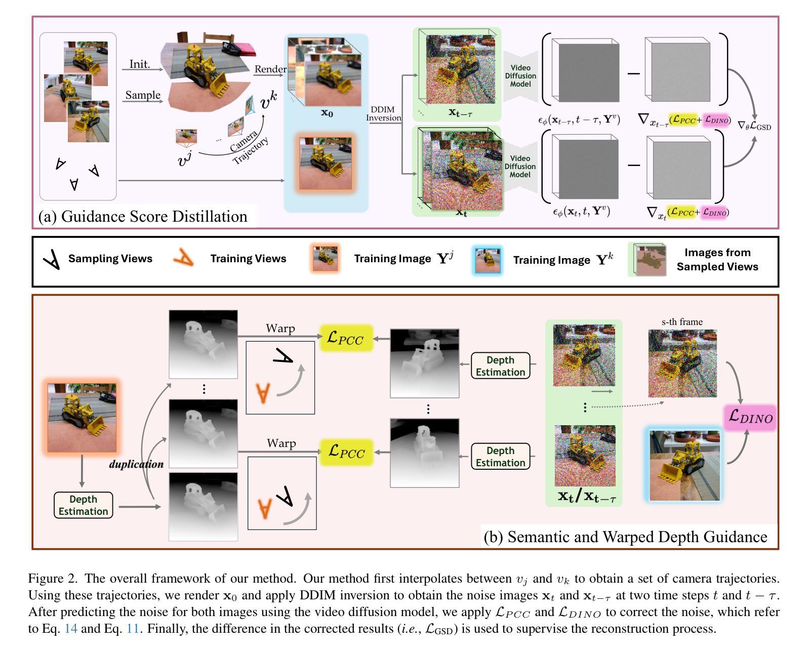 本文介绍了基于三维高斯喷溅(3DGS)和预训练的视频扩散模型(VDM)的框架,名为指导评分蒸馏(GSD)。该框架旨在解决当输入包含稀疏训练视图时,由于缺乏中间视图监督而导致过拟合的问题。文章首先引出目前面临的问题并阐述可能的挑战,如对象的运动随机和摄像机轨迹变化导致的难题,提出引入统一的指导形式来纠正VDM的噪声预测结果。通过结合基于真实深度图的深度warp指导和基于语义图像特征的指导,确保评分更新方向与正确的相机姿态和准确的几何结构保持一致。实验结果表明,该方法在多个数据集上的表现优于现有方法。