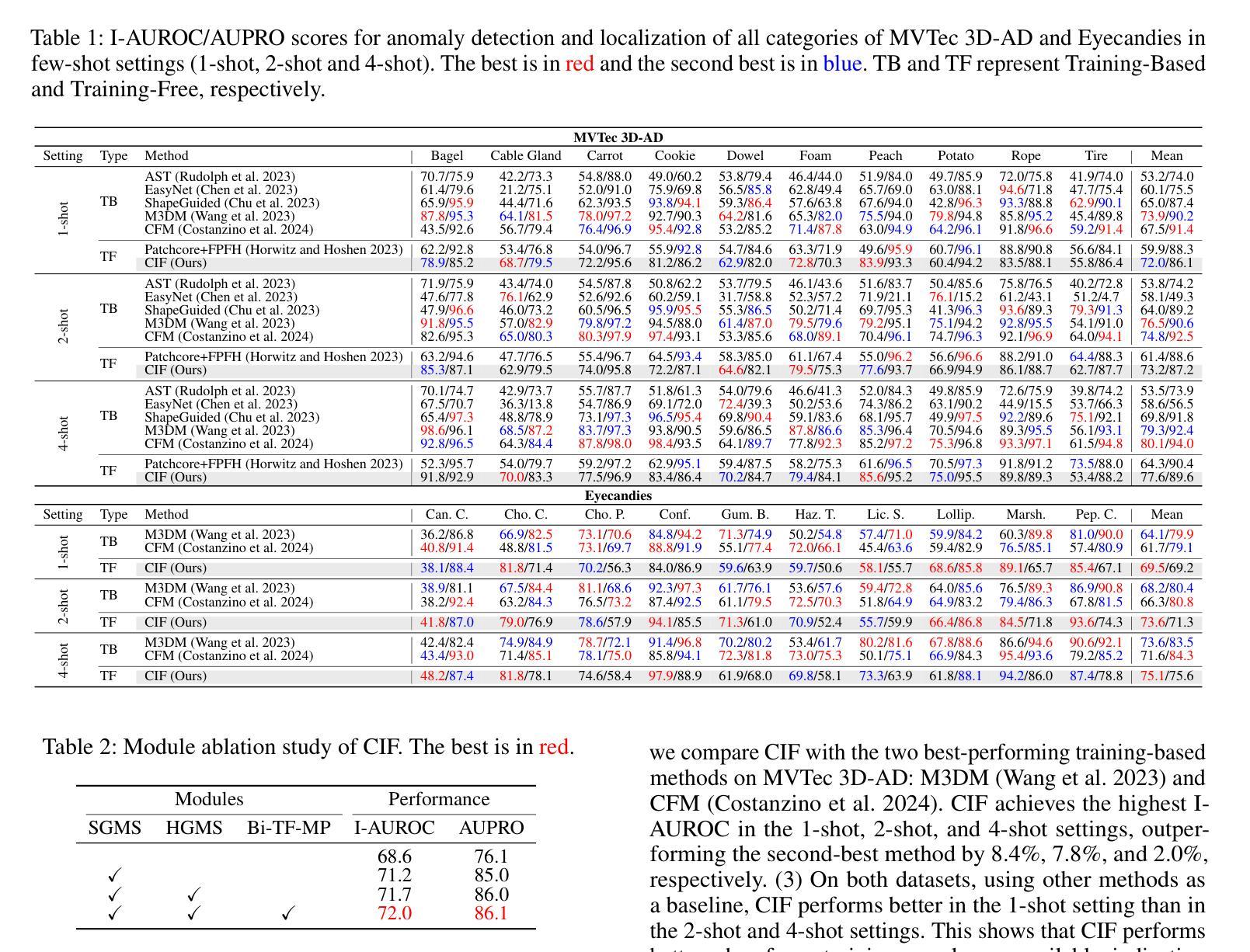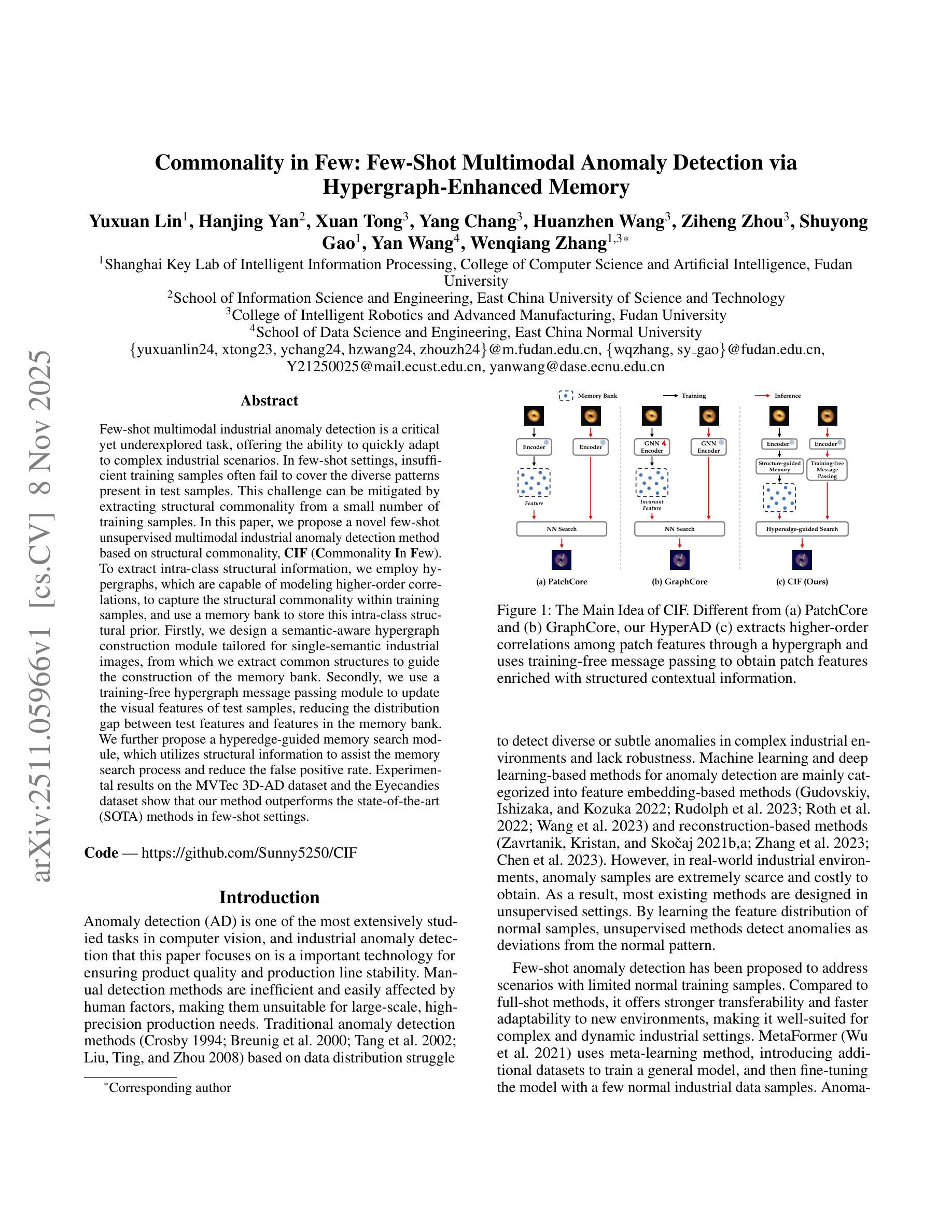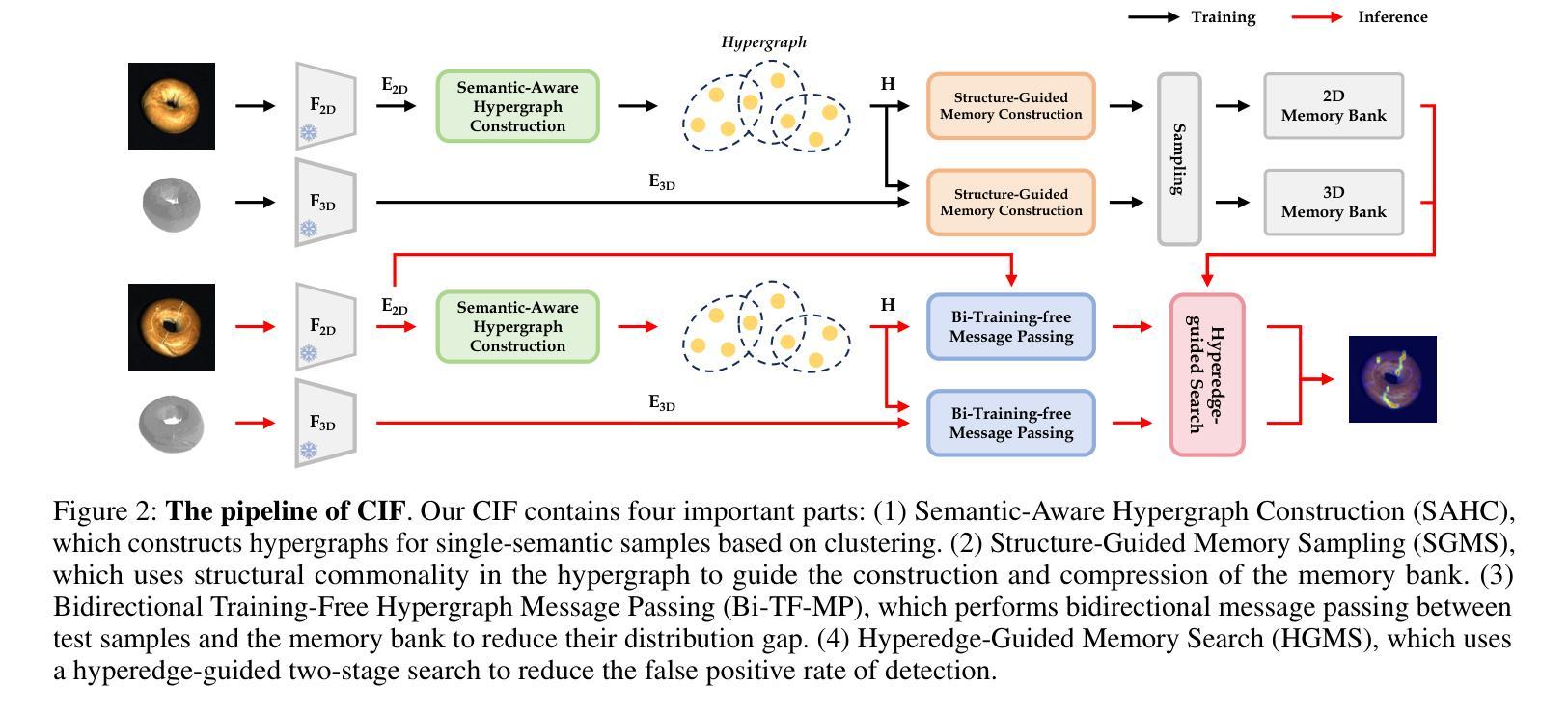本文提出一种基于结构共性(CIF)的少数样本无监督多模态工业异常检测方法。通过构建超图模型捕捉训练样本中的结构共性,并存储于内存银行中。利用超图消息传递模块更新测试样本的视觉特征,缩小测试特征与内存银行特征间的分布差距。同时,通过超边引导的内存搜索模块降低误报率。在MVTec 3D-AD和Eyecandies数据集上的实验结果表明,该方法在少数样本条件下优于现有技术。