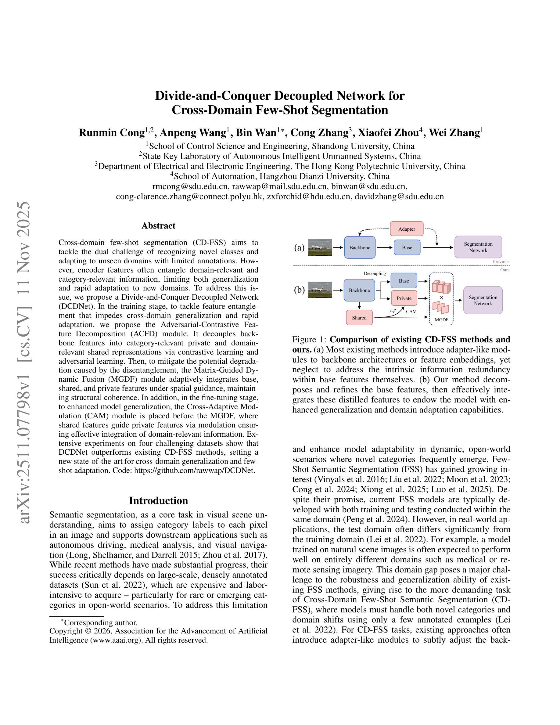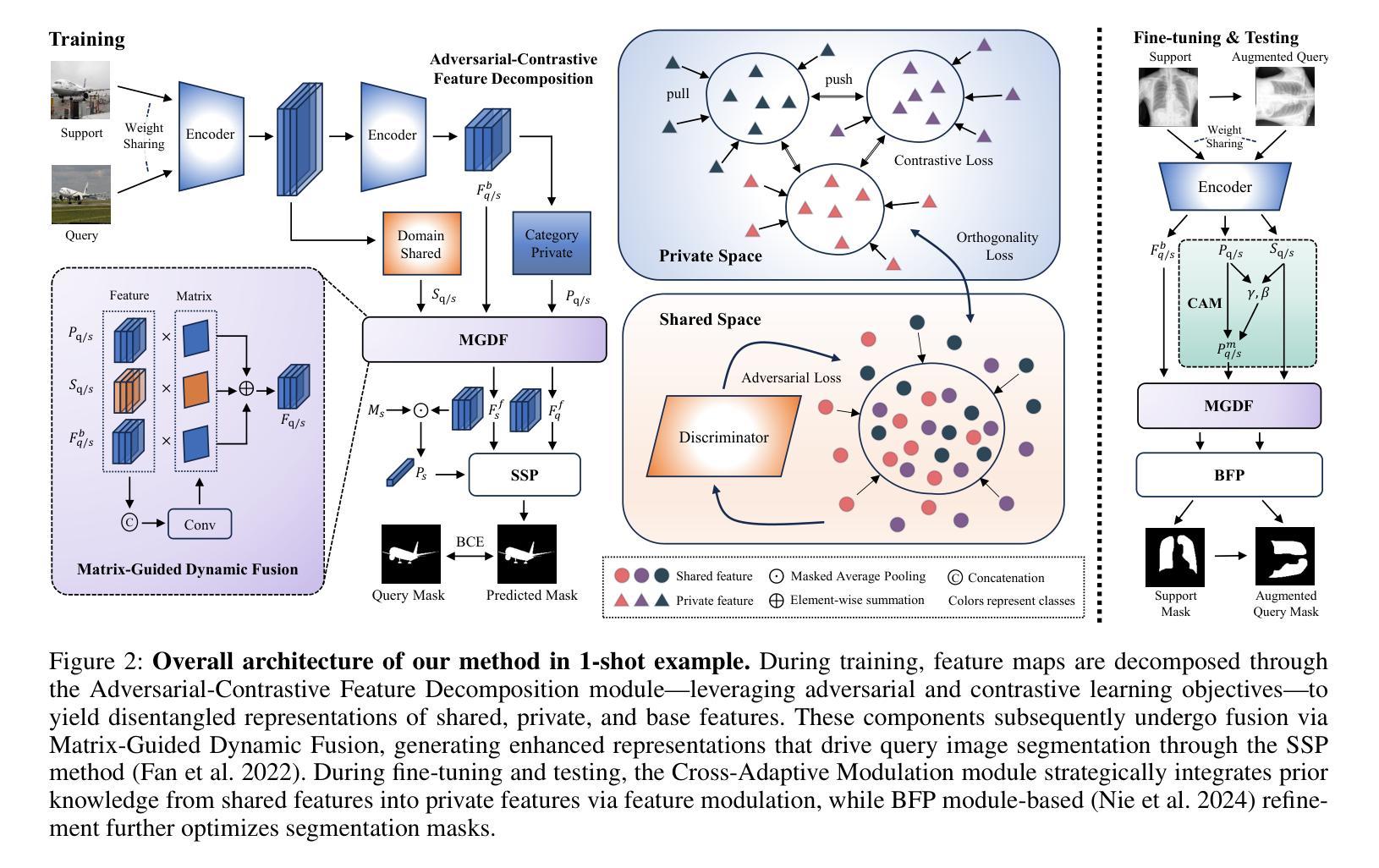 跨域小样本分割(CD-FSS)旨在应对识别新类别和适应未见域的双挑战,同时仅使用有限的标注。然而,编码器特征经常混淆与域相关和与类别相关的信息,限制了泛化和快速适应新域的能力。为了解决这一问题,我们提出了分而治之解耦网络(DCDNet)。在训练阶段,为了解决阻碍跨域泛化和快速适应的特征纠缠问题,我们提出了对抗性对比特征分解(ACFD)模块。它通过对比学习和对抗学习将主干特征解耦为与类别相关的私有表示和与域相关的共享表示。然后,为了减轻解耦可能带来的潜在退化问题,矩阵引导动态融合(MGDF)模块在空间引导下自适应地融合基础、共享和私有特征,保持结构连贯性。此外,在微调阶段,为了增强模型的泛化能力,在MGDF之前放置了跨自适应调制(CAM)模块,其中共享特征通过调制引导私有特征,确保有效整合域相关信息。在四个具有挑战性的数据集上的广泛实验表明,DCDNet超越了现有的CD-FSS方法,为跨域泛化和小样本适应设定了新的最新技术状态。