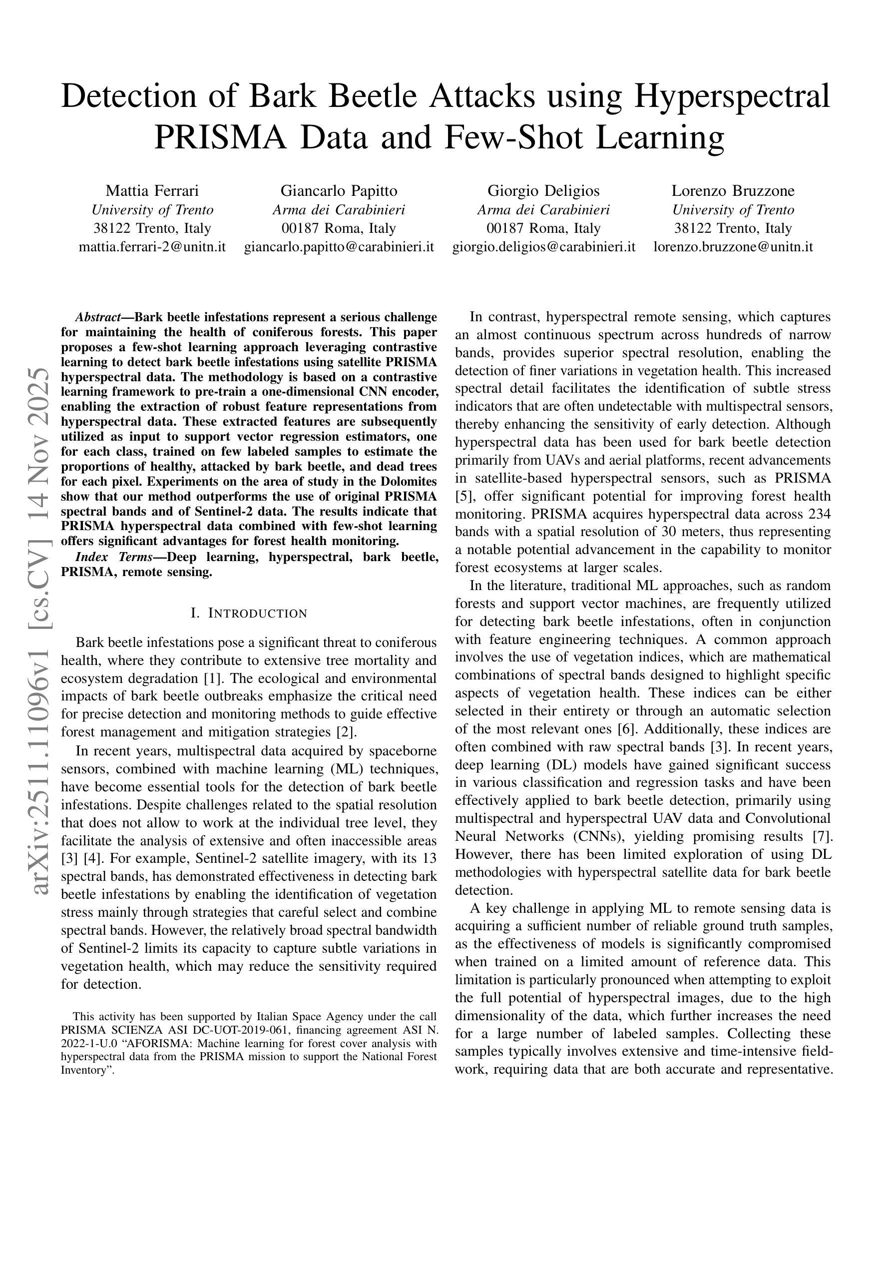 本文提出了一种利用对比学习进行少数样本学习的检测方法,用于利用卫星PRISMA高光谱数据检测树皮甲虫入侵情况。通过对比学习框架训练一维CNN编码器,提取高光谱数据的稳健特征表示。这些特征随后被用作支持向量回归估计器的输入,对每个像素的健康树木、树皮甲虫攻击和死树比例进行估计。在Dolomites研究区域的实验表明,该方法优于使用原始PRISMA光谱波段和Sentinel-2数据的方法,显示出PRISMA高光谱数据与少数样本学习相结合在森林健康监测中的显著优势。