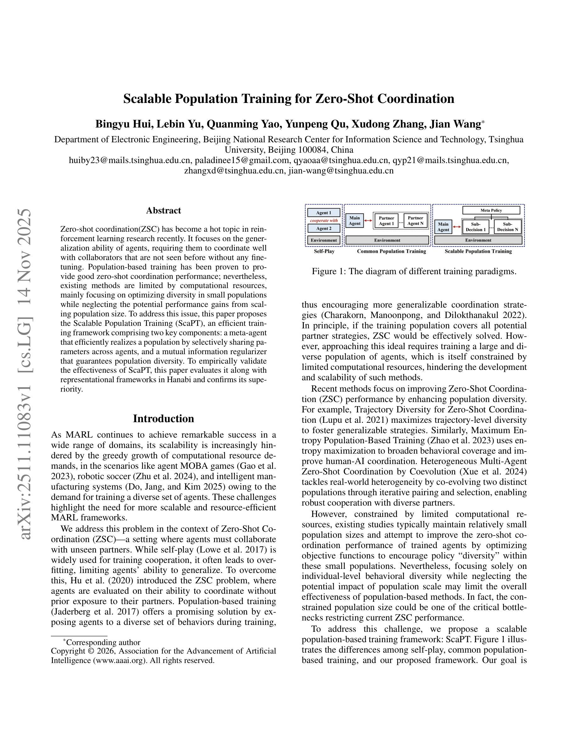 零样本协调(ZSC)是强化学习研究领域的热门话题。它关注代理的泛化能力,要求它们能与未见过的合作伙伴进行良好协调,无需微调。基于种群训练已被证明能提供出色的零样本协调性能,但现有方法受限于计算资源,主要关注小种群的多样性优化,而忽视了扩大种群规模可能带来的性能提升。针对这一问题,本文提出可扩展种群训练(ScaPT)这一高效训练框架,包括两个关键组成部分:能高效实现种群选择性共享参数的元代理和保证种群多样性的互信息调节器。通过实证评估,本文在Hanabi中的代表性框架下验证了ScaPT的有效性,并确认了其优越性。
