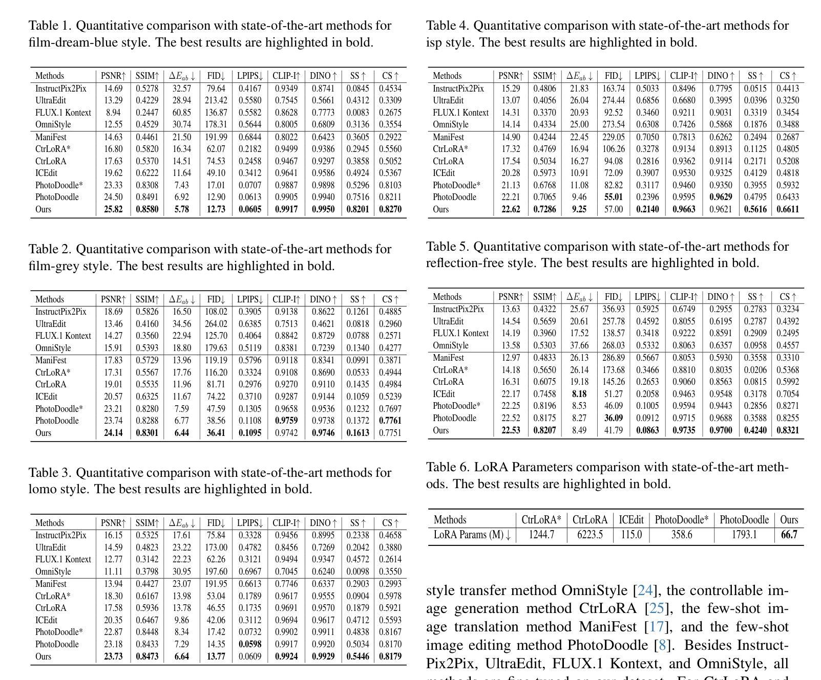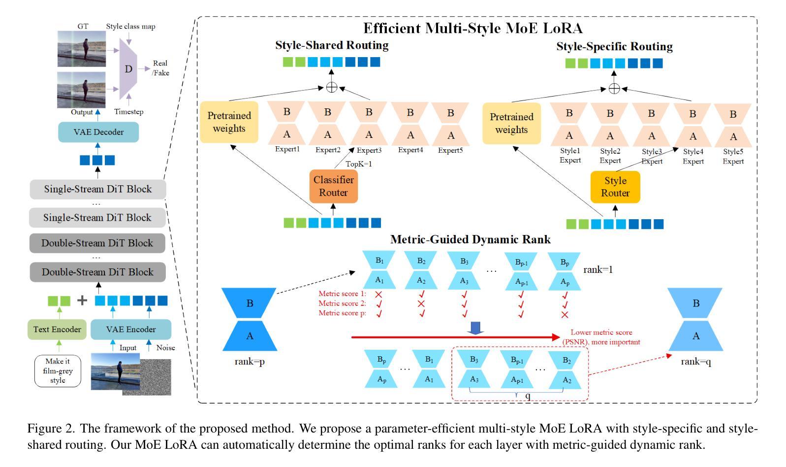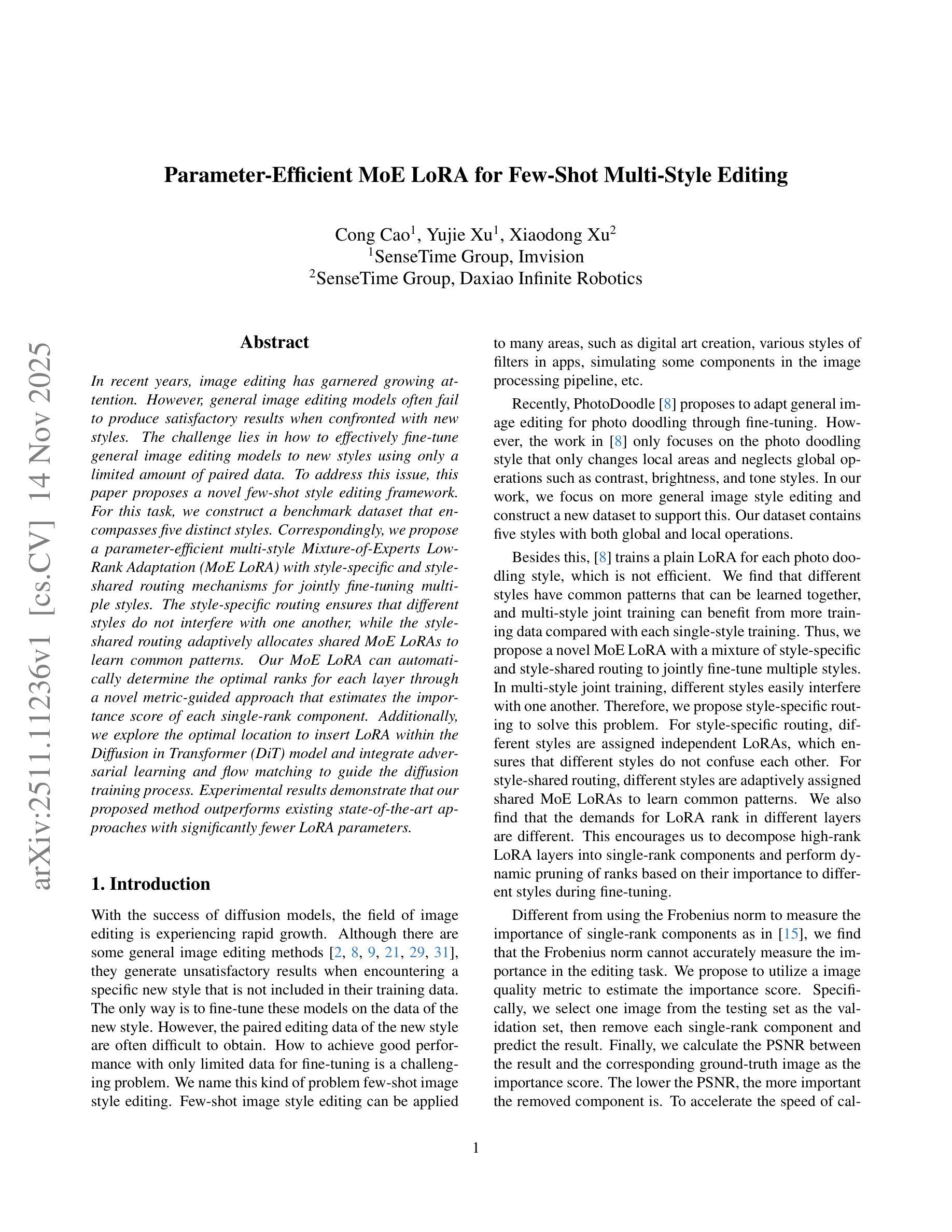 近期图像编辑领域备受关注,但一般图像编辑模型面对新风格时效果不佳。针对使用有限配对数据对新风格进行微调的问题,本文提出一种新型少样本风格编辑框架。构建包含五种不同风格的基准数据集,并提出参数高效的多风格混合专家低秩适应(MoE LoRA)方法,包含风格特定和风格共享路由机制,用于联合微调多种风格。风格特定路由确保不同风格互不干扰,而风格共享路由则自适应分配共享MoE LoRA学习共同模式。MoE LoRA可自动确定每层的最佳秩次,通过新型指标引导方法估算各单秩成分的重要性得分。此外,本文探讨在扩散变压器模型中的最佳位置插入LoRA,并结合对抗学习与流匹配引导扩散训练过程。实验结果表明,所提方法优于现有先进技术,且LoRA参数更少。