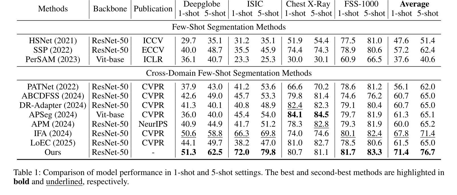 - 在四个具有挑战性的数据集上的实验表明,DCDNet的性能超过了现有的CD-FSS方法。