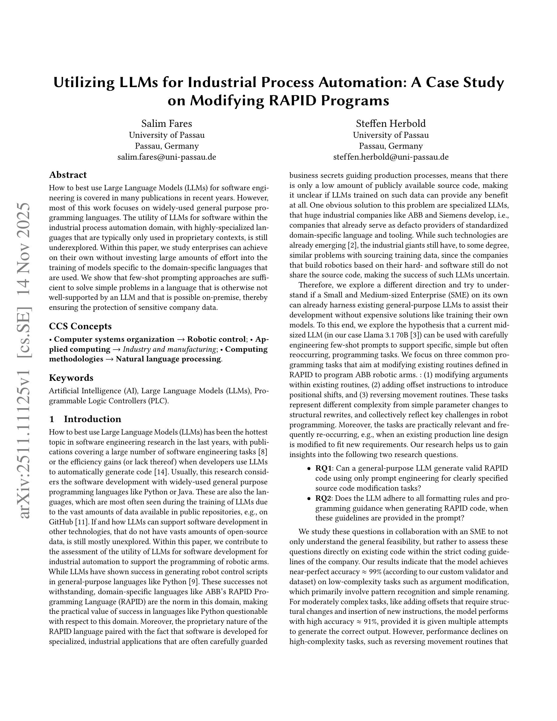 大型语言模型(LLMs)在软件工程中的应用近年来备受关注,但大多数研究集中在通用编程语言上。针对工业过程自动化领域中的专有语境和高度专业化的语言,LLMs在软件方面的应用仍然缺乏研究。本文研究了企业如何在不需要为特定领域语言训练模型的情况下,利用少量提示解决简单问题,实现LLMs在该领域的应用,同时保护敏感的公司数据。