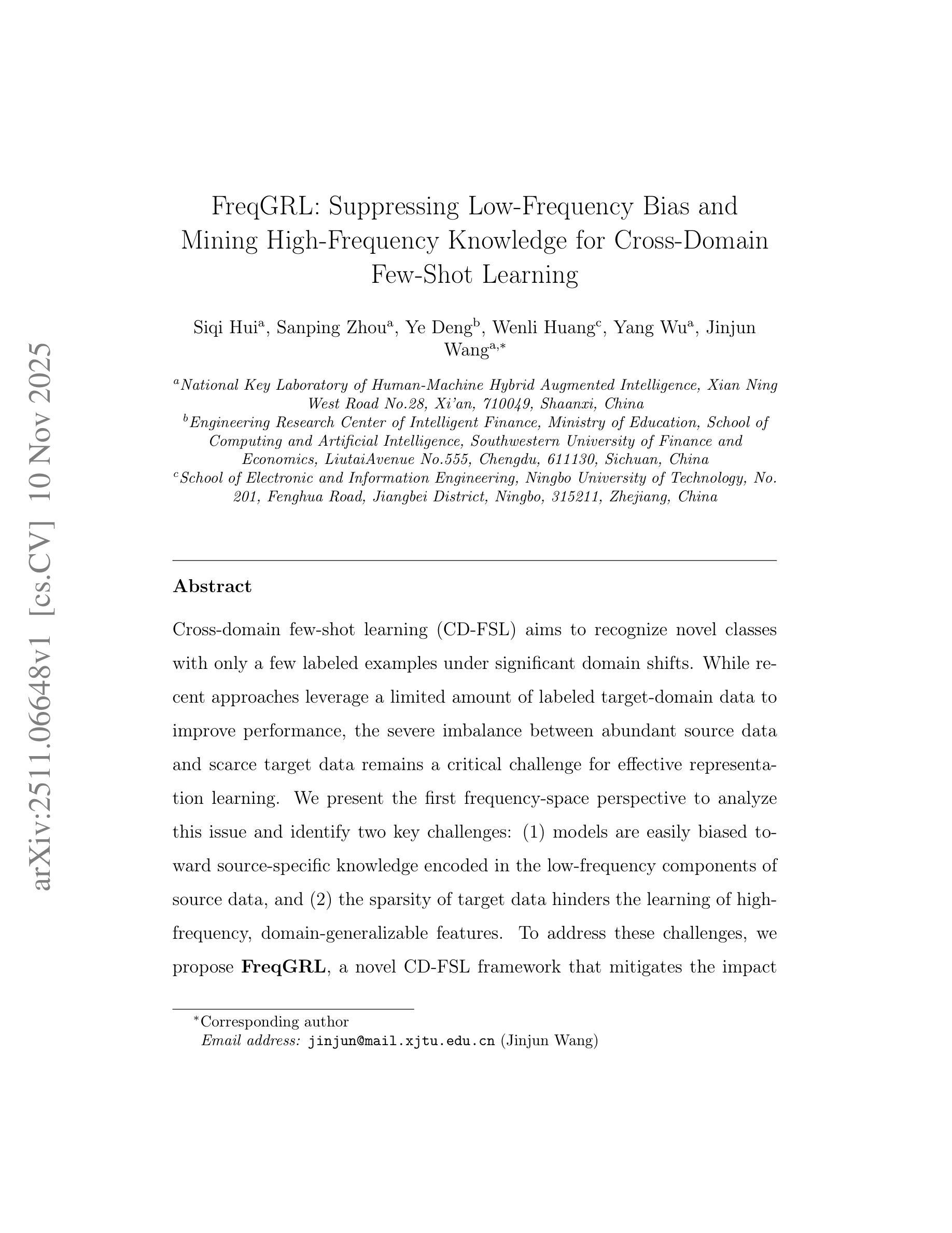 本文介绍了跨域小样学习(CD-FSL)领域的一个重要挑战,即在显著域迁移下如何仅通过少量标记样本识别新型类别。为解决源数据量大而目标数据量稀缺的不平衡问题,文章首次从频率空间角度进行分析,并提出两个关键挑战。为应对这些挑战,提出了名为FreqGRL的新框架,该框架包括低频替代(LFR)、高频增强(HFE)和全局频率滤波器(GFF)等模块,以提高跨域泛化能力,实现少样本下的新型类别识别。通过大量实验验证,该频率引导框架在五个标准CD-FSL基准测试中取得了最佳性能。