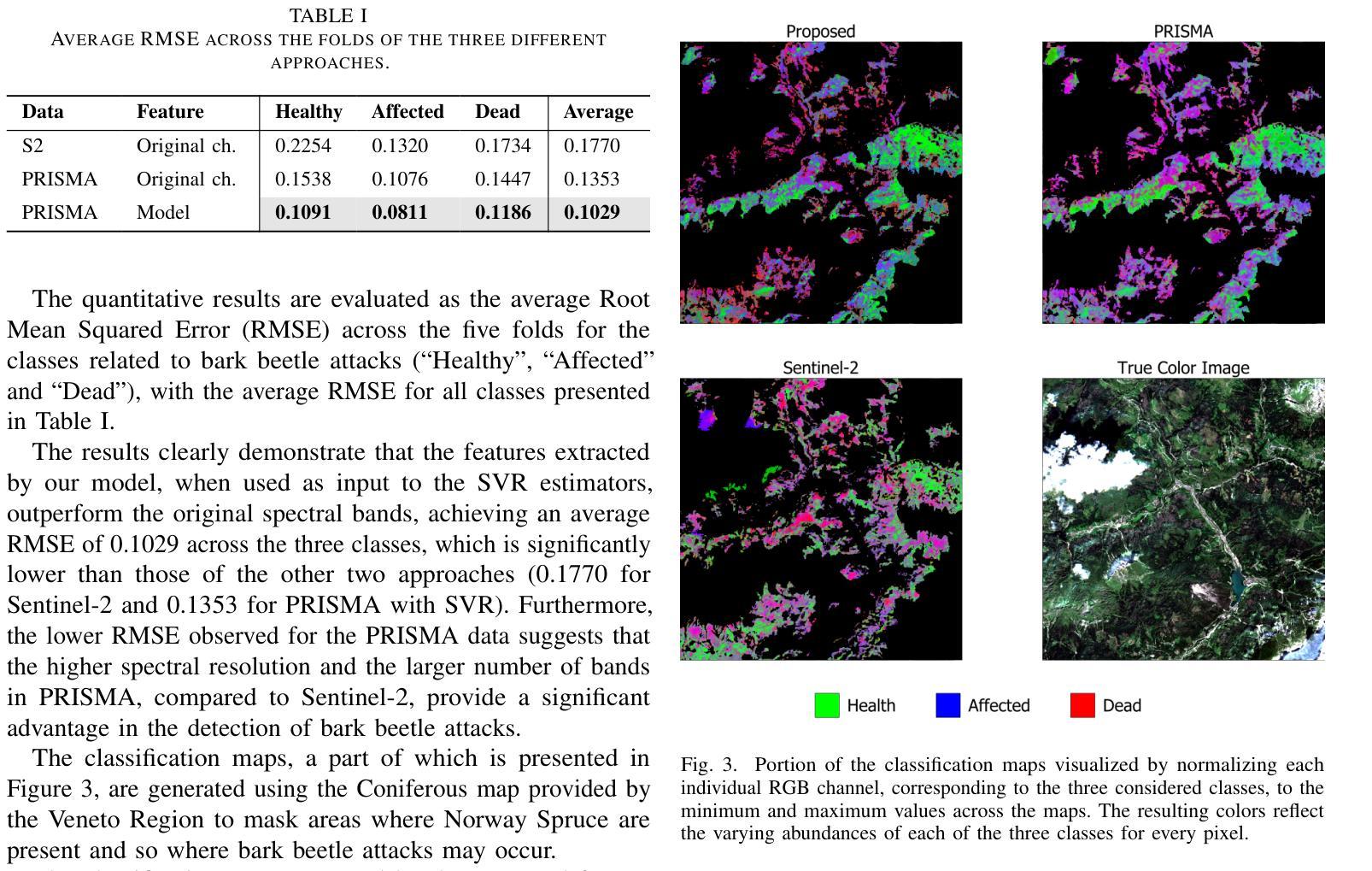 树皮甲虫入侵对维护针叶林健康构成严峻挑战。本文提出了一种利用对比学习进行树皮甲虫入侵检测的少样本学习方法,并使用卫星PRISMA高光谱数据来实现。该方法基于对比学习框架,对一维CNN编码器进行预训练,能够从高光谱数据中提取稳健的特征表示。这些提取的特征随后被用作支持向量回归估计器的输入,为每个类别训练少量的标记样本,以估计每个像素中健康树木、被树皮甲虫攻击树木和死树的比例。在多多洛米茨研究区域的实验表明,我们的方法优于使用原始的PRISMA光谱波段和Sentinel-2数据的方法。结果表明,PRISMA高光谱数据与少样本学习相结合,在森林健康监测方面具有显著优势。