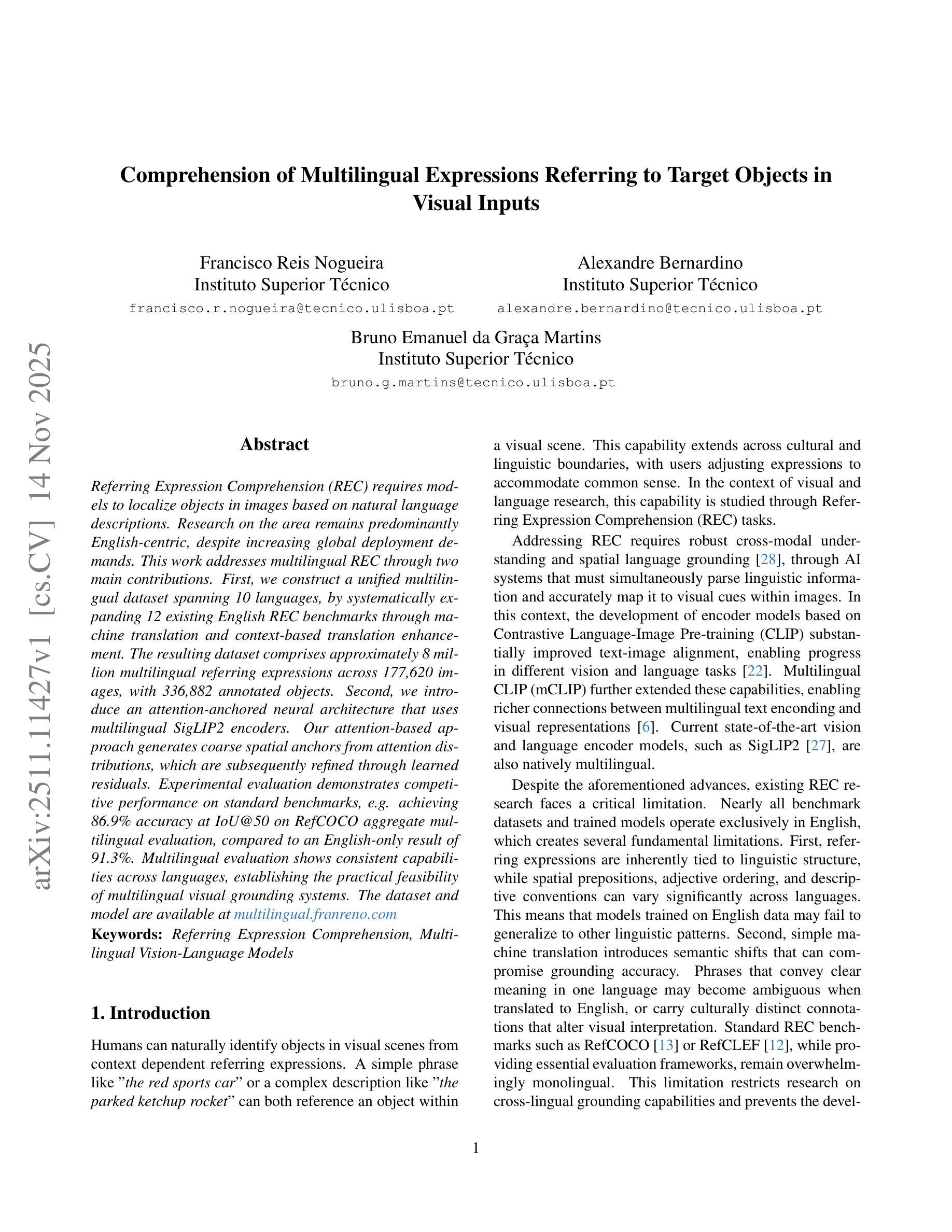 指代表达式理解(REC)要求模型根据自然语言描述在图像中定位对象。尽管全球部署需求不断增加,但该领域的研究仍以英语为中心。这项工作通过两个主要贡献解决了多语言REC问题。首先,我们通过机器翻译和基于上下文的翻译增强法,系统地扩展了12个现有的英语REC基准测试,构建了一个统一的多语言数据集,涵盖10种语言。该数据集包含约800万条多语言指代表达式,跨越177620张图像,带有336882个注释对象。其次,我们引入了一种以注意力为中心的神经网络架构,该架构使用多语言SigLIP2编码器。我们的基于注意力的方法会产生粗略的空间锚点,这些锚点是从注意力分布中生成的,并通过学习残差进行改进。实验评估表明,在标准基准测试上的表现具有竞争力,例如在RefCOCO综合多语言评估中,IoU@50的准确度达到86.9%,而仅使用英语的结果为91.3%。多语言评估表明,不同语言的实用功能保持一致,证明了多语言视觉定位系统的实际可行性。数据集和模型可在multilingual.franreno.com获取。