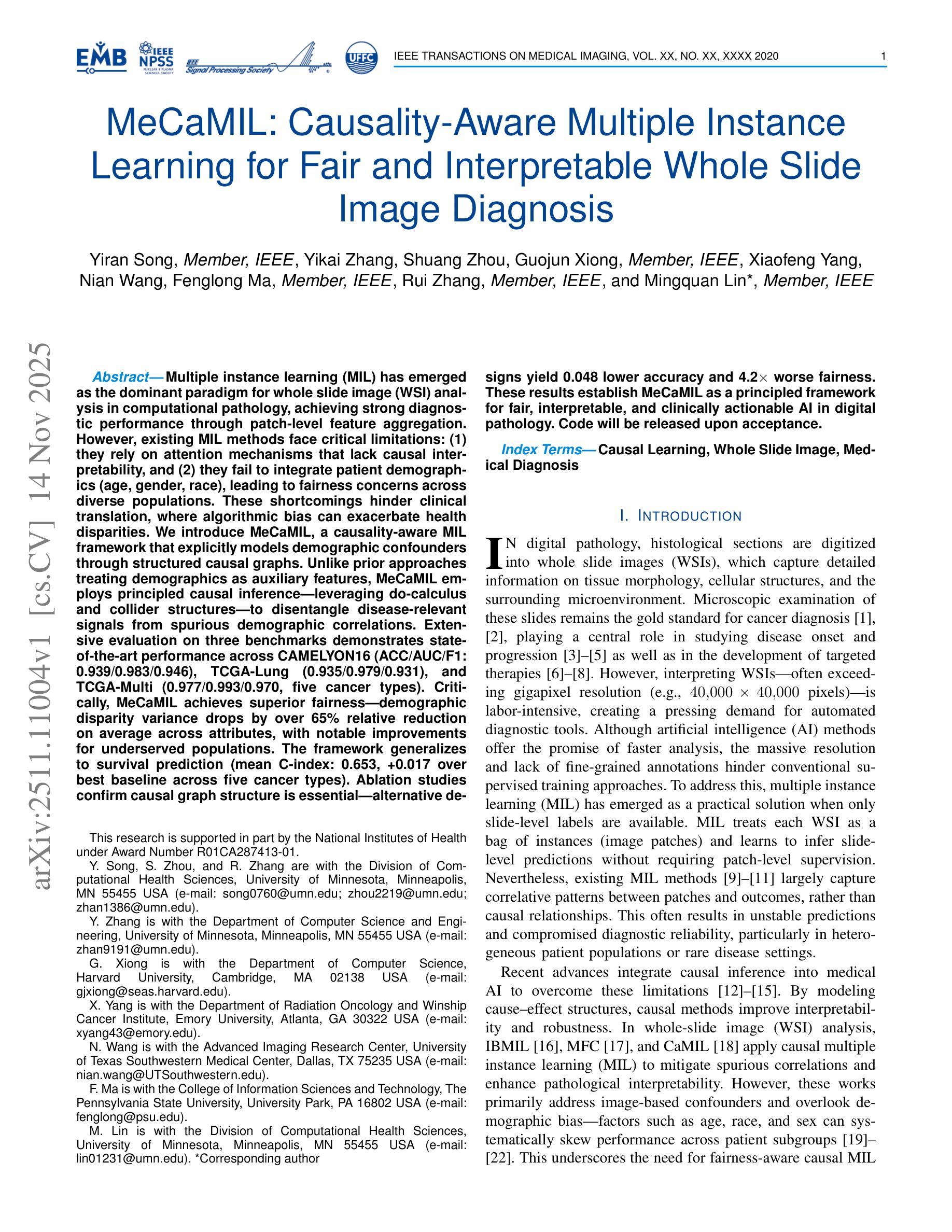 多任务学习(MIL)已成为计算病理学全幻灯片图像(WSI)分析的主导范式,通过补丁级别的特征聚合实现了强大的诊断性能。然而,现有的MIL方法面临关键局限性:(1)它们依赖于缺乏因果解释性的注意机制;(2)未能整合患者人口统计学信息(如年龄、性别、种族),导致不同人群之间存在公平性问题。这些缺点阻碍了临床翻译,算法偏见可能会加剧健康差异。我们引入了因果感知MIL框架MeCaMIL,它通过结构因果图显式建模人口统计学混杂因素。不同于以前将人口统计学作为辅助特征处理的方法,MeCaMIL采用有原则的因果推理——利用do计算和碰撞器结构——来分离疾病相关信号,消除与人口统计学特征的偶然相关性。在CAMELYON16、TCGA-Lung和TCGA-Multi三个基准测试上的广泛评估表明,MeCaMIL在性能上达到了最新水平(CAMELYON16的准确率/曲线下面积/F1分数为:0.939/0.983/0.946;TCGA-Lung为:0.935/0.979/0.931;TCGA-Multi涵盖五种癌症类型的为:0.977/0.993/0.970)。最重要的是,MeCaMIL在公平性方面表现更优越——人口统计学差异的方差在属性上平均降低了超过65%的相对减少,对服务不足的人群有明显的改进。该框架可推广到生存预测(平均C指数为:0.653,相较于涵盖五种癌症类型的最佳基线模型高出+0.017)。消融研究证实因果图结构至关重要——其他设计产生了降低0.048的准确率和4.2倍的公平性。这些结果确立了MeCaMIL在数字病理学中公平、可解释和临床可操作的人工智能的有原则框架。代码将在接受后发布。