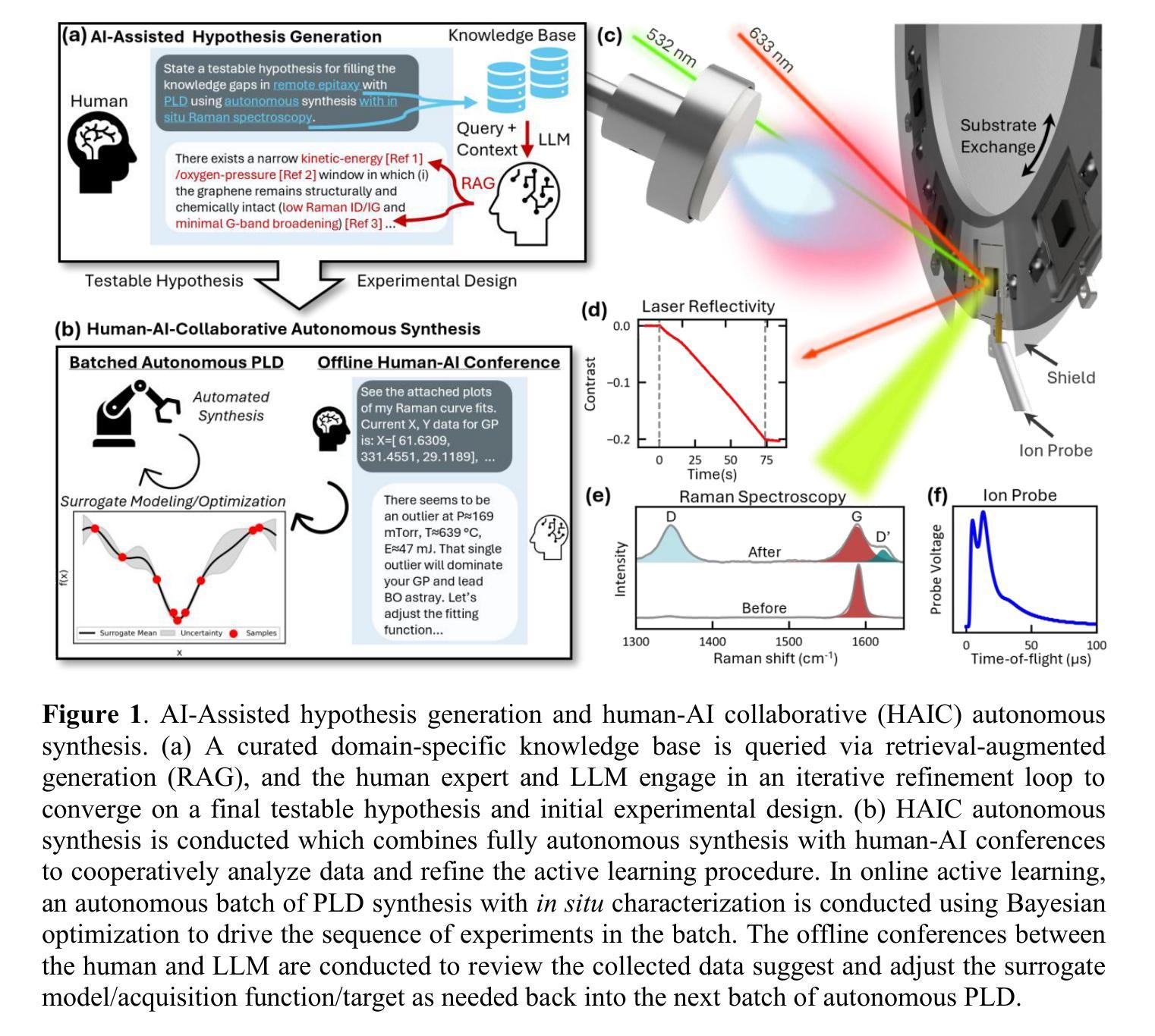 人工智能(AI)实验室中通常需要借助大数据来进行决策,但仍需专家知识的辅助,让人类与AI紧密合作是关键。本文介绍了一种人机协同工作流程(HAIC),它结合了大型语言模型进行假设生成和分析,通过协同政策更新驱动自主脉冲激光沉积(PLD)实验。人机协同能加速实验设计过程并发现生长空间和石墨烯损伤的关联。然而高能量光束对石墨烯具有破坏性影响。为了在不影响巴钙钛晶型层的情况下实现单层石墨烯剥离,需要一个两步的Ar/O²沉积过程。这项研究展现了人机协同工作在推动科学进步方面的潜力。