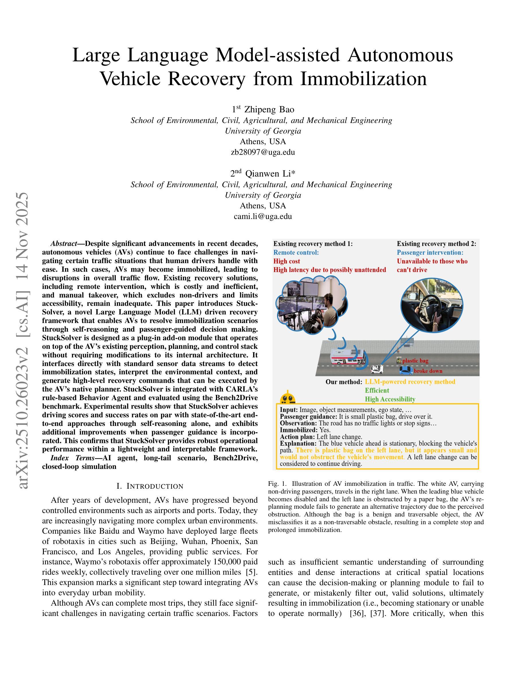 尽管近几十年来取得了重大进展,自主车辆(AVs)在导航某些交通场景时仍然面临挑战,这些场景是人类驾驶员擅长的领域。在这种情况下,自主车辆经常会失去机动能力,从而破坏整体的交通流量。目前的恢复解决方案,如远程干预(成本高昂且效率低下)和手动接管(排除非驾驶员并限制AV的可用性),都不足以应对挑战。本文介绍了StuckSolver,这是一种新型的大型语言模型(LLM)驱动的恢复框架,它能够使自主车辆通过自我推理和(或)乘客指导的决策制定来解决失去机动能力的情况。StuckSolver被设计为一个插件附加模块,它在自主车辆现有的感知-规划-控制堆栈上运行,无需对其内部架构进行任何修改。相反,它与标准传感器数据流接口,以检测失去机动能力的状态,解释环境上下文,并生成可以由自主车辆的本地规划器执行的高级恢复命令。我们在Bench2Drive基准测试和自定义设计的不确定性场景中对StuckSolver进行了评估。结果表明,StuckSolver通过自主的自我推理实现了近乎最新的性能水平,并且在融入乘客指导时表现出进一步的改进。