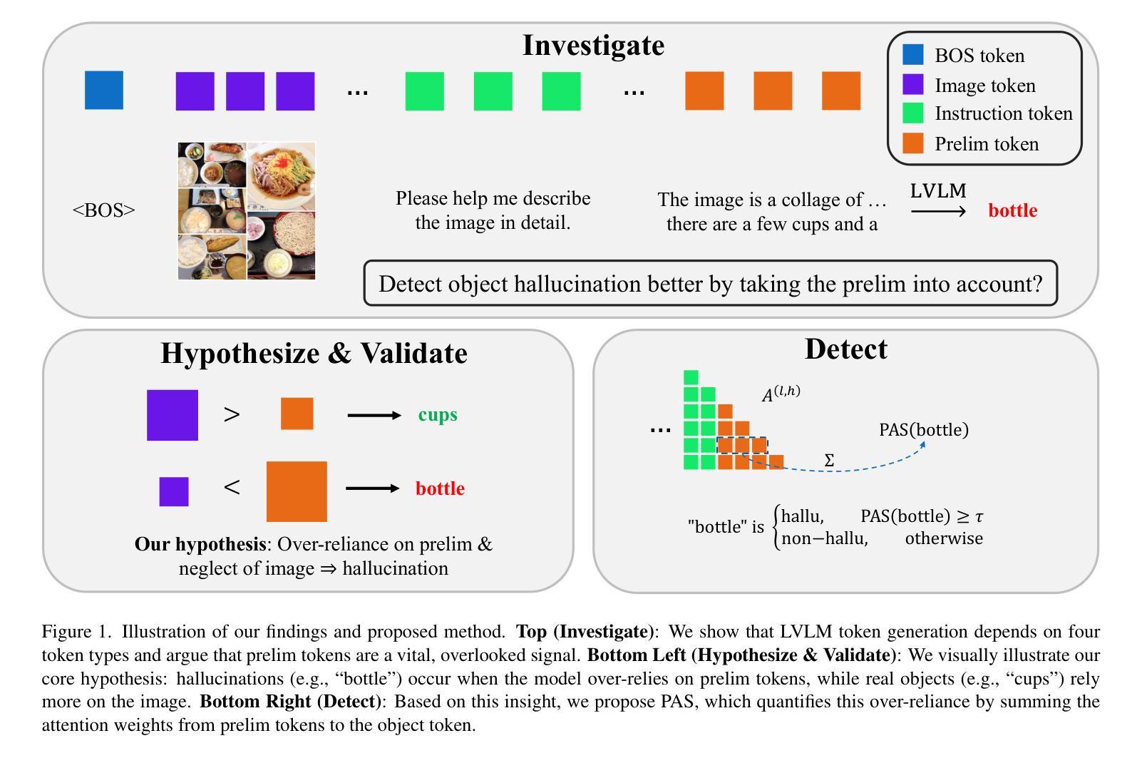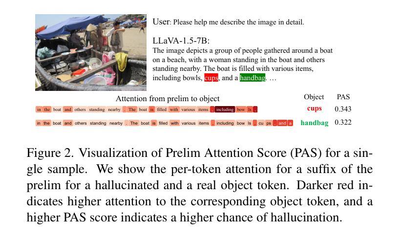 Summary:大型视觉语言模型(LVLMs)虽然强大,但由于物体幻觉现象而不够可靠。本研究发现,在许多幻觉预测中,LVLM实际上忽略了图像,而是依赖于先前生成的输出(初步)令牌来推断新物体。通过初步令牌与预测物体之间的互信息来衡量这种行为,发现弱图像依赖与幻觉之间存在强烈的相关性。在此基础上,我们引入了初步注意力得分(PAS),这是一种轻量级的、无需训练的信号,通过计算初步令牌上的注意力权重得到。PAS无需额外的前向传递,可以在推理过程中实时计算。利用这一以前被忽视的信号,PAS在多个模型和数据集上实现了物体幻觉检测的最佳性能,能够实现实时过滤和干预。
