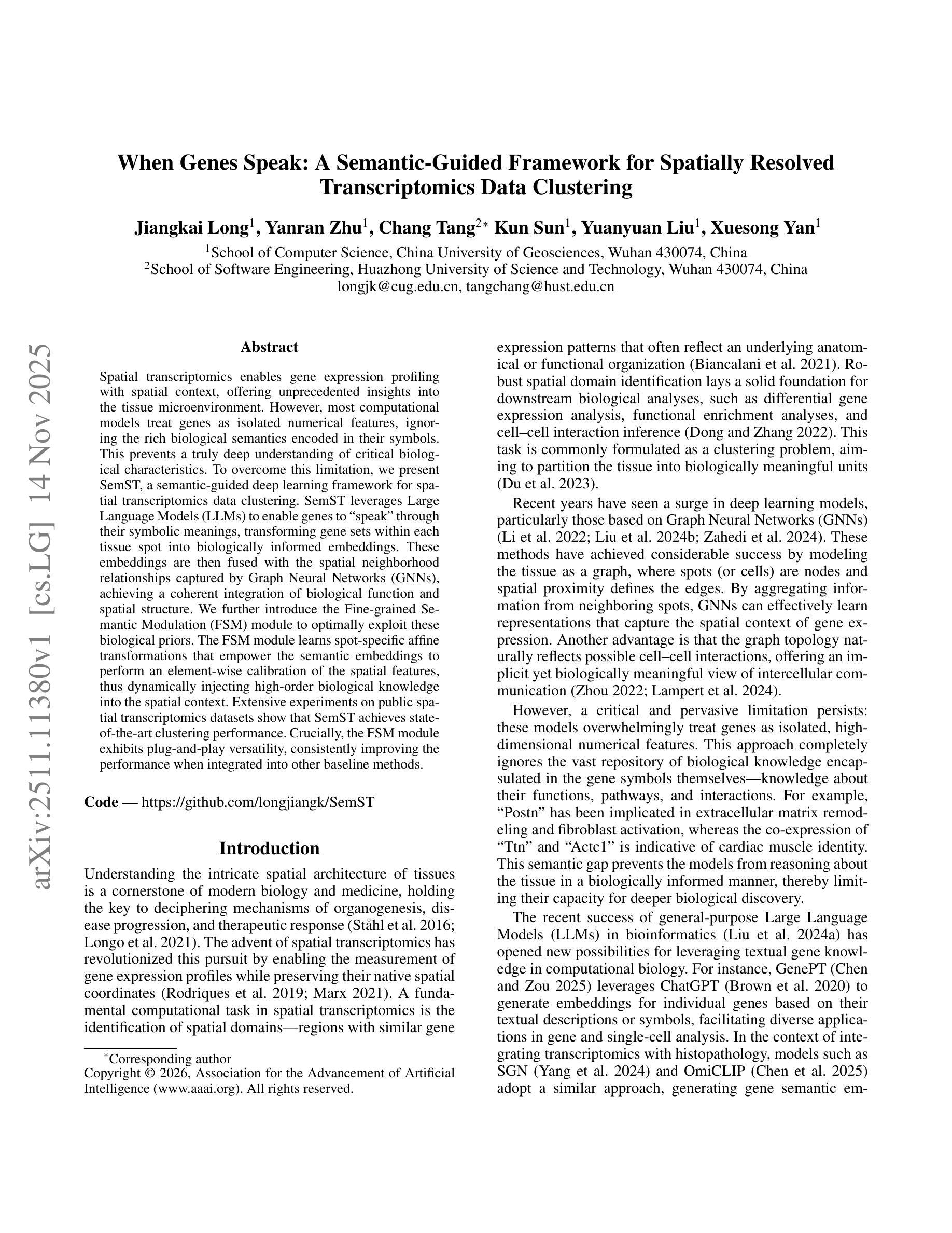 空间转录组学能够通过空间上下文进行基因表达谱分析,为组织微环境提供了前所未有的洞察。然而,大多数计算模型将基因视为孤立的数值特征,忽略了其符号中所蕴含的丰富生物学语义。这阻碍了我们对关键生物学特性的真正深入理解。为了克服这一局限性,我们提出了SemST,这是一个用于空间转录组学数据聚类的语义引导深度学习框架。SemST利用大型语言模型(LLM)使基因能够通过其符号意义“说话”,将每个组织斑点内的基因集转化为生物学信息嵌入。然后,这些嵌入与图神经网络(GNN)捕获的空间邻域关系融合,实现了生物功能与空间结构的连贯融合。我们还引入了精细语义调制(FSM)模块,以最优方式利用这些生物学先验。FSM模块学习特定于斑点的仿射变换,使语义嵌入能够执行空间特征的点校,从而动态注入高阶生物学知识到空间上下文中。在公共空间转录组学数据集上的广泛实验表明,SemST达到了最先进的聚类性能。关键的是,FSM模块表现出即插即用的通用性,在集成到其他基准方法时始终提高了性能。