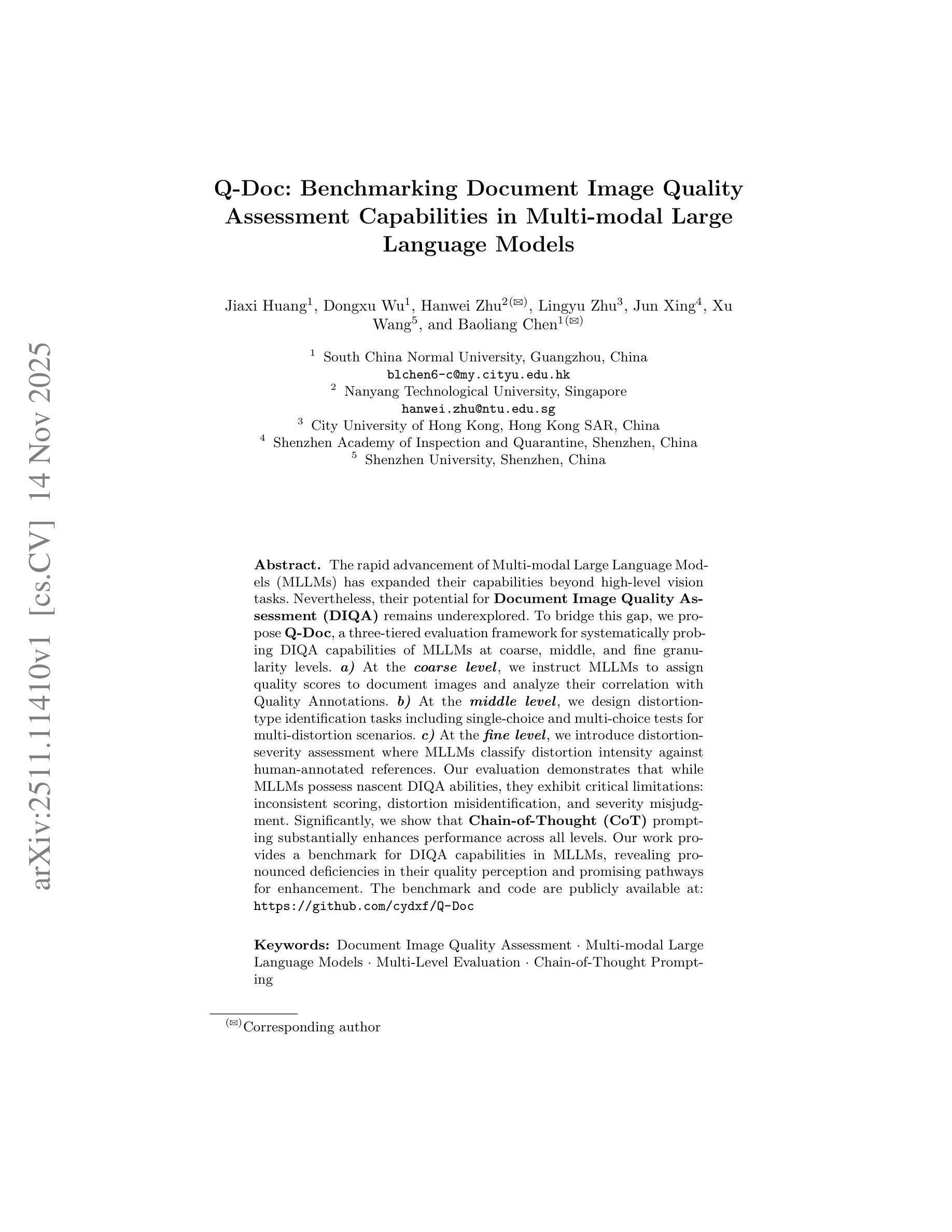多模态大型语言模型(MLLMs)的快速发展使其能力超越了高级视觉任务。然而,它们在文档图像质量评估(DIQA)方面的潜力尚未得到充分探索。为了填补这一空白,我们提出了Q-Doc,这是一个用于系统探测MLLMs在DIQA方面的能力的三层评估框架,包括粗略、中等和精细粒度级别。首先,在粗略级别上,我们指导MLLMs给文档图像分配质量分数,并分析其与质量注释的相关性。其次,在中等水平上,我们设计了对失真类型进行识别的任务,包括针对多种失真场景的单一选择和多项选择测试。最后,在精细水平上,我们引入了失真严重程度评估,其中MLLMs根据人类注释的参考来分类失真的强度。我们的评估表明,虽然MLLMs具有新兴的DIQA能力,但它们存在关键局限:评分不一致、失真识别错误和严重程度判断错误。值得注意的是,我们表明“思维链”(CoT)提示显著提高了所有级别的性能。我们的工作为MLLMs的DIQA能力提供了基准测试,揭示了它们在质量感知方面的明显缺陷,并指出了增强性能的潜在途径。基准测试和代码可在https://github.com/cydxf/Q-Doc上公开访问。