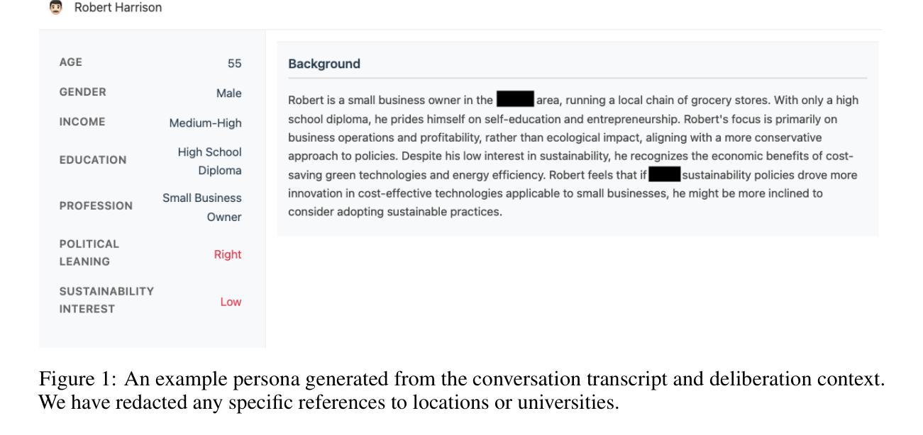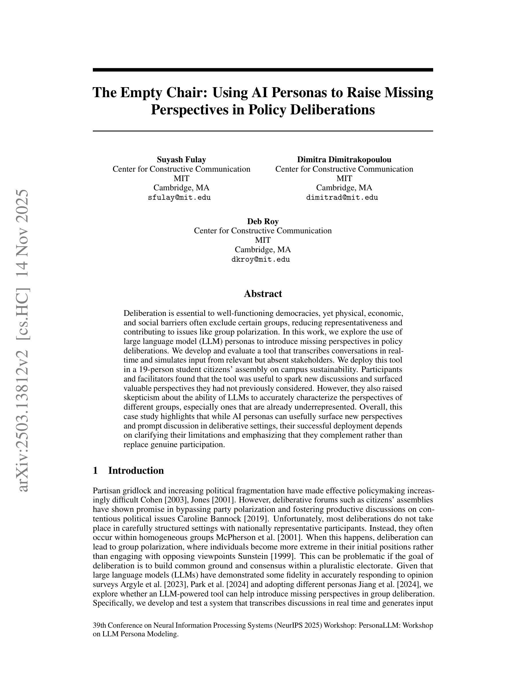 审议在民主社会中扮演着至关重要的角色,但由于物理、经济和社会方面的障碍,某些群体常常被排除在外,这不仅降低了代表性,还引发了群体极化等问题。在这项工作中,我们探索使用大型语言模型(LLM)人格来为政策审议引入缺失的观点。我们开发并评估了一种工具,该工具能够实时转录对话,并模拟来自相关但缺席的利益相关者的输入。我们在校园可持续性问题的19名学生公民大会上使用了这一工具。参与者和协调员发现该工具对于激发新讨论和揭示他们之前没有考虑到的有价值的观点非常有用。然而,他们也提出了对LLM准确刻画不同群体观点能力的怀疑,尤其是对那些已经代表性不足的群体。总体而言,这个案例研究突出了虽然人工智能人格有助于揭示新的观点并促进讨论,但其成功部署取决于明确其局限性,并强调它们只是作为真正参与的补充,而不是替代。