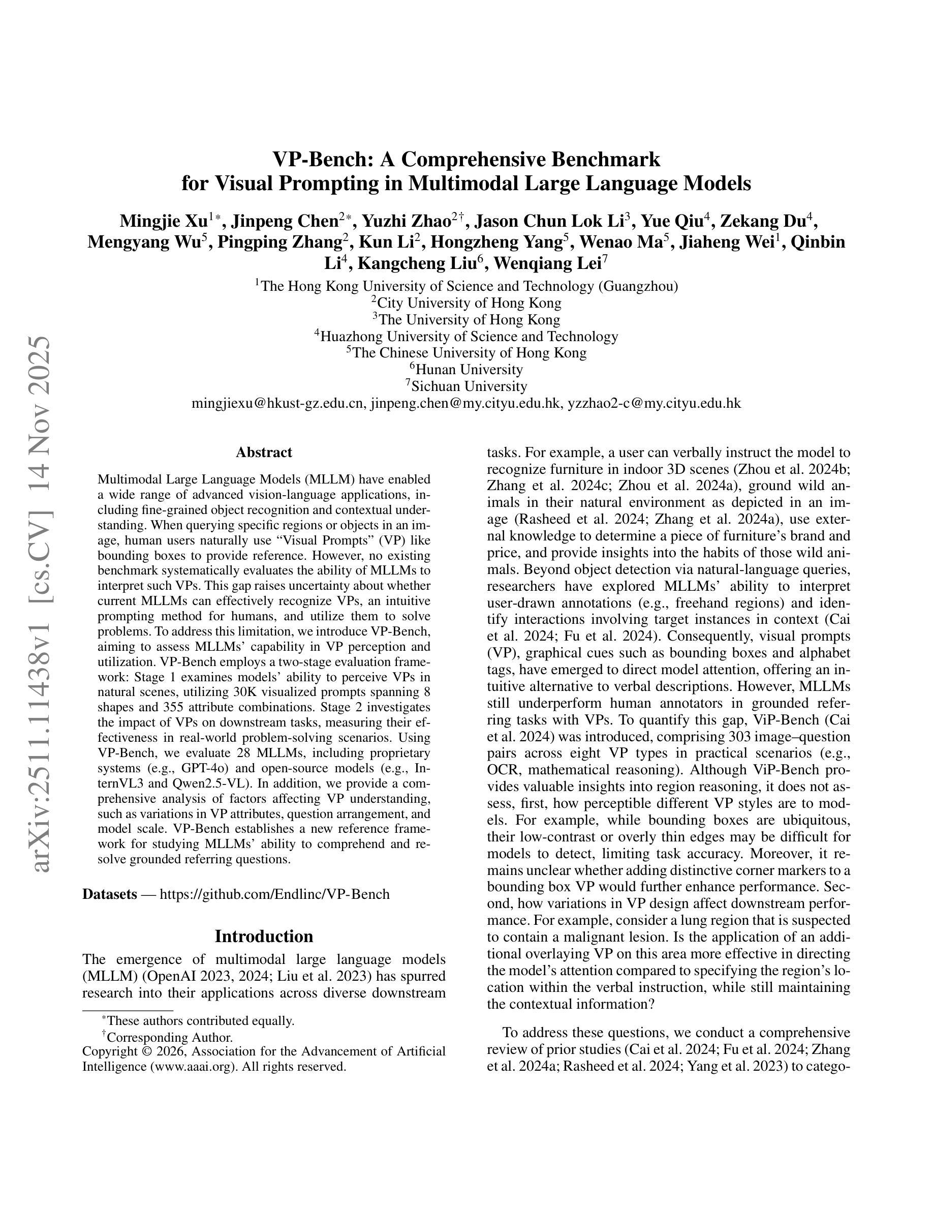 本文介绍了多模态大型语言模型(MLLMs)在视觉语言应用方面的能力,特别是通过视觉提示(VPs)来识别图像中的特定区域或对象的能力。现有的基准测试并未系统地评估MLLMs解读VPs的能力,为此本文引入了VP-Bench基准测试来评估MLLMs对VPs的感知和利用能力。VP-Bench采用两阶段评估框架,第一阶段考察模型在自然场景中感知VPs的能力,第二阶段研究VPs对下游任务的影响,衡量其在解决实际问题场景中的有效性。通过VP-Bench评估了多个MLLMs的性能,并分析了影响VP理解的因素。VP-Bench为MLLMs如何理解和解决基于视觉提示的问题提供了新的参考框架。
