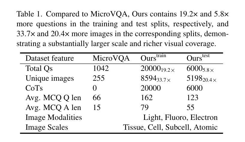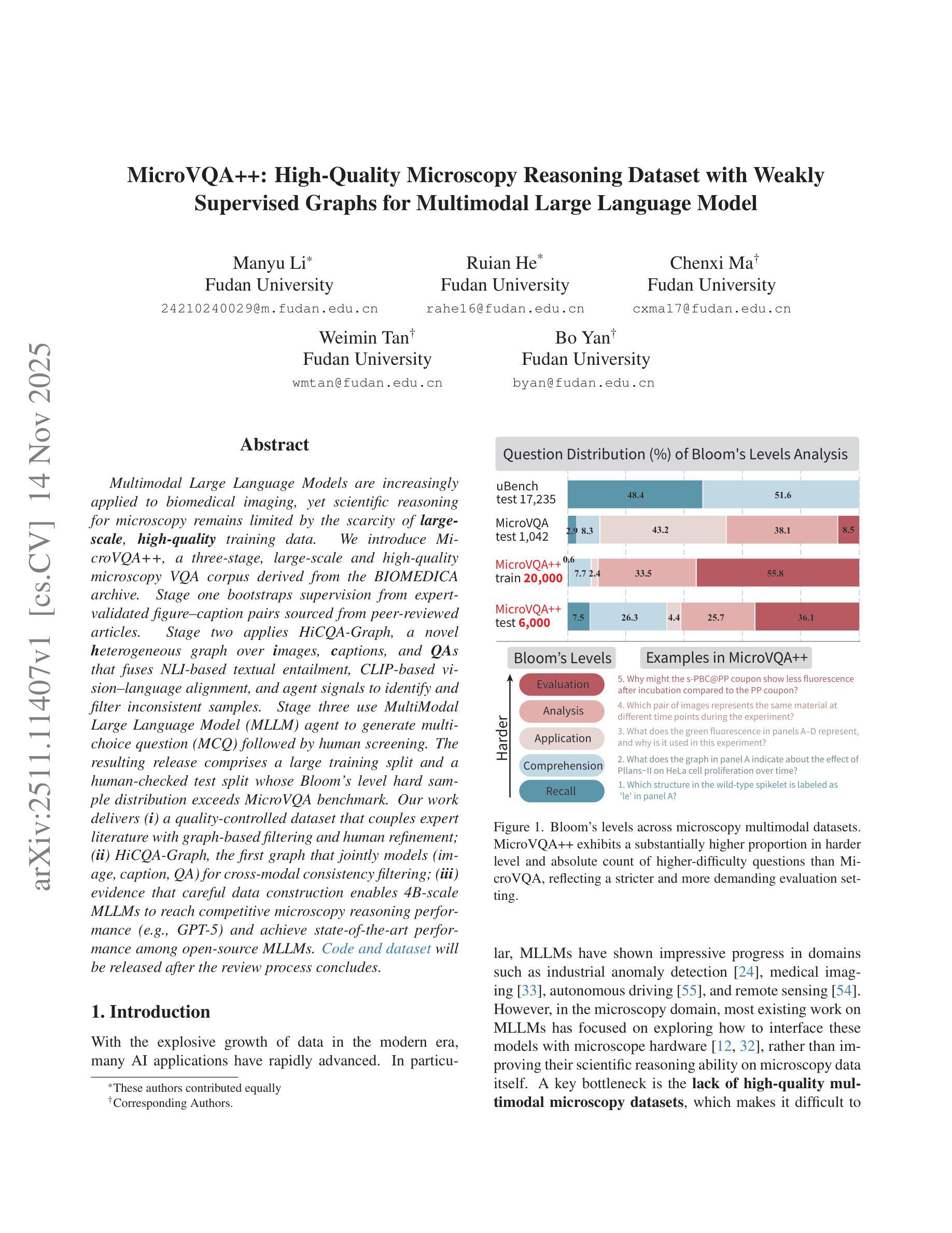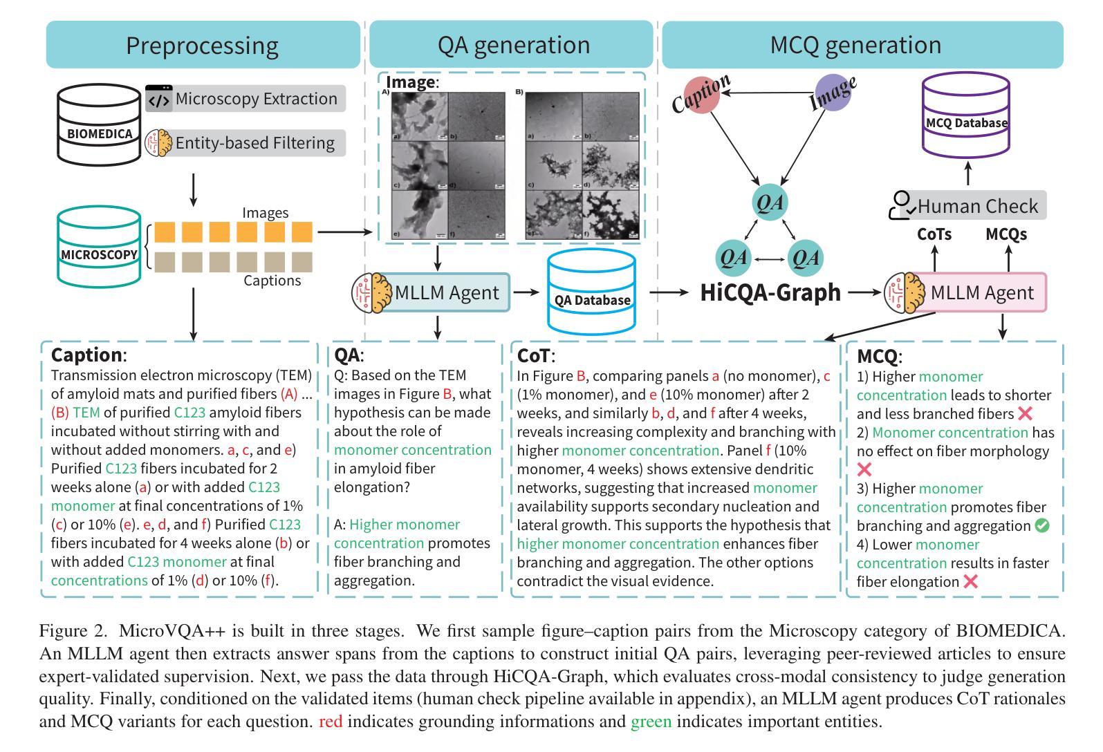 多模态大型语言模型在生物医学成像方面的应用日益广泛,但由于缺乏大规模高质量的训练数据,显微镜的科学推理仍然受到限制。我们推出了MicroVQA++,这是一个三阶段、大规模、高质量的显微镜VQA语料库,来源于BIOMEDICA档案。第一阶段从经过同行评审的文章中采集的专家验证过的图像-标题对中获取监督信息。第二阶段应用了HiCQA-Graph,这是一种基于图像、标题和问答的新型异构图,融合了基于自然语言推断的文本蕴含、基于CLIP的视觉语言对齐和代理信号,以识别和过滤不一致的样本。第三阶段使用多模态大型语言模型(MLLM)代理生成多项选择题(MCQ),随后进行人工筛选。最终发布的数据集包括一个大规模的训练集和一个经过人工检查过的测试集,其Bloom’s难度样本分布超过了MicroVQA基准测试。我们的工作提供了(i)一个经过质量控制的数据集,该数据集结合了专家文献、基于图的过滤和人工改进;(ii)首个联合建模(图像、标题、问答)的HiCQA-Graph,用于跨模态一致性过滤;(iii)证据表明,通过精心构建的数据,可以使4B规模的多模态大型语言模型达到具有竞争力的显微镜推理性能(例如GPT-5),并在开源多模态大型语言模型中达到最新水平。代码和数据集将在审查过程结束后发布。