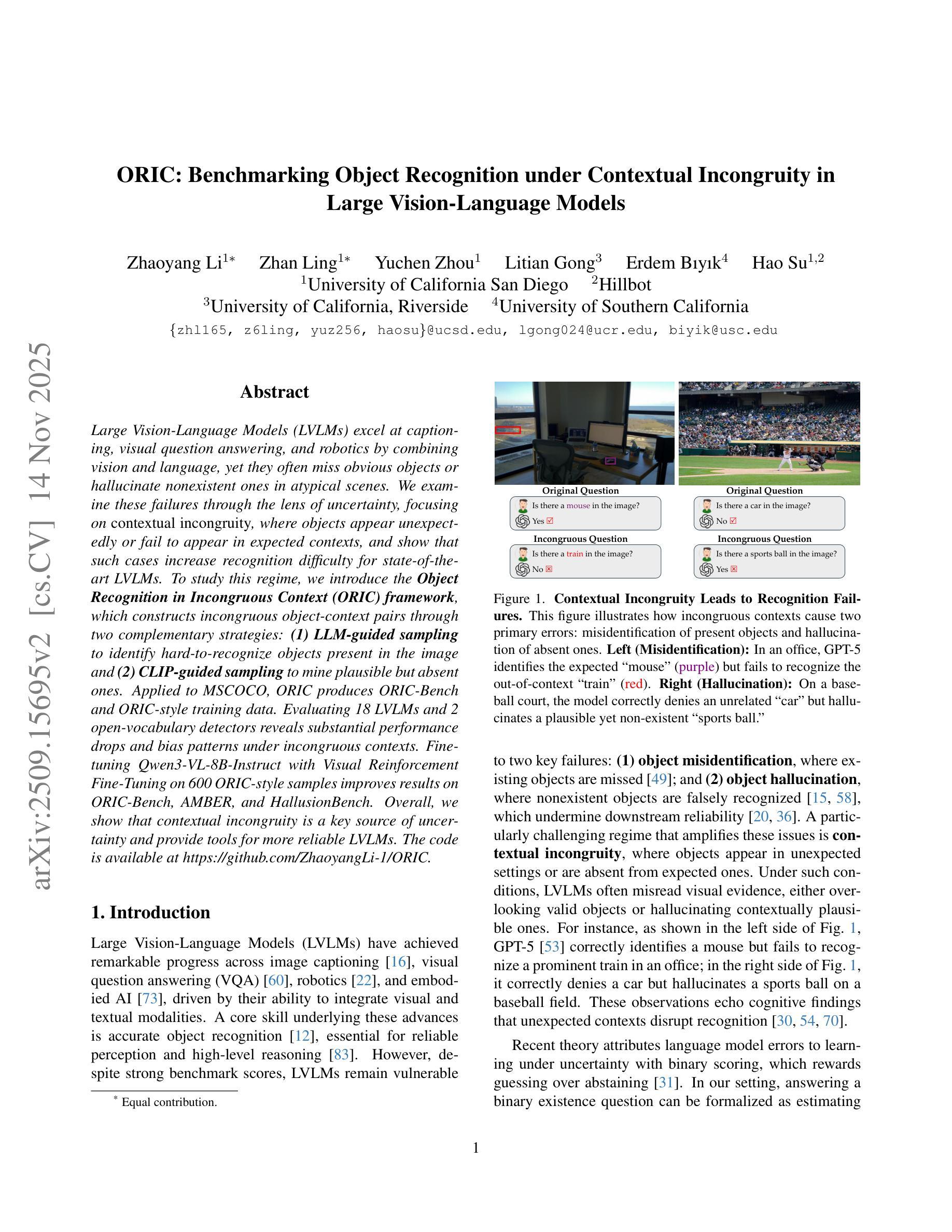 大型视觉语言模型(LVLM)在图像描述、视觉问答和机器人技术等领域表现出色,但它们在处理非典型场景时,往往会忽略明显物体或幻想出不存在的物体。本研究从不确定性的角度审视这些失败案例,重点关注上下文的不一致性,即物体在预期之外出现或在预期语境中缺失,并表明这种情况增加了对最新LVLM的识别难度。为了研究这一领域,我们引入了Object Recognition in Incongruous Context(ORIC)框架,它通过两种互补策略构建不一致的物体上下文对:(1)LLM引导采样识别图像中难以识别的物体;(2)CLIP引导采样挖掘可能但不存在的物体。应用于MSCOCO数据集时,ORIC产生了ORIC-Bench和ORIC风格训练数据。对18个LVLM和2个开放词汇检测器的评估显示,在不一致的语境下,性能大幅下降且存在偏见模式。使用Visual Reinforcement Fine-Tuning对Qwen3-VL-8B-Instruct进行微调,在600个ORIC风格样本上改进了其在ORIC-Bench、AMBER和HallusionBench上的结果。总体而言,我们证明了上下文不一致性是关键的不确定性来源,并为更可靠的LVLM提供了工具。相关代码可通过https://github.com/ZhaoyangLi-1/ORIC获取。