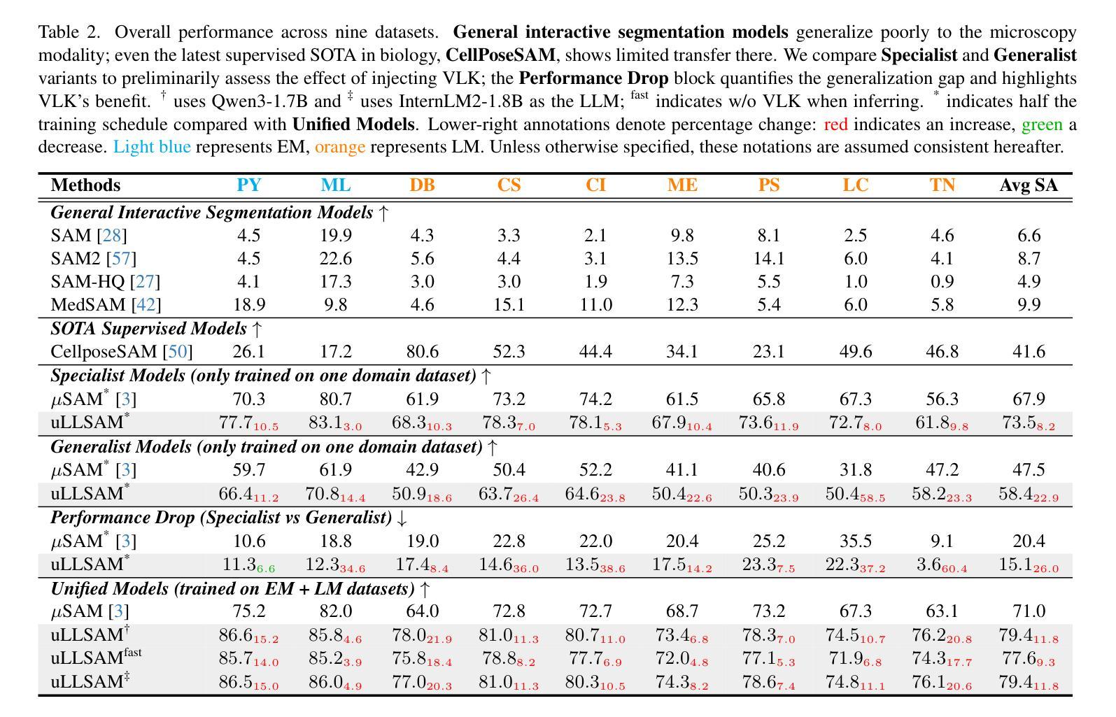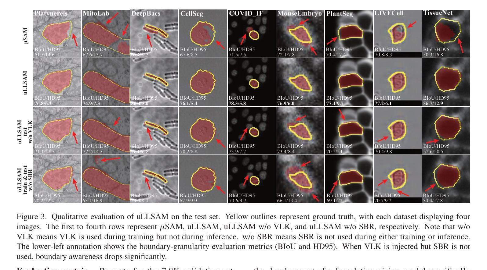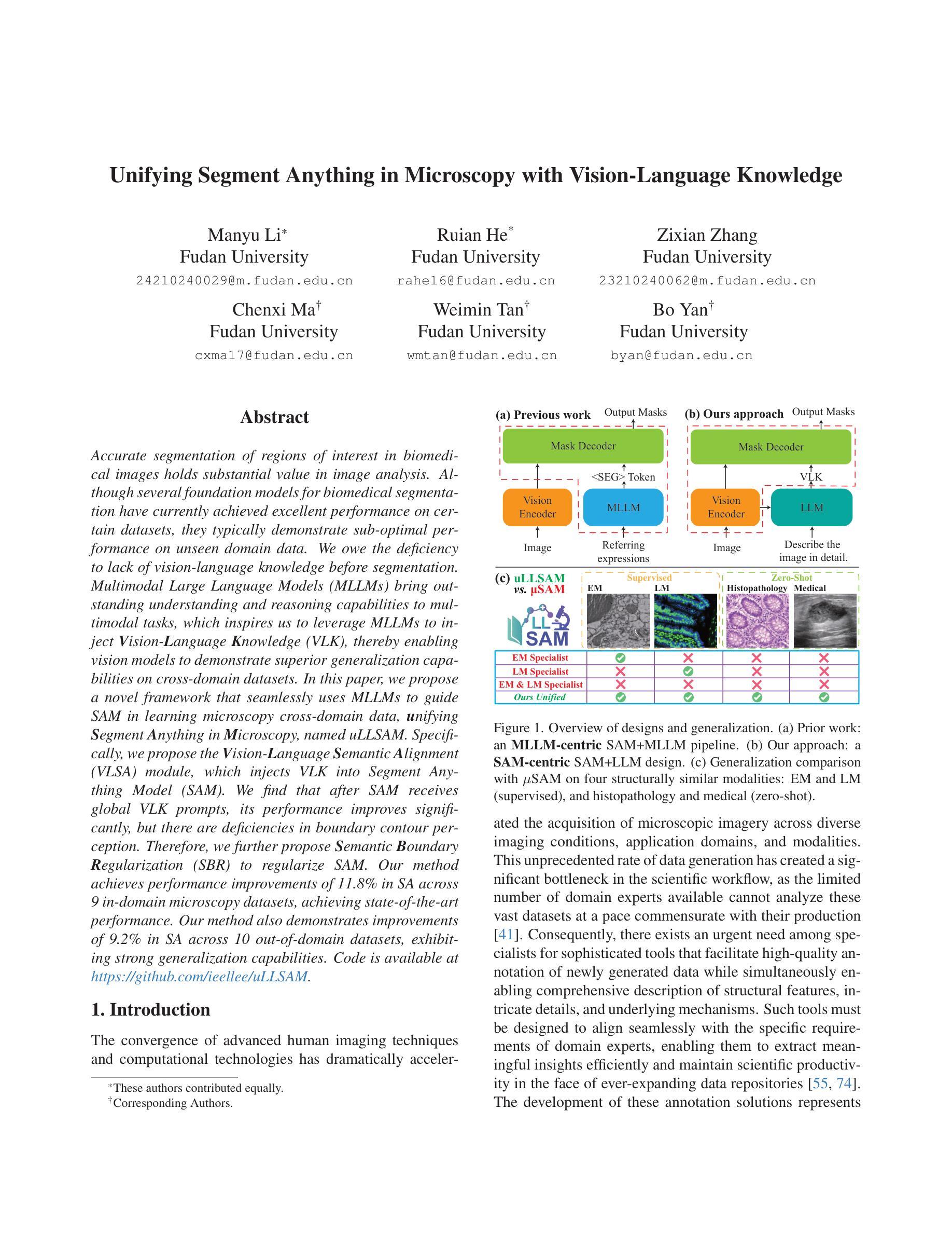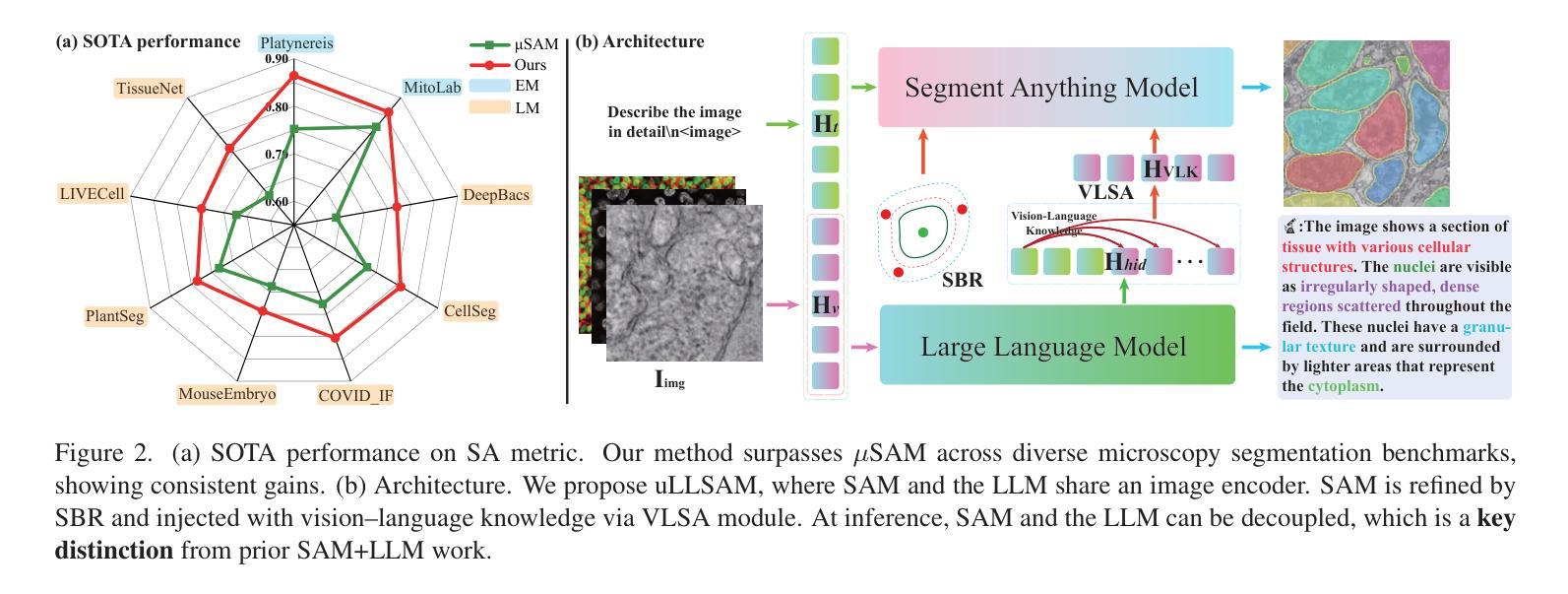 基于生物医学图像的区域精准分割在图像分析中具有重要价值。当前的一些基础模型在某些数据集上表现优秀,但在未见域数据上的表现通常不佳。这主要是由于分割前缺乏视觉语言知识。多模态大型语言模型(MLLMs)为跨模态任务带来了卓越的理解和推理能力,这激发我们利用MLLMs注入视觉语言知识(VLK),使视觉模型在跨域数据集上表现出更出色的泛化能力。本文提出一种新颖框架uLLSAM,无缝利用MLLMs引导SAM学习显微镜跨域数据,统一显微分割任务。通过VLSA模块注入VLK到SAM中。研究发现,SAM接受全局VLK提示后性能显著提升,但在边界轮廓感知方面存在不足。因此,进一步提出语义边界正则化(SBR)以优化SAM。该方法在9个同域显微镜数据集上的分割精度提高了11.8%,达到最新性能水平;在10个跨域数据集上的分割精度也提高了9.2%,展现出强大的泛化能力。