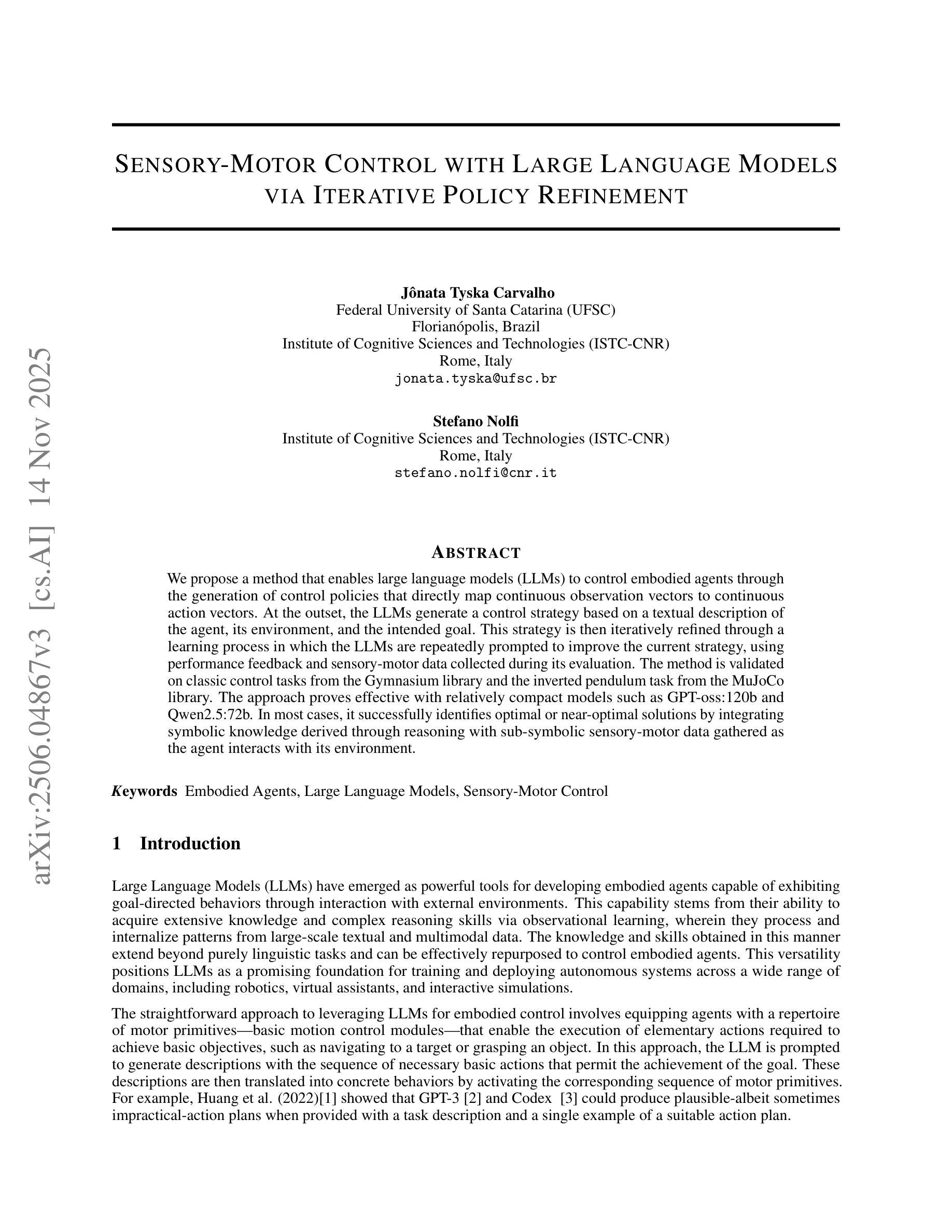 本文提出了一种方法,通过生成连续观测向量到连续动作向量的控制策略,使大型语言模型(LLM)能够控制实体代理。LLM基于代理的文本描述、环境和目标生成初始控制策略,然后通过学习过程不断提示改进当前策略,使用性能反馈和收集到的感觉运动数据进行评价。该方法在Gymnasium库的经典控制任务和MuJoCo库的倒立摆任务中得到了验证。使用相对紧凑的模型(如GPT-oss:120b和Qwen2.5:72b)即可实现有效证明。该方法成功地将符号知识推理与代理与环境的交互过程中收集的感觉运动数据相结合,找出最优或接近最优的解决方案。